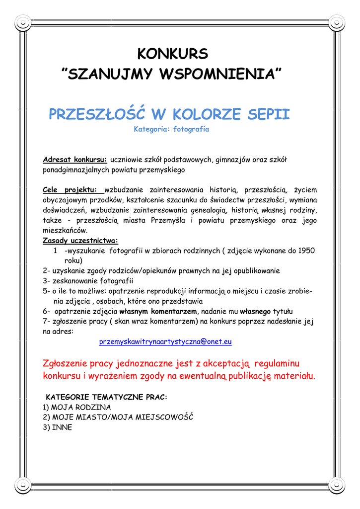KONKURS ”SZANUJMY WSPOMNIENIA” PRZESZŁOŚĆ W KOLORZE SEPII Kategoria: fotografia Adresat konkursu: uczniowie szkół podstawowych, gimnazjów oraz szkół ponadgimnazjalnych powiatu przemyskiego Cele projektu: wzbudzanie zainteresowania historią, przeszłością, życiem obyczajowym przodków, kształcenie szacunku do świadectw przeszłości, wymiana doświadczeń, wzbudzanie zainteresowania genealogią, historią własnej rodziny, także - przeszłością miasta Przemyśla i powiatu przemyskiego oraz jego mieszkańców. Zasady uczestnictwa: 1 -wyszukanie fotografii w zbiorach rodzinnych ( zdjęcie wykonane do 1950 roku) 2- uzyskanie zgody rodziców/opiekunów prawnych na jej opublikowanie 3- zeskanowanie fotografii 5- o ile to możliwe: opatrzenie reprodukcji informacją o miejscu i czasie zrobienia zdjęcia , osobach, które ono przedstawia 6- opatrzenie zdjęcia własnym komentarzem, nadanie mu własnego tytułu 7- zgłoszenie pracy ( skan wraz komentarzem) na konkurs poprzez nadesłanie jej na adres: [email protected] Zgłoszenie pracy jednoznaczne jest z akceptacją regulaminu konkursu i wyrażeniem zgody na ewentualną publikację materiału. KATEGORIE TEMATYCZNE PRAC: 1) MOJA RODZINA 2) MOJE MIASTO/MOJA MIEJSCOWOŚĆ 3) INNE Dodatkowe uwagi: - Podczas oceny brane będą pod uwagę: oryginalność komentarza, trafność komentarza, jakość wykonanego skanu - Osoba biorąca udział w konkursie może zgłosić 1- 3 prac - Do nadesłanej pracy należy dołączyć informacje o uczestniku konkursu: Imię , nazwisko i wiek uczestnika Nazwa i adres szkoły, klasa Imię i nazwisko opiekuna - W konkursie biorą udział jedynie prace opatrzone komentarzem WSPOMNIENIA RODZINNE Kategoria: literatura CELE: promocja kultury regionu, inspirowanie do poznawania i dokumentowania historii, szczególnie – historii własnych przodków, własnej rodziny, wzbudzanie szacunku dla osób starszych, pobudzanie do refleksji dotyczącej ich roli w życiu rodziny pobudzanie do refleksji dotyczącej dawnych i współczesnych obyczajów związanych nie tylko ze świętami o charakterze religijnym czy narodowym, ale też prywatnym, rodzinnym wykorzystanie dialogu międzypokoleniowego jako źródła pozyskiwania informacji ZASADY UCZESTNICTWA: uczestnik konkursu 1) przeprowadza rozmowę z najstarszymi /szym członkami/kiem rodziny, ewentualnie - innymi osobami związanymi z rodziną, pamiętającymi jej dzieje 2) przygotowuje zapis przeprowadzonej rozmowy w dowolnej formie ( opowiada nie, wywiad, reportaż, sprawozdanie i inne ) 3) do pracy dołącza (o ile to możliwe) materiały dodatkowe ( zapis mp3, nagranie dvd, fotografia osoby , z którą przeprowadzono rozmowę) 4) wysyła mail na adres [email protected] dołączając do niego następujące informacje : Imię , nazwisko i wiek uczestnika Nazwa i adres szkoły, klasa Imię i nazwisko opiekuna Jeśli to możliwe: imię i nazwisko osoby, z którą przeprowadzono wywiad Objętość prac: ok. 2 stron maszynopisu ------------------------------------------------------------------------------------------ Termin nadsyłania prac 10 marca 2016 - Ogłoszenie wyników kwiecień 2016 - Osoby wyróżnione zostaną poinformowane o wynikach konkursu (także o terminie i miejscu wręczenia nagród) drogą e-mailową - Wysłanie prac na adres [email protected] jest jednoznaczne z wyrażeniem zgody na ich nieodpłatną publikację jak i umieszczanie reprodukcji prac w prasie oraz innych materiałach, publikacjach i ekspozycjach związanych z konkursem -Wysłanie pracy na wskazany adres równoznaczne jest z wyrażeniem zgody na przetwarzanie (cele związane z konkursem) danych osobowych i nadesłanego materiału. - Wysłanie pracy na adres WITRYNY jest jednoznaczne z oświadczeniem autora, iż przysługują mu do niej majątkowe prawa autorskie oraz oświadczeniem, że prace nie naruszają osobistych i majątkowych praw autorskich osób trze cich. - Wszelkie dodatkowe informacje : Alicja Pietraszkiewicz [email protected] Historia konkursu : Pierwsza edycja odbyła się roku 2009. Był to konkurs fotograficzny zatytułowany „Przeszłość w kolorze sepii”. Przeprowadzony został jako część projektu zrealizowanego w ramach stypendium twórczego przyznanego Alicji Pietraszkiewicz przez Prezydenta Miasta Przemyśla w kategorii „upowszechnianie i ochrona dóbr kultury”. Współorganizatorem i fundatorem nagród były: Przemyskie Centrum Kultury i Nauki „ZAMEK” oraz Muzeum Narodowe Ziemi Przemyskiej. Obie instytucje pełniły również funkcję patrona honorowego projektu. Druga edycja odbyła się w roku 2015. Jej organizatorem było Niepubliczne Gimnazjum „MORAWA” Stowarzyszenia Absolwentów II LO im. prof. K. Morawskiego w Przemyślu. Przedsięwzięcie zostało poszerzone. Konkurs fotograficzny „Przeszłość w kolorze sepii” wzbogacono o kategorię literacką. Uczestnicy projektów zyskali więc sposobność, by nie tylko zagłębić się w domowe archiwa, ale też zainicjować dialog z seniorami rodów i lepiej poznać historię własnej rodziny. Konkursy - fotograficzny i literacki - zrealizowano pod wspólnym hasłem „Szanujmy wspomnienia”.