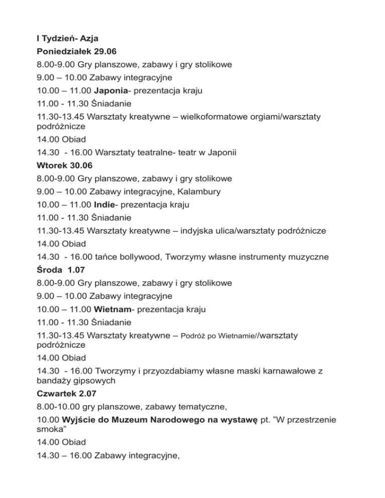 I Tydzień- Azja Poniedziałek 29.06 8.00-9.00 Gry planszowe, zabawy i gry stolikowe 9.00 – 10.00 Zabawy integracyjne 10.00 – 11.00 Japonia- prezentacja kraju 11.00 - 11.30 Śniadanie 11.30-13.45 Warsztaty kreatywne – wielkoformatowe orgiami/warsztaty podróżnicze 14.00 Obiad 14.30 - 16.00 Warsztaty teatralne- teatr w Japonii Wtorek 30.06 8.00-9.00 Gry planszowe, zabawy i gry stolikowe 9.00 – 10.00 Zabawy integracyjne, Kalambury 10.00 – 11.00 Indie- prezentacja kraju 11.00 - 11.30 Śniadanie 11.30-13.45 Warsztaty kreatywne – indyjska ulica/warsztaty podróżnicze 14.00 Obiad 14.30 - 16.00 tańce bollywood, Tworzymy własne instrumenty muzyczne Środa 1.07 8.00-9.00 Gry planszowe, zabawy i gry stolikowe 9.00 – 10.00 Zabawy integracyjne 10.00 – 11.00 Wietnam- prezentacja kraju 11.00 - 11.30 Śniadanie 11.30-13.45 Warsztaty kreatywne – Podróż po Wietnamie//warsztaty podróżnicze 14.00 Obiad 14.30 - 16.00 Tworzymy i przyozdabiamy własne maski karnawałowe z bandaży gipsowych Czwartek 2.07 8.00-10.00 gry planszowe, zabawy tematyczne, 10.00 Wyjście do Muzeum Narodowego na wystawę pt. ”W przestrzenie smoka” 14.00 Obiad 14.30 – 16.00 Zabawy integracyjne, Piątek 3.07 8.00-9.00 Gry planszowe, zabawy i gry stolikowe 9.00 – 10.00 Zabawy integracyjne 10.00 – 11.00 Chiny- prezentacja kraju 11.00 - 11.30 Śniadanie 11.30-13.45 Gra terenowa strategiczna 14.00 Obiad 14.30 - 16.00 Warsztaty kreatywne – chiński smok/ II Tydzień- Afryka Poniedziałek 6.07 8.00-9.00 Gry planszowe, zabawy i gry stolikowe 9.00 – 10.00 Zabawy integracyjne 10.00 – 11.00 Afryka- prezentacja krajów 11.00 - 11.30 Śniadanie 11.30-13.45 Warsztaty kreatywne – wielka mapa Afryki/warsztaty podróżnicze- stworzenie wielkoformatowej gry 14.00 Obiad 14.30 - 16.00 Warsztaty kreatywne – wielka mapa Afryki/warsztaty podróżnicze Warsztaty tańca afrykańskiego, tworzenie masek afrykańskich Wtorek 7.07 8.00-10.00 Zabawy integracyjne, gry planszowe, zabawy tematyczne, 10.00 Wyjście do Muzeum Archeologicznego na wystawę pt.” Starożytny Egipt” 14.00 Obiad 14.30 Zabawy i gry stolikowe Środa 8.07 8.00-9.00 Gry planszowe, zabawy i gry stolikowe 9.00 – 10.00 Zabawy integracyjne 10.00 – 11.00 Egipt- prezentacja krajów 11.00 - 11.30 Śniadanie 11.30-13.45 Warsztaty kreatywne – w Królestwie Tutanchamona/warsztaty podróżnicze 14.00 Obiad 14.30 - 16.00 Warsztaty kreatywne – tworzenie starożytnych piramid Czwartek 9.07 8.00-9.00 Gry planszowe, zabawy i gry stolikowe 9.00 – 10.00 Zabawy integracyjne 10.00 – 11.00 Afrykańska Gra wielkoformatowa 11.00 - 11.30 Śniadanie 11.30-13.45 Warsztaty kreatywne –Afrykańskie Maski/ warsztaty podróżnicze 14.00 Obiad 14.30 - 16.00 Warsztaty kreatywne –Afrykańskie Maski/ warsztaty podróżnicze Piątek 10.07 8.00-9.00 Gry planszowe, zabawy i gry stolikowe 9.00 – 10.00 Zabawy integracyjne 10.00 – 11.00 Wynalazki świata arabsko - muzułmańskiego 11.00 - 11.30 Śniadanie 11.30-13.45 Warsztaty kreatywne –laboratorium arabeskowego Wynalazcy/ warsztaty podróżnicze 14.00 Obiad 14.30 - 16.00 Warsztaty muzyczne 17.00-19.00 Gala „80dni dookoła świata” występy uczestników III Tydzień- Ameryki Poniedziałek 13.07 8.00-9.00 Gry planszowe, zabawy i gry stolikowe 9.00 – 10.00 Zabawy integracyjne i gra w poszukiwaniu skarbów INKÓW 10.00 – 11.00 Majowie Aztekowie i Inkowie 11.00 - 11.30 Śniadanie 11.30-13.45 Warsztaty kreatywne –Świat ze Złota do którego prowadzą tajemnicze znaki / warsztaty podróżnicze 14.00 Obiad 14.30 - 16.00 Warsztaty kreatywne –Świat ze Złota do którego prowadzą tajemnicze znaki / warsztaty podróżnicze Wtorek 14.07 8.00-9.00 Gry planszowe, zabawy i gry stolikowe 9.00 – 10.00 Zabawy integracyjne, Przygotowujemy słuchowisko, akt I przedstawienia dla dorosłych 10.00 – 11.00 Indianie Ameryki Łacińskiej 11.00 - 11.30 Śniadanie 11.30-13.45 Warsztaty kreatywne –Ukryte światy / warsztaty podróżnicze 14.00 Obiad 14.30 - 16.00 Warsztaty kreatywne – Ukryte światy / warsztaty podróżnicze Środa 15.07 8.00-9.00 Gry planszowe, zabawy i gry stolikowe 9.00 – 10.00 Zabawy integracyjne 10.00 – 11.00 Meksyk 11.00 - 11.30 Śniadanie 11.30-13.45 Warsztaty kreatywne –Maski Meksyku i Dominikany / warsztaty podróżnicze 14.00 Obiad 14.30 - 16.00 Warsztaty kreatywne –Robimy własne koszulki Czwartek 16.07 8.00-9.00 Gry planszowe, zabawy i gry stolikowe 9.00 – 10.00 Zabawy integracyjne 10.00 – 11.00 Brazylia 11.00 - 11.30 Śniadanie 11.30-13.45 Warsztaty kreatywne –Rio / warsztaty podróżnicze 14.00 Obiad 14.30 - 16.00 Warsztaty taneczne – gorące rytmy Karnawał w RIO Piątek 17.07 8.00-9.00 Gry planszowe, zabawy i gry stolikowe 9.00 – 10.00 Turniej sportowy 10.00 – 11.00 Tajemnice Pustyni Nasca 11.00 - 11.30 Śniadanie 11.30-13.45 Warsztaty kreatywne –Land Art / warsztaty podróżnicze 14.00 Obiad 14.30 - 16.00 Warsztaty kreatywne – tworzenie własnych pustynnych instrumentów muzycznych IV Tydzień Europa Poniedziałek 20.07 8.00-9.00 Gry planszowe, zabawy i gry stolikowe 9.00 – 10.00 Zabawy integracyjne, sportowe rozgrywki mistrzostw Mydlnik 10.00 – 11.00 Anglia 11.00 - 11.30 Śniadanie 11.30-13.45 Warsztaty kreatywne – Gdzie podział się Ogórek? - Zagadka Sherloc’a Holms’a / warsztaty detektywistyczne i logiczne zagadki 14.00 Obiad 14.30 - 16.00 Warsztaty kreatywne – Gdzie podział się Ogórek? - Zagadka Sherloc’a Holms’a / warsztaty podróżnicze Wtorek 21.07 8.00-9.00 Gry planszowe, zabawy i gry stolikowe 9.00 – 10.00 Zabawy integracyjne 10.00 – 11.00 Grecja 11.00 - 11.30 Śniadanie 11.30-13.45 Warsztaty kreatywne –W świecie greckiej sztuki/ warsztaty podróżnicze 14.00 Obiad 14.30 - 16.00 Warsztaty malarskie i rysunku Środa 22.07 8.00-9.00 Gry planszowe, zabawy i gry stolikowe 9.00 – 10.00 Zabawy integracyjne 10.00 – 11.00 Włochy 11.00 - 11.30 Śniadanie 11.30-13.45 Warsztaty kreatywne –Na ratunek krzywej wieży/ warsztaty podró