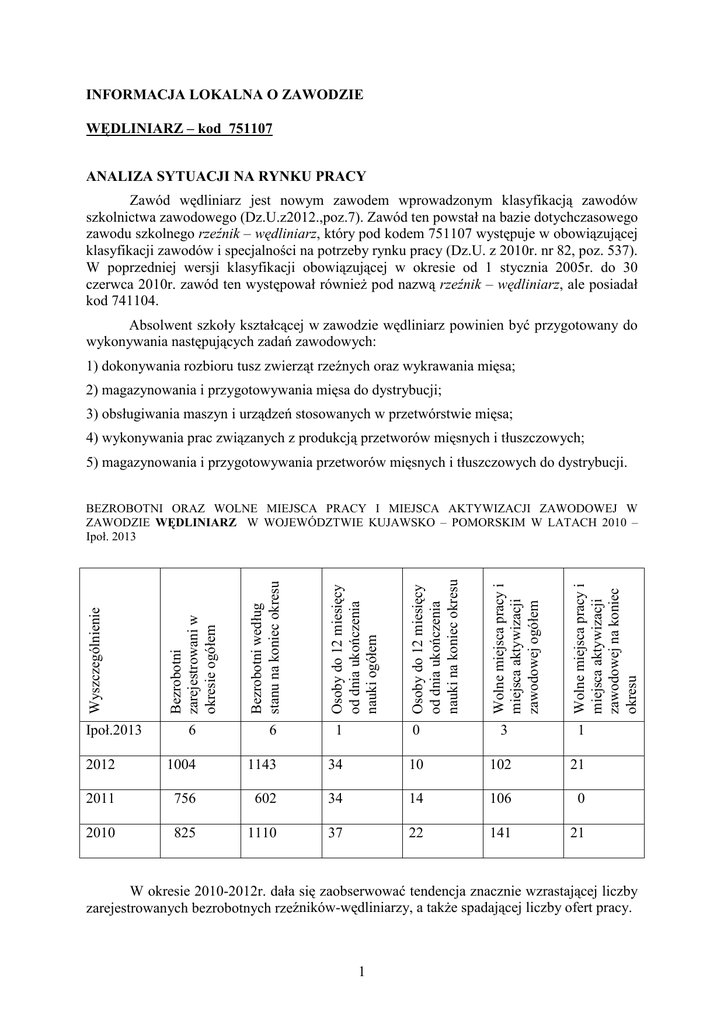 INFORMACJA LOKALNA O ZAWODZIE WĘDLINIARZ – kod 751107 ANALIZA SYTUACJI NA RYNKU PRACY Zawód wędliniarz jest nowym zawodem wprowadzonym klasyfikacją zawodów szkolnictwa zawodowego (Dz.U.z2012.,poz.7). Zawód ten powstał na bazie dotychczasowego zawodu szkolnego rzeźnik – wędliniarz, który pod kodem 751107 występuje w obowiązującej klasyfikacji zawodów i specjalności na potrzeby rynku pracy (Dz.U. z 2010r. nr 82, poz. 537). W poprzedniej wersji klasyfikacji obowiązującej w okresie od 1 stycznia 2005r. do 30 czerwca 2010r. zawód ten występował równieŜ pod nazwą rzeźnik – wędliniarz, ale posiadał kod 741104. Absolwent szkoły kształcącej w zawodzie wędliniarz powinien być przygotowany do wykonywania następujących zadań zawodowych: 1) dokonywania rozbioru tusz zwierząt rzeźnych oraz wykrawania mięsa; 2) magazynowania i przygotowywania mięsa do dystrybucji; 3) obsługiwania maszyn i urządzeń stosowanych w przetwórstwie mięsa; 4) wykonywania prac związanych z produkcją przetworów mięsnych i tłuszczowych; 5) magazynowania i przygotowywania przetworów mięsnych i tłuszczowych do dystrybucji. 3 1 2012 1004 1143 34 10 102 21 2011 756 602 34 14 106 0 2010 825 1110 37 22 141 21 Wolne miejsca pracy i miejsca aktywizacji zawodowej na koniec okresu 0 Wolne miejsca pracy i miejsca aktywizacji zawodowej ogółem Osoby do 12 miesięcy od dnia ukończenia nauki na koniec okresu 1 Bezrobotni według stanu na koniec okresu 6 Ipoł.2013 Bezrobotni zarejestrowani w okresie ogółem 6 Wyszczególnienie Osoby do 12 miesięcy od dnia ukończenia nauki ogółem BEZROBOTNI ORAZ WOLNE MIEJSCA PRACY I MIEJSCA AKTYWIZACJI ZAWODOWEJ W ZAWODZIE WĘDLINIARZ W WOJEWÓDZTWIE KUJAWSKO – POMORSKIM W LATACH 2010 – Ipoł. 2013 W okresie 2010-2012r. dała się zaobserwować tendencja znacznie wzrastającej liczby zarejestrowanych bezrobotnych rzeźników-wędliniarzy, a takŜe spadającej liczby ofert pracy. 1 Większa liczba nowych rejestracji bezrobotnych niŜ zgłoszonych wolnych miejsc pracy lub aktywizacji zawodowej spowodowała, Ŝe w 2012, 2011 i 2010r. zawód ten został sklasyfikowany jako zawód nadwyŜkowy1. WYNIKI BADANIA PRACODAWCÓW 2 W 2013r. pracodawcy planowali zatrudnić 12 osób z zawodem rzeźnik-wędliniarz. Pracodawcy ze śnina, chcieli zatrudnić 10 osób, powodem zatrudnienia był wzrost popytu na produkty i usługi. Pracodawcy ze Świecie chcieli zatrudnić 2 osoby, ze względu na rozwój firmy. Pracodawcy nie planowali zwolnień rzeźników-wędliniarzy. Z badań przeprowadzonych wśród pracodawców w 2013r., wynika, iŜ zawód rzeźnik wędliniarz pojawił się w pięcioletniej perspektywie zapotrzebowania na zawody tj. do 2018r. W 2012r. pracodawcy planowali zwolnić 9 osób z zawodem rzeźnik –wędliniarz, a zatrudnić chcieli 7 osób z tym zawodem. Byli to pracodawcy w Grudziądzu, Świecia oraz w śninie. Powodem planów zatrudnienia przez nich rzeźników-wędliniarzy był rozwój firmy, zatrudnienie sezonowe, wzrost popytu na produkty i usługi oraz polepszenie sytuacji finansowej firmy. ANALIZA KSZTAŁCENIA W ZAWODZIE, OFERTA KSZTAŁCENIA – SYSTEM OŚWIATY SZKOLNEJ I POZASZKOLNEJ 3 Powołując się na §2 Rozporządzenia Ministra Edukacji Narodowej z dnia 23 grudnia 2011r. w sprawie klasyfikacji zawodów szkolnictwa zawodowego, które weszło w Ŝycie z dn. 1 września 2012r. „Na rok szkolny 2012/2013 nie prowadzi się rekrutacji kandydatów do klasy pierwszej (semestr I) szkół prowadzących kształcenie w zawodach: rzeźnik-wędliniarz”. Od 01.09.2012 r. zawód ten funkcjonuje w klasyfikacji zawodów szkolnictwa zawodowego pod nazwą wędliniarz i moŜna go zdobyć poprzez naukę w zasadniczej szkole zawodowej oraz na kwalifikacyjnych kursach zawodowych. Dla zawodu wędliniarz wyodrębniono jedną kwalifikację – produkcja przetworów mięsnych i tłuszczowych. Kwalifikacyjny kurs zawodowy to kurs prowadzony według programu nauczania uwzględniającego podstawę programową kształcenia w zawodach w zakresie jednej kwalifikacji. Minimalna liczba godzin kształcenia na tym kursie jest równa minimalnej liczbie 1 Podziału na zawody deficytowe, zrównowaŜone i nadwyŜkowe dokonuje się na podstawie wskaźnika intensywności nadwyŜki (deficytu) wyraŜonego jako iloraz liczby zgłoszonych wolnych miejsc pracy i miejsc aktywizacji zawodowej w badanym okresie, w danym zawodzie i liczby zarejestrowanych bezrobotnych w badanym okresie, w danym zawodzie. Zawody deficytowe to takie, dla których wskaźnik przekracza wartość 1,1; zawody zrównowaŜone to te, dla których wartość wskaźnika mieści się w przedziale od 0,9 do 1,1; natomiast zawody nadwyŜkowe to te, w których przypadku wskaźnik wynosi poniŜej 0,9. W 2011 r. 77,9% wszystkich zawodów, którymi legitymowali się bezrobotni lub zgłoszono w nich wolne miejsca pracy i miejsca aktywizacji zawodowej zostały sklasyfikowane jako nadwyŜkowe. Zawody deficytowe stanowiły 17,9% zawodów a zrównowaŜone 4,2%. 2 Badanie 2000 pracodawców jest realizowane w ramach projektu WUP Rynek Pracy pod Lupą. Raport z badania pracodawców w 2010r. znajduje się na stronie internetowej WUP, a za 2011, 2012 i 2013r. dodatkowo na stronie www.podlupa.wup.torun.pl 3 Źródło informacji: rozporządzenie Ministra Edukacji Narodowej z dnia 23 grudnia 2011 r. w sprawie klasyfikacji zawodów szkolnictwa zawodowego, serwis internetowy Ministerstwa Edukacji Narodowej www.men.gov.pl oraz System Informacji Oświatowej www.cie.men.gov.pl 2 godzin kształcenia zawodowego określonej w podstawie programowej kształcenia w zawodach dla danej kwalifikacji. W ramach róŜnych zawodów wyodrębniono poszczególne kwalifikacje, z których kaŜda obejmuje określony zasób wiedzy, umiejętności zawodowych oraz kompetencji personalnych i społecznych, opisanych w podstawie programowej kształcenia w zawodach. Podmiot prowadzący kwalifikacyjny kurs zawodowy jest obowiązany uwzględnić w realizowanym n