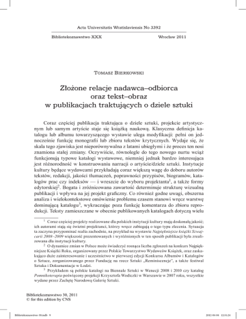 Acta Universitatis Wratislaviensis No 3392 Bibliotekoznawstwo XXX Wrocław 2011 Tomasz Bierkowski Złożone relacje nadawca–odbiorca oraz tekst–obraz w publikacjach traktujących o dziele sztuki Coraz częściej publikacja traktująca o dziele sztuki, projekcie artystycznym lub samym artyście staje się książką naukową. Klasyczna definicja katalogu lub albumu towarzyszącego wystawie ulega modyfikacji: pełni on jednocześnie funkcję monografii lub zbioru tekstów krytycznych. Wydaje się, że skala tego zjawiska jest nieporównywalna z latami ubiegłymi i że proces ten nosi znamiona stałej zmiany. Oczywiście, równolegle do tego nowego nurtu wciąż funkcjonują typowe katalogi wystawowe, niemniej jednak bardzo interesująca jest różnorodność w konstruowaniu narracji o artyście/dziele sztuki. Instytucje kultury będące wydawcami przykładają coraz większą wagę do doboru autorów tekstów, redakcji, jakości tłumaczeń, poprawności przypisów, biogramów, katalogów prac czy indeksów — i wreszcie do wyboru projektanta1, a także formy edytorskiej2. Bogata i zróżnicowana zawartość determinuje strukturę wizualną publikacji i wpływa na jej projekt graficzny. Co również godne uwagi, obszerna analiza i wielokontekstowe omówienie problemu czasem stanowi wręcz warstwę dominującą katalogu3, wykraczając poza funkcję komentarza do zbioru reprodukcji. Teksty zamieszczane w obecnie publikowanych katalogach dotyczą wielu 1 Coraz częściej projekty realizowane dla polskich instytucji kultury mają doskonałą jakość; ich autorami stają się świetni projektanci, którzy wręcz zabiegają o tego typu zlecenia. Sytuacja ta zaczyna przypominać realia zachodnie, na przykład na wystawie Najpiękniejsze książki Szwajcarii 2008–2009 większość prezentowanych i wyróżnionych w ten sposób publikacji była zrealizowana dla instytucji kultury. 2 O dynamice zmian w Polsce może świadczyć rosnąca liczba zgłoszeń na konkurs Najpiękniejsze Książki Roku, organizowany przez Polskie Towarzystwo Wydawców Książek, oraz zaskakująco duże zainteresowanie i uczestnictwo w pierwszej edycji Konkursu Albumów i Katalogów o Sztuce, zorganizowanego przez Fundację na rzecz Sztuki „Reminiscencje”, a także festiwal Sztuka i Dokumentacje w Łodzi. 3 Przykładem są polskie katalogi na Biennale Sztuki w Wenecji 2008 i 2010 czy katalog Pomnikoterapia poświęcony projekcji Krzysztofa Wodiczki w Warszawie w 2007 roku, wszystkie wydane przez Zachętę Narodową Galerię Sztuki. Bibliotekoznawstwo 30, 2011 © for this edition by CNS Bibliotekoznawstwo-30.indb 9 2012-04-04 12:51:24 10 Tomasz Bierkowski aspektów (na przykład kontekstów społecznych, kulturalnych, politycznych, historycznych) związanych z dziełem lub projektem artystycznym, a ich autorami bywają naukowcy bądź specjaliści z różnych dziedzin, niekoniecznie związanych ze sztukami wizualnymi. Łączy się z tym występowanie dodatkowej warstwy ikonograficznej w postaci towarzyszących tekstom ilustracji. W takim przypadku poza merytorycznymi następują także zmiany w proporcjach tekstu i reprodukcji — względem najczęściej stosowanych w tak zwanych wydawnictwach albumowych — oraz objętości (pozycje stają się obszerniejsze). Zmieniają się ponadto format i cechy fizyczne: publikacje poświęcone dziełom sztuki lub projektom artystycznym tracą albumowy — nie tylko w sensie merytorycznym, ale i wizualnym — charakter, stają się poręczniejsze, zbliżone do formatu książkowego, bardziej przyjazne użytkownikowi. Okazuje się, że funkcjonalność tych publikacji — w tym „komfort przyswajania tekstu”4 — nierzadko wzrasta proporcjonalnie do ograniczeń wynikających z dużej ilości informacji czy stopnia komplikacji struktury intelektualnej zawartości. Jakże wspaniały paradoks! Współczesna publikacja poświęcona dziełom sztuki — równolegle z korzystnymi zmianami natury projektowej czy edytorskiej ułatwiającymi zrozumienie złożonych informacji — równie często poszerza swoje dotychczasowe funkcje merytoryczne poprzez łączenie w sobie cech albumu, katalogu, książki naukowej, a czasem książki autorskiej lub artystycznej (w dobrym tego słowa znaczeniu). Ze względu na wagę przedsięwzięcia, jakim jest obecnie tworzenie publikacji poświęconych dziełu sztuki lub artyście, dotychczasowe, powszechnie używane pojęcie „katalog” uległo redefinicji, a przynajmniej znacznie poszerzyło swoje pierwotne znaczenie. Z tego powodu w naturalny sposób pojawia się pytanie o rolę projektowania graficznego — jako narzędzia komunikacji tworzącego język opisu problemu poruszanego przez redaktorów i autorów tekstów. W tym szczególnym rodzaju komunikacji wizualnej warto się też zastanowić nad zadaniami, jakie stoją przed projektantem i redaktorem naukowym (którym może być na przykład kurator wystawy), w kontekście relacji zachodzących między nadawcą a odbiorcą w procesie nadawania, odbioru i zrozumienia informacji. Bardzo pomocne może się okazać porównanie dwóch wybranych definicji projektowania graficznego i odniesienie ich głównych założeń do omawianej problematyki. Według profesora Jorga Frascary — wybitnego projektanta, krytyka i wykładowcy — projektowanie graficzne to „organizowanie komunikacji wizualnej w społeczeństwie”5. Twierdzi on również, że celem projektowania gra4 Określenie „komfort przyswajania tekstu” pochodzi z tłumaczenia angielskiego terminu readability, inaczej: „miara tego, na ile dany tekst dostarcza łatwej i przyjemnej lektury” — J. Felici, Kompletny przewodnik po typografii. Zasady doskonałego składania tekstu, przeł. M. Kotwicki, P. Biłda, Gdańsk 2006, s. 332, 342. Terminu readability nie należy mylić z legibility, który oznacza „czytelność, łatwość i dokładność percepcji form znaków oraz wyrazów z nich zbudowanych”, „rozpoznawalność” — ib