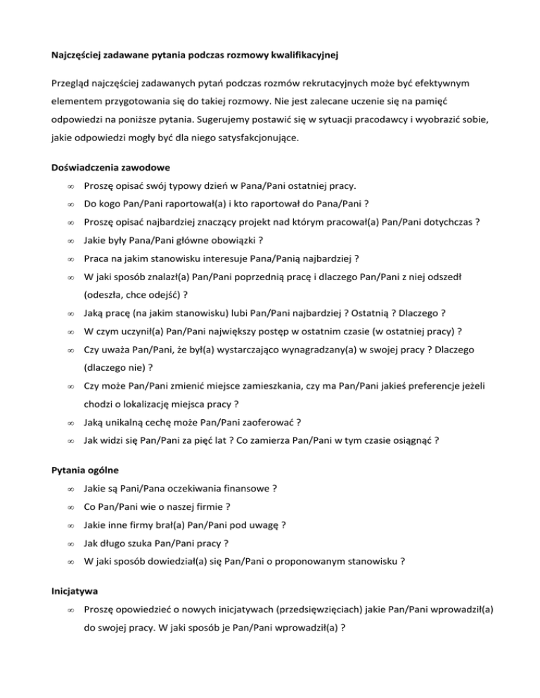 Najczęściej zadawane pytania podczas rozmowy kwalifikacyjnej Przegląd najczęściej zadawanych pytań podczas rozmów rekrutacyjnych może być efektywnym elementem przygotowania się do takiej rozmowy. Nie jest zalecane uczenie się na pamięć odpowiedzi na poniższe pytania. Sugerujemy postawić się w sytuacji pracodawcy i wyobrazić sobie, jakie odpowiedzi mogły być dla niego satysfakcjonujące. Doświadczenia zawodowe • Proszę opisać swój typowy dzień w Pana/Pani ostatniej pracy. • Do kogo Pan/Pani raportował(a) i kto raportował do Pana/Pani ? • Proszę opisać najbardziej znaczący projekt nad którym pracował(a) Pan/Pani dotychczas ? • Jakie były Pana/Pani główne obowiązki ? • Praca na jakim stanowisku interesuje Pana/Panią najbardziej ? • W jaki sposób znalazł(a) Pan/Pani poprzednią pracę i dlaczego Pan/Pani z niej odszedł (odeszła, chce odejść) ? • Jaką pracę (na jakim stanowisku) lubi Pan/Pani najbardziej ? Ostatnią ? Dlaczego ? • W czym uczynił(a) Pan/Pani największy postęp w ostatnim czasie (w ostatniej pracy) ? • Czy uważa Pan/Pani, że był(a) wystarczająco wynagradzany(a) w swojej pracy ? Dlaczego (dlaczego nie) ? • Czy może Pan/Pani zmienić miejsce zamieszkania, czy ma Pan/Pani jakieś preferencje jeżeli chodzi o lokalizację miejsca pracy ? • Jaką unikalną cechę może Pan/Pani zaoferować ? • Jak widzi się Pan/Pani za pięć lat ? Co zamierza Pan/Pani w tym czasie osiągnąć ? Pytania ogólne • Jakie są Pani/Pana oczekiwania finansowe ? • Co Pan/Pani wie o naszej firmie ? • Jakie inne firmy brał(a) Pan/Pani pod uwagę ? • Jak długo szuka Pan/Pani pracy ? • W jaki sposób dowiedział(a) się Pan/Pani o proponowanym stanowisku ? Inicjatywa • Proszę opowiedzieć o nowych inicjatywach (przedsięwzięciach) jakie Pan/Pani wprowadził(a) do swojej pracy. W jaki sposób je Pan/Pani wprowadził(a) ? • Proszę opisać sytuację, kiedy podejmował(a) Pan/Pani znaczące ryzyko. Jakie były jego rezultaty ? • W jakich specjalnościach chciał(a)by Pan/Pani rozwijać się dalej ? Jak zamierza Pan/Pani to robić ? • Jak Pan/Pani widzi swój wkład w działalność naszej firmy ? • Jeżeli zaoferowałbym Panu/Pani pracę, jak zaplanował(a)by Pan/Pani jej dobre rozpoczęcie ? Zdolności przywódcze • Proszę opisać Pana/Pani styl zarządzania. • Jak opisaliby Pana/Panią ludzie pracujący dla Pana/Pani ? • Co według Pana/Pani czyni szefa efektywnym ? • Co dla Pana/Pani jest najbardziej przyjemne w byciu szefem ? A najmniej przyjemne ? • Co uważa Pan/Pani za najtrudniejszy aspekt bycia szefem ? • Jakie czynniki uważa Pan/Pani za mające najbardziej negatywny wpływ na sukces zespołu ? • W jaki sposób Pan/Pani deleguję pracę ? • Jaka wg Pana/Pani jest rola lidera zespołu ? • Jaki typ pracowników uważa Pan za najbardziej trudny do zarządzania ? • Proszę opisać najtrudniejszą sytuację w jakiej znalazł(a) się Pan/Pani będąc szefem. • W jaki sposób motywuje Pan/Pani innych ? Zdolności interpersonalne • Proszę opisać sytuację, w której musiał(a) Pan/Pani pracować z osobą przez Pana/Panią nie lubianą. • Jak spędza Pan/Pani czas poza pracą ? • Jakie są Pani/Pana cele zawodowe ? Co sprawia, że chce je Pan/Pani osiągnąć ? • Proszę opisać sytuację, w której Pana/Pani poglądy kłóciły się z poglądami innego członka zespołu. Jak sobie Pan/Pani poradził(a) ? Jak wpłynęło to na dalsze, wzajemne stosunki ? • Co znaczy dla Pana/Pani "polityka otwartych drzwi" ? • Czy uważa Pan/Pani, że ma jakieś szczególne uzdolnienia ? • Jak ważna jest umiejętność komunikacji na obecnym Pana/Pani stanowisku ? Sytuacje konfliktowe • Proszę podać przykład sytuacji, w której nie był(a) Pan/Pani dumna ze swoich dokonań. Czego nauczyła Pana/Panią ta sytuacja ? • Proszę opisać sytuację, która wydawała się z początku beznadziejna, a później był(a) Pan/Pani w stanie ją rozwiązać ? Jak Pan/Pani tego dokonał(a) ? • Proszę opisać sytuację, kiedy stracił(a) Pan/Pani po raz ostatni panowanie nad sobą w pracy ? • Proszę opowiedzieć o sytuacji konfliktowej ze współpracownikiem i jak Pan/Pani ją rozwiązał(a). • Proszę opowiedzieć o sytuacji kiedy Pana/Pani szef skrytykował Pana/Pani pracę.