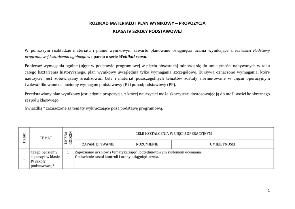 ROZKŁAD MATERIAŁU I PLAN WYNIKOWY – PROPOZYCJA KLASA IV SZKOŁY PODSTAWOWEJ W poniższym rozkładzie materiału i planie wynikowym zawarto planowane osiągnięcia ucznia wynikające z realizacji Podstawy programowej kształcenia ogólnego w oparciu o serię Wehikuł czasu. Ponieważ wymagania ogólne (ujęte w podstawie programowej w pięciu obszarach) odnoszą się do umiejętności nabywanych w toku całego kształcenia historycznego, plan wynikowy uwzględnia tylko wymagania szczegółowe. Kursywą oznaczono wymagania, które nauczyciel jest zobowiązany zrealizować. Cele i materiał poszczególnych tematów zostały sformułowane w ujęciu operacyjnym i zakwalifikowane na poziomy wymagań: podstawowy (P) i ponadpodstawowy (PP). Przedstawiony plan wynikowy jest jedynie propozycją, z której nauczyciel może skorzystać, dostosowując ją do możliwości konkretnego zespołu klasowego. TEMAT I Czego będziemy się uczyć w klasie IV szkoły podstawowej? LICZBA GODZIN DZIAŁ Gwiazdką * zaznaczone są tematy wykraczające poza podstawę programową. 1 CELE KSZTAŁCENIA W UJĘCIU OPERACYJNYM ZAPAMIĘTYWANIE ROZUMIENIE UMIEJĘTNOŚCI Zapoznanie uczniów z tematyką zajęć i przedmiotowym systemem oceniania. Omówienie zasad kontroli i oceny osiągnięć ucznia. 1 1. Co to jest historia? 1 Uczeń zna: • postać: Juliana Ursyna Niemcewicza (PP). Uczeń rozumie: • pojęcia: historia (dzieje), historyk, historia prywatna, historia rodzinna, historia państw (P). Uczeń potrafi: • odróżnić historię rozumianą jako dzieje, przeszłość od historii rozumianej jako opis dziejów przeszłości (P), • opisać Kraków w różnych okresach historycznych (PP), • wyjaśnić, czym zajmują się historycy (P), • podać przykłady wydarzeń należących do historii prywatnej (P), rodzinnej i państw (PP), • wyjaśnić, w jakim celu poznaje się historię (P). 2. Jak poznajemy przeszłość? 1 Uczeń zna: • postać: Walentego Szwajcera (PP), • podział źródeł historycznych (P). Uczeń rozumie: • pojęcia: źródło historyczne, archeolog, archeologia, muzeum (P), ceramika, kronika, wykopaliska archeologiczne (PP), • rolę, jaką w poznawaniu historii odgrywają źródła historyczne (PP). Uczeń potrafi: • opisać okoliczności odkrycia osady w Biskupinie (PP), • podać przykłady różnych źródeł historycznych i wyjaśnić, dlaczego należy je chronić (P), • wyjaśnić, na czym polega praca historyka i archeologa (P), • podać przykłady źródeł historycznych uzyskanych w wyniku pracy archeologów (PP), • dostrzec związki między historią a archeologią (PP), • przedstawić zadania muzeów (P). 3. Jak mierzymy czas? 1 Uczeń zna: Uczeń rozumie: • przyczyny i skutki • pojęcia: kalendarz, wiek wydarzenia, które (stulecie), tysiąclecie (P), zapoczątkowało historię klepsydra (PP), człowieka (PP), • zasady ustalania wieku i • różne sposoby mierzenia połowy wieku dla danego czasu (P), wydarzenia historycznego (P). • wydarzenie, które dało początek obowiązującemu w Europie systemowi datacji (P), • rzymski sposób zapisu cyfr i liczb (P). I I I Uczeń potrafi: • wyjaśnić, w jakim celu mierzy się czas (PP), • obliczać upływ czasu między wydarzeniami historycznymi i umieszczać je na linii chronologicznej (P), • operować pojęciami: wydarzenie wcześniejsze, wydarzenie późniejsze (P), • wyjaśnić znaczenie wynalazku pisma dla wspólnoty ludzkiej (PP), • opowiedzieć historię zegarów (PP), • wymienić poznane typy zegarów (PP). 2 4. Po co nam mapy historyczne? 1 Uczeń rozumie: Uczeń zna: • pojęcia: mapa, legenda • oznaczenia kierunków mapy, mapa historyczna geograficznych (N – (P), mapa geograficzna, północ, S – południe, E – róża wiatrów (PP), wschód, W – zachód) (P), • rolę, jaką w poznawaniu • podstawowe znaki używane w legendzie mapy historii odgrywają mapy historyczne (PP). (P). Uczeń potrafi: • wskazać na mapie, gdzie znajdują się kierunki: północ, południe, wschód i zachód (P), • wymienić poznane rodzaje map (P), • wyjaśnić różnice między mapą geograficzną a mapą historyczną (PP). Warsztat pracy historyka – lekcja powtórzeniowa 1 Uczeń zna: Uczeń rozumie: • postacie związane z • pojęcia związane z tematyką działu Na tropie tematyką działu Na tropie przeszłości, przeszłości, • zasady pracy ze źródłami • rolę źródeł historycznych i map historycznych w historycznymi, ustalania procesie poznawania wieku i połowy wieku oraz pracy z mapą historyczną. historii. Uczeń potrafi: • wyjaśnić, na czym polega praca historyka i archeologa, • wskazać przykłady źródeł pisanych i materialnych, • prawidłowo określić wiek i połowę wieku, • obliczać upływ czasu między wydarzeniami historycznymi i umieszczać je na linii chronologicznej, • zinterpretować znaki w legendzie mapy historycznej, • odpowiedzieć na proste pytania postawione do mapy historycznej, • wyjaśnić, jaki wpływ na historię człowieka miało wynalezienie pisma, • wytłumaczyć, co oznacza sformułowanie, że historia jest nauczycielką życia. Na tropie przeszłości – sprawdzian wiadomości 1 I I I 3 5. Moja rodzina 1 Uczeń zna: Uczeń rozumie: • nazewnictwo stosowane do • pojęcia: rodzina, rodzina określenia relacji między mała, rodzina wielka, poszczególnymi członkami krewny, przodek (P), rodziny (P). genealogia, drzewo genealogiczne (PP). Uczeń potrafi: • na przykładzie własnej rodziny wymienić osoby wchodzące w skład rodziny małej i rodziny wielkiej (P), • określić związki pokrewieństwa między poszczególnymi członkami rodziny (P), • wyjaśnić, w jaki sposób można poznać historię swojej rodziny (PP), • opowiedzieć o wydarzeniu z historii własnej rodziny (P), • wyrazić opinię na temat kultywowania tradycji i gromadzenia pamiątek rodzinnych (PP), • sporządzić drzewo genealogiczn