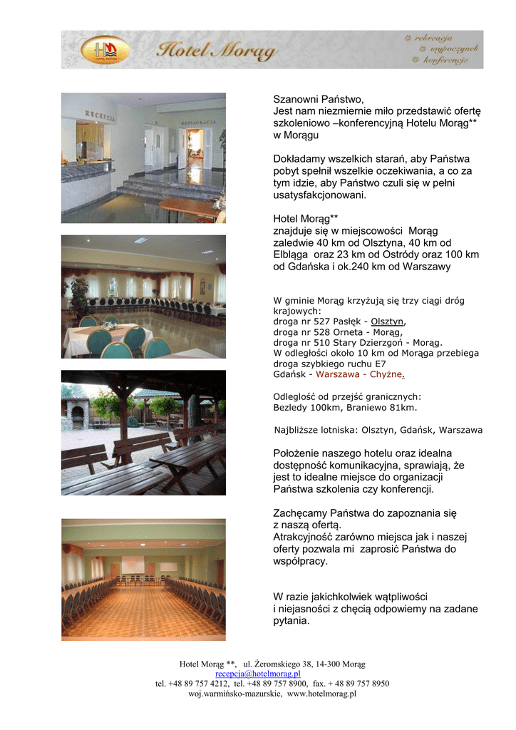 Szanowni Państwo, Jest nam niezmiernie miło przedstawić ofertę szkoleniowo –konferencyjną Hotelu Morąg** w Morągu Dokładamy wszelkich starań, aby Państwa pobyt spełnił wszelkie oczekiwania, a co za tym idzie, aby Państwo czuli się w pełni usatysfakcjonowani. Hotel Morąg** znajduje się w miejscowości Morąg zaledwie 40 km od Olsztyna, 40 km od Elbląga oraz 23 km od Ostródy oraz 100 km od Gdańska i ok.240 km od Warszawy W gminie Morąg krzyżują się trzy ciągi dróg krajowych: droga nr 527 Pasłęk - Olsztyn, droga nr 528 Orneta - Morąg, droga nr 510 Stary Dzierzgoń - Morąg. W odległości około 10 km od Morąga przebiega droga szybkiego ruchu E7 Gdańsk - Warszawa - Chyżne. Odleglość od przejść granicznych: Bezledy 100km, Braniewo 81km. Najbliższe lotniska: Olsztyn, Gdańsk, Warszawa Położenie naszego hotelu oraz idealna dostępność komunikacyjna, sprawiają, że jest to idealne miejsce do organizacji Państwa szkolenia czy konferencji. Zachęcamy Państwa do zapoznania się z naszą ofertą. Atrakcyjność zarówno miejsca jak i naszej oferty pozwala mi zaprosić Państwa do współpracy. W razie jakichkolwiek wątpliwości i niejasności z chęcią odpowiemy na zadane pytania. Hotel Morąg **, ul. Żeromskiego 38, 14-300 Morąg [email protected] tel. +48 89 757 4212, tel. +48 89 757 8900, fax. + 48 89 757 8950 woj.warmińsko-mazurskie, www.hotelmorag.pl RESTAURACJA, BAR, GRILL, OGNISKO Nazwa Max. liczba osób Restauracja leśna 70 Taras letni 25 Bar restauracyjny 10 Chata grillowa - otwarta 80 pod zadaszeniem – do 300 z ograniczonym zadaszeniem Ognisko (obok hotelu przy chacie) wg. uznania GASTRONOMIA Usługa Cena netto od osoby Przerwa kawowa Od 9 PLN netto od osoby Menu w formie bufetu Od 40 PLN netto od osoby Bufet deserowy Od 9,50 Menu serwowane (2 dania) Od 32 PLN netto od osoby Menu serwowane (3 dania) Od 42 PLN netto od osoby Bufet zimny Od 32 PLN netto od osoby Menu grillowe- bufetowe Od 37 PLN netto od osoby Pakiet napoi Od 12 PLN netto od osoby CENA ZA WYNAJEM SALI KONFERENCYJNEJ Nazwa sali Pow. w m² Koszt sali do 5h Koszt sali-cały dzień Wynajem sali na pokaz,wystawę Sala konferencyjno bankietowa 154 400zł netto 550zł netto 90zł netto x h *wszystkie przedstawione ceny są cenami netto Hotel Morąg **, ul. Żeromskiego 38, 14-300 Morąg [email protected] tel. +48 89 757 4212, tel. +48 89 757 8900, fax. + 48 89 757 8950 woj.warmińsko-mazurskie, www.hotelmorag.pl POWIERZCHNIA SALI KONFERENCYJNEJ Nazwa sali Pow. w m² Sala konferencyjnobankietowa 154 (długość 17,7 m , szerokość 8,7 m, wysokość 3 m) TEATRALNE SZKOLNE PODKOWA BANKIETOWE 150 140 120 100 W cenie na życzenie Gościa: nagłośnienie sali, ekran, rzutnik multimedialny , flipchart, dostęp do bezprzewodowego Internetu, Uwaga: pobierana jest dodatkowa opłata w wysokości 500zł netto za zmianę ustawienia w dniu konferencji Sala konferencyjno – bankietowa o powierzchni 154m2 znajduje się na piętrze hotelu. Jest w pełni klimatyzowana oraz wentylowana. Wyposażona jest w sprzęt audiowizualny oraz wszelkie materiały pomocne w organizacji szkoleń. Istnieje możliwość całkowitego zaciemnienia sali. Przerwy kawowe wystawiane są bądź na sali, bądź w holu recepcyjnym. Możliwość ustawienia sali w różnej aranżacji. Sala posiada dostęp do światła dziennego oraz system klimatyzacji. Wyposażenie sali - stoły, krzesła z oparciem w ilości odpowiadającej ilości osób szkolonych, sprzęt multimedialny tj. projektor, ekran elektryczny, mikrofony, nagłośnienie sali sufitowe, tablica suchościeralna , flipchart. Sala spełnia wszelkie wymogi bezpieczeństwa przewidziane przepisami BHP i P-POŻ. W ustawieniu kinowym pomieści ponad 150 osób. Przestrzenna i wygodna. Oferujemy również i gorąco polecamy Państwu usługi naszego MORĄG EVENTS. Na Państwa życzenie organizujemy szereg atrakcji oraz imprez tematycznych zarówno wewnątrz hotelu, jak i poza nim. Nasze imprezy teambuildingowe cieszą się dużym zainteresowaniem i są zawsze na najwyższym poziomie. Współpracujemy również z profesjonalnymi firmami eventowymi Poniżej niektóre z naszych propozycji PROPOZYCJE EVENTS MORĄG Atrakcje wewnątrz hotelu Atrakcje zewnątrz hotelu Morąskie Centrum Rehabilitacji - tworzone Masaże rehabilitacyjne Masaże upiększające Warsztaty de coupage Warsztaty ikebany Warsztaty kucharskie – dla dzieci Warsztaty wizażu Zumba Pokazy i nauka tańca Jezioro z molem ok. 350m od hotelu Pełno wymiarowe boisko piłkarskie 2 pomocnicze boiska piłkarskie Boisko do gry w piłkę plażową Biesiady w chacie grillowej Pokazy rycerskie Pokazy ognia Paintball Nordic Walking Przejażdżki bryczkami Oraz wiele innych atrakcji na życzenie Gości naszego hotelu. Kosztorys dodatkowych usług zostanie przedstawiony po przesłaniu nam dodatkowych informacji dotyczących Państwa potrzeb. * chęć skorzystania z oferty eventowej i niektórych atrakcji wymusza Hotel Morąg **, ul. Żeromskiego 38, 14-300 Morąg [email protected] tel. +48 89 757 4212, tel. +48 89 757 8900, fax. + 48 89 757 8950 woj.warmińsko-mazurskie, www.hotelmorag.pl zarezerwowanie takowej z minimum 4-tygodniowym wyprzedzeniem Za poświęcony czas na zapoznanie się z naszą ofertą – SERDECZNIE DZIĘKUJEMY. Liczymy, że wzbudzi ona zainteresowanie z Państwa strony i pozwoli nawiązać nam owocną współpracę. Z wyrazami szacunku pracownicy i właściciele Hotelu Morąg** Hotel Morąg **, ul. Żeromskiego 38, 14-300 Morąg [email protected] tel. +48 89 757 4212, tel. +48 89 757 8900, fax. + 48 89 757 8950 woj.warmińsko-mazurskie, www.hotelmorag.pl