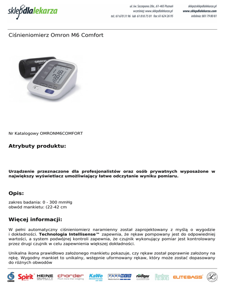 Ciśnieniomierz Omron M6 Comfort Nr Katalogowy OMRONM6COMFORT Atrybuty produktu: Urządzenie przeznaczone dla profesjonalistów oraz osób prywatnych wyposażone w największy wyświetlacz umożliwiający łatwe odczytanie wyniku pomiaru. Opis: zakres badania: 0 - 300 mmHg obwód mankietu: (22-42 cm Więcej informacji: W pełni automatyczny ciśnieniomierz naramienny został zaprojektowany z myślą o wygodzie i dokładności. Technologia Intellisense™ zapewnia, że rękaw pompowany jest do odpowiedniej wartości, a system podwójnej kontroli zapewnia, że czujnik wykonujący pomiar jest kontrolowany przez drugi czujnik w celu zapewnienia większej dokładności. Unikalna ikona prawidłowo założonego mankietu pokazuje, czy rękaw został poprawnie założony na rękę. Wygodny mankiet to unikalny, wstępnie uformowany rękaw, który może zostać dopasowany do różnych obwodów i kształtów ramion od 22 do 42 cm. Cechy produktu: Model: HEM-7321-E, Wyświetlacz: cyfrowy LCD, Wskaźnik prawidłowo założonego mankietu, Automatyczny zawór uwalniania powietrza, Czujnik ruchu - wykrywanie niepożądanego ruchu ciała, Funkcja wykrywania nieregularnej pracy serca, Dwie pamięci użytkowników - pamięć 100 pomiarów dla każdego z dwóch użytkowników. W zestawie: Ciśnieniomierz, Wygodny makiet, Etui, Baterie (4xAA-LR06), Instrukcję obsługi, Kartę do notowania zmierzonych wartości ciśnienia, Kartę gwarancyjną. Zasilacz. Ciśnieniomierz posiada 5-letnią gwarancję. Powered by TCPDF (www.tcpdf.org)