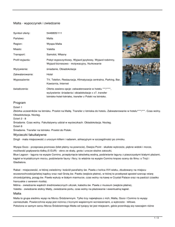 Malta - wypoczynek i zwiedzanie Symbol oferty: 5446805/111 Państwo: Malta Region: Wyspa Malta Miasto: Valetta Transport: Samolot, Własny Profil wyjazdu: Pobyt wypoczynkowy, Wyjazd językowy, Wyjazd rodzinny, Wyżywienie: śniadanie, Obiadokolacje Zakwaterowanie: Hotel Wyposażenie: TV, Telefon, Restauracja, Klimatyzacja centralna, Parking, Bar, świadczenia: Oferta zawiera opcje: zakwaterowanie w hotelu ***/****, Wyjazd biznesowo - motywacyjny, Nurkowanie Kawiarnia, Internet wyżywienie: śniadania i obiadokolacje x x7, transfer lotnisko-hotel-lotnisko, transfer z Polski na lotnisko. Program Dzień 1 Zbiórka uczestników na lotnisku. Przelot na Maltę. Transfer z lotniska do hotelu. Zakwaterowanie w hotelu****/***. Czas wolny. Obiadokolacja. Nocleg. Dzień 2 - 8 Śniadanie. Czas wolny. Fakultatywny udział w wycieczkach. Obiadokolacja. Nocleg. Dzień 8 Śniadanie. Transfer na lotnisko. Przelot do Polski. Wycieczki fakultatywne Dingli - mała miejscowość z uroczym klifem i radarem, atrkacyjnym w szczególności po zmroku. Wyspa Gozo - przeprawa promowa (bilet płatny na powrocie), Dwejra Point - skaliste wybrzeże, piękne widoki i morze, możliwość popływania łódką (5 EUR) - okno ze skały, grota i urocze skalne zatoczki, Blue Lagoon - laguna na wyspie Comino, przepłynięcie taksówką wodną, podziwianie laguny z piaszczystymi białymi plażami, kąpiel w krystalicznym morzu, podziwianie fauny i flory; to właśnie na wyspie Comino kręceo sceny do filmu: o Troji i Gladiatora. Rabat - miejscowość, w której zwiedzimy: kościół parafialny św. Pawła z końca XVI wieku, zbudowany na miejscu wczesnochrześcijańskiej kaplicy oraz nad Grotą św. Pawła (wejście płatne), w której to przebywał apostoł szerząc wiarę chrześcijańską, posąg św. Pawła wykuty w białym marmurze, czas wolny na kawę w Crystal Palace oraz na pastizzi (ciastko francuskie z sererem ricotta). Mdina - zwiedzanie wąskich średniowiecznych uliczek, katedra św. Pawła z muzeum (wejście płatne), Valetta - zwiedzanie stolicy Malty, zwiedzanie portu, czas wolny na plażowanie i ewentualną kąpiel. Malta Malta to grupa siedmiu wysp na Morzu Śródziemnym. Tylko trzy największe z nich, Malta, Gozo i Comino to wyspy zamieszkałe. Powierzchnia wysp jest nizinna z licznymi wapiennymi wzniesieniami, a wybrzeże - klifowe. Położona w samym sercu Morza Śródziemnego Malta od tysięcy lat jest miejscem, gdzie przenikają się nawzajem różne 1/3 cywilizacje. Została zasiedlona około roku 5200 p.n.e. Jeszcze przez kolonizacją wyspy przez Fenicjan, którzy nadali jej nazwę Malat, czyli -bezpieczne schronienie”, istniała tam rozwinięta kultura prehistoryczna. W późniejszych wiekach wyspy były siedzibą zakonu joannitów, zwanych później kawalerami maltańskimi, a następnie częścią Imperium Brytyjskiego. Malta uzyskała niepodległość w 1964 r. Tradycyjne dania kuchni maltańskiej to między innymi zupy (minestrone, zupa rybna), makarony i ciasta. Specjalnością miejscowej kuchni są dania faszerowane,a potrawą narodową jest Stuffat Tal-Fenek (duszony królik). TERMINY: od: 2017-03-03 do: 2017-03-10 (8 dni), miejsca: sprawdź miejsca cena od: 1753 PLN = 402 EUR od: 2017-03-10 do: 2017-03-17 (8 dni), miejsca: sprawdź miejsca cena od: 1753 PLN = 402 EUR od: 2017-03-17 do: 2017-03-24 (8 dni), miejsca: sprawdź miejsca cena od: 1753 PLN = 402 EUR od: 2017-03-24 do: 2017-03-31 (8 dni), miejsca: sprawdź miejsca cena od: 1753 PLN = 402 EUR od: 2017-03-31 do: 2017-04-07 (8 dni), miejsca: sprawdź miejsca cena od: 1753 PLN = 402 EUR od: 2017-04-07 do: 2017-04-14 (8 dni), miejsca: sprawdź miejsca cena od: 1753 PLN = 402 EUR od: 2017-04-14 do: 2017-04-21 (8 dni), miejsca: sprawdź miejsca cena od: 1753 PLN = 402 EUR od: 2017-04-21 do: 2017-04-28 (8 dni), miejsca: sprawdź miejsca cena od: 1753 PLN = 402 EUR od: 2017-04-28 do: 2017-05-05 (8 dni), miejsca: sprawdź miejsca cena od: 1753 PLN = 402 EUR od: 2017-05-05 do: 2017-05-12 (8 dni), miejsca: sprawdź miejsca cena od: 1753 PLN = 402 EUR od: 2017-05-12 do: 2017-05-19 (8 dni), miejsca: sprawdź miejsca cena od: 1753 PLN = 402 EUR od: 2017-05-19 do: 2017-05-26 (8 dni), miejsca: sprawdź miejsca cena od: 1753 PLN = 402 EUR CENNIK: Długość pobytu: 8 dni Grupa cenowa: A Transport - przyjazd (do wyboru) Malta - Wiedeń (MLA-VIE) Malta - Monachium (MLA-MUC) (*) Malta - Warszawa (MLA-FRA-WAW) Malta - Berlin (MLA-TXL) - - - dojazd własny - - - Inne6 (do wyboru) transfer Katowice - Berlin Tegel na lotnisko transfer Warszawa - Berlin tegel na lotnisko transfer Katowice - WIedeń na lotnisko (*) bez transferu - dojazd własny na lotnisko Pobyt w obiekcie (do wyboru) pokój 2-osobowy + dostawka + dziecko 0-2 lat standardowo dla osób: 4 pokój 2os. dla 1os. (*) pokój 2-osobowy z balkonem standardowo dla osób: 2 pokój 2-osobowy + dostawka standardowo dla osób: 3 pokój 2os.+dziecko 2-12 standardowo dla osób: 3 pokój 2-os. + 2 dzieci do 15 lat standardowo dla osób: 4 169.5 169.5 169.5 169.5 (-) 59.89 59.89 59.89 (-) 167.24 118.65 126.56 167.24 126.56 2/3 158.2 pokój 1-osobowy pokój 2-os. + 1 dziecko do 15 lat standardowo dla osób: 3 Transport - wyjazd (do wyboru) Berlin - Malta (TXL-MLA) (*) Warszawa - Malta (WAW-FRA-MLA) Wiedeń - Malta (VIE-MLA) - - - dojazd własny - - Monachium - Malta (MUC-MLA) 118.65 126.56 169.5 169.5 169.5 (-) 169.5 Waluta: EUR Aktualne ceny z systemu S.A.R.T. (-) - cena usługi, podatku kalkulowana przy osobie lub gratis (*) - kwota wliczona w cenę standardową 3/3