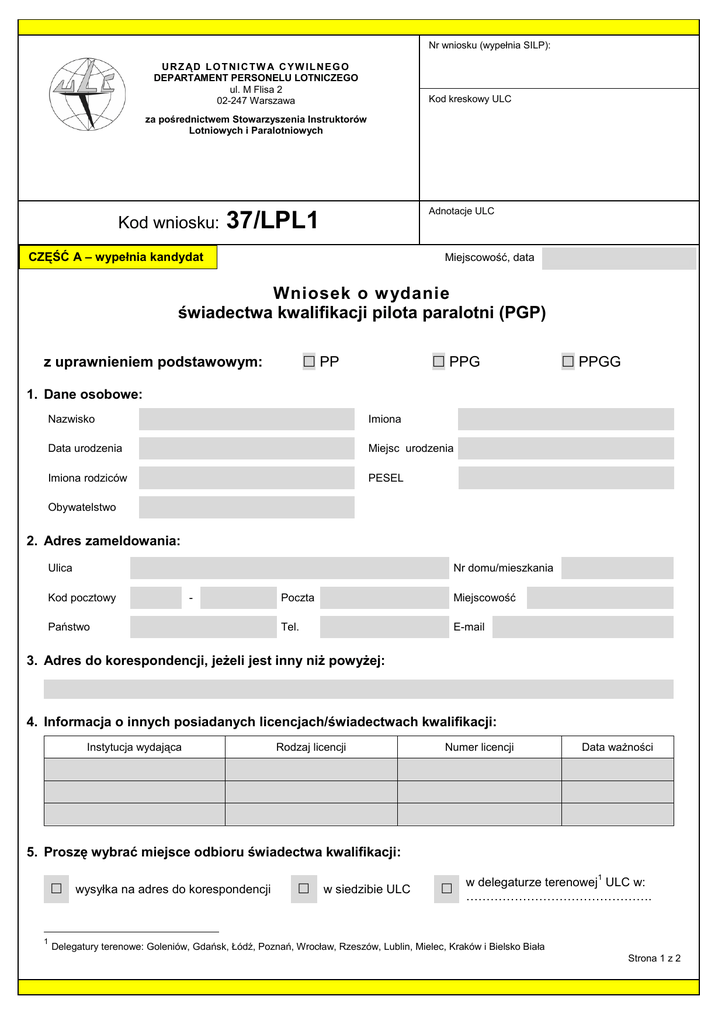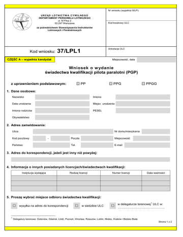 Nr wniosku (wypełnia SILP): U R Z ĄD L O T N I C T W A C Y W I L N E G O DEPARTAMENT PERSONELU LOTNICZEGO ul. M Flisa 2 02-247 Warszawa ……………………………… Kod kreskowy ULC za pośrednictwem Stowarzyszenia Instruktorów Lotniowych i Paralotniowych Kod wniosku: Adnotacje ULC 37/LPL1 CZĘŚĆ A – wypełnia kandydat Miejscowość, data ……………… Wniosek o w ydanie……………… świadectwa kwalifikacji pilota paralotni (PGP) ……………………… ……… PP z uprawnieniem podstawowym: PPG PPGG 1. Dane osobowe: Nazwisko Imiona Data urodzenia Miejsc urodzenia Imiona rodziców PESEL Obywatelstwo 2. Adres zameldowania: Ulica Nr domu/mieszkania Kod pocztowy - Państwo Poczta Miejscowość Tel. E-mail 3. Adres do korespondencji, jeżeli jest inny niż powyżej: 4. Informacja o innych posiadanych licencjach/świadectwach kwalifikacji: Instytucja wydająca Rodzaj licencji Numer licencji Data ważności 5. Proszę wybrać miejsce odbioru świadectwa kwalifikacji: 1 wysyłka na adres do korespondencji 1 w siedzibie ULC w delegaturze terenowej ULC w: ………………………………………. Delegatury terenowe: Goleniów, Gdańsk, Łódź, Poznań, Wrocław, Rzeszów, Lublin, Mielec, Kraków i Bielsko Biała Strona 1 z 2 6. Informacja o dokumentach załączonych do wniosku: Dokument Zaznacz właściwe** Zaświadczenie o ukończeniu szkolenia teoretycznego i praktycznego Protokół z egzaminu teoretycznego Protokół z egzaminu praktycznego Dowód wniesienia opłaty za wydanie świadectwa kwalifikacji Dowód wniesienia opłaty za przeprowadzenie egzaminu teoretycznego/praktycznego Adnotacje ULC / Dokument potwierdzający wykształcenie Inne * 7. Oświadczenia: 1. Oświadczam, że mój stan zdrowia pozwala na bezpieczne wykonywanie czynności lotniczych na paralotni. 2. Zgodnie z art. 96 ust. 1 i 1a oraz art. 95 ust. 3a ustawy z dnia 3 lipca 2002 Prawo Lotnicze (Dz. U. z 2013r. poz. 1393), oświadczam, że: korzystam w pełni z praw publicznych ; posiadam pełną zdolność do czynności prawnych lub przedkładam zgodę opiekunów prawnych;*** prokurator nie zastosował wobec mnie środka zapobiegawczego polegającego na obowiązku powstrzymania się od prowadzenia wszelkiego rodzaju pojazdów mechanicznych lub od prowadzenia wszelkiego rodzaju pojazdów w ruchu powietrznym oraz prawomocnym wyrokiem sądowym nie orzeczono wobec mnie zakazu prowadzenia pojazdów mechanicznych. 3. Świadomy(a) odpowiedzialności karnej, z art. 272 Kodeksu karnego oświadczam, że powyższe dane są zgodne z prawdą. 4. Zgodnie z Ustawą o ochronie danych osobowych (Dz. U. z 2002 r. Nr 101, poz. 926) z dnia 29 sierpnia 1997 r.) wyrażam zgodę na przetwarzanie moich danych osobowych przez Urząd Lotnictwa Cywilnego. 5. Zostałem(am) poinformowany(a) o prawie wglądu do moich danych osobowych oraz ich poprawiania. Data i podpis kandydata Wnoszę o doręczenie pism za pomocą środków komunikacji elektronicznej w rozumieniu przepisów ustawy z dnia 18 lipca 2002 r. o świadczeniu usług drogą elektroniczną (Dz.U. Nr 144, poz. 1204, z późn. zm.[19]) Data i podpis kandydata .* Wpisać nazwę dokumentu posiadającego istotne znaczenie dla wydania licencji, dokumentu upoważniającego do zniżki w opłacie lotniczej itp. ** Fakt załączenia dokumentu należy zaznaczyć wstawiając znak „X *** Niepotrzebne skreślić Strona 2 z 2 v.2.1/10-09-2014