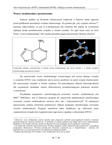 Piotr Wojciechowski ·•·DTP z elementami HTML • Edycja wzorów chemicznych Wzory strukturalne i przestrzenne Podczas studiów na Wydziale Chemicznym większość z Państwa stanie zapewne przed problemem prezentacji związku chemicznego. Na pytanie jak „jak wygląda adenina?”, możemy odpowiedzieć, że jest to 6-aminopuryna lub witamina B4, jednak na wyobraźnie najlepiej działa przedstawienie związku w formie rysunku. Na ogół może mieć on dwie formy: wzoru strukturalnego* lub rysunku przedstawiające przestrzenne ułożenie atomów†. Cząsteczka adeniny, przestawiona w formie wzoru strukturalnego (po lewej stronie) i w formie rysunku przestrzennego (po prawej stronie). Do narysowania wzoru strukturalnego wystarczająca jest nazwa danego związku w systemie IUPAC oraz wiadomość jak tę nazwę przełożyć na język wiązań chemicznych. Do narysowania związku w formie struktury 3D potrzebujemy danych doświadczalnych lub uzyskanych metodami chemii obliczeniowej przedstawiającymi położenie atomów w przestrzeni. Przykładem programów umożliwiających tworzenie wzorów strukturalnych jest MDL® ISIS/Draw. Jest to darmowy program do zastosowań akademickich umożliwiający tworzenie wzorów strukturalnych zarówno dwu, jak i trójwymiarowych‡. W niniejszym opracowaniu zostaną omówione podstawowe funkcje programu umożliwiające rysowanie wzorów strukturalnych. Program umożliwia także dodatkowo np. obliczenie masy cząsteczkowej związku lub wygenerowanie jego nazwy zgodnej z zaleceniami IUPAC. * Obrazowo wzór strukturalny można określić jako połączenie symboli poszczególnych atomów, kreskami przedstawiającymi wiązania chemiczne. Ta definicja ze szkoły podstawowej oddaje idee wzoru strukturalnego. Dodatkowo na rysunku możemy zaznaczyć długość oraz kąty pomiędzy poszczególnymi wiązaniami. † Tak naprawdę wrażenie trójwymiarowości rysunku osiągamy dzięki okularom trójwymiarowym i specjalnym programom chemicznym. Prostszą metodą jest obracanie cząsteczki np. w HyperChemie – możemy tak sprawdzić np. czy narysowana przez nas adenina jest naprawdę płaska. ‡ Struktura przestrzenna 3D związku i wzór strukturalny 3D to nie to samo! ! 1 " Piotr Wojciechowski ·• DTP z elementami HTML • MDL® ISIS/Draw MDL® ISIS/Draw – instalacja programu Program ISIS/Draw można pobrać, że strony MDL Information System, Inc.* Dostępna jest wersja pod Widowsa i na MacOS’a (wersja windowsowa pracuje także poprawnie pod „windą” na linuksie). Po pobraniu programu (pełna wersja waży niecałe 8MB) proponuję wybrać pełną instalację programu – pozwoli ona nam później skorzystać z szablonów, plików pomocy oraz dodatkowych modułów programu. Początek pracy z programem MDL® ISIS/Draw Po uruchomieniu programu powinniśmy zobaczyć okno programu, w postaci białej powierzchni, na której będziemy rysować wzory chemiczne. Pod górnym paskiem z menu, znajduje się poziomy pasek z ikoną „inspektora” oraz ikonami szkieletów pierścieni aromatycznych. Wzdłuż lewego marginesu znajduje się pionowy pasek z ikonami narzędzi. Ikonki narzędzi z tego paska, na których znajdują się małe strzałeczki w ich prawym dolnym rogu, można rozwinąć do podmenu pozwalającego na modyfikację działania danego narzędzia. * Ja moją wersję programu pobrałem po wypełnieniu formularza rejestracyjnego ze strony http://www.mdli.com/downloads/ - stronę tę znalazłem w Internecie po słowach kluczowych, wpisując do wyszukiwarki hasła: isisdraw download. Alternatywnie można program pobrać z europejskiego serwera firmy pod adresem http://www.mdli.co.uk/ (W razie kłopotów ze „zdobyciem” programu proszę o kontakt na konsultacjach). # 2 $ Piotr Wojciechowski ·•·DTP z elementami HTML • Edycja wzorów chemicznych Pasek narzędzi Przed przystąpieniem do rysowania związku chemicznego, przyjrzymy się podstawowym narzędziom kryjącym się w pionowym pasku po lewej stronie. Na początek do zapisania prostej reakcji chemicznej w formie wzorów strukturalnych powinna nam wystarczyć znajomość pierwszych od góry dziewięciu narzędzi*. Lasso – narzędzie do zaznaczania fragmentu lub całego wzoru 2D rogate – narzędzie do obracania o dowolny kąt zaznaczonego fragmentu wzoru Atom – definiuje symbol wprowadzanego atomu lub grupy funkcyjnej Definiuje typ wiązania chemicznego Symbol „plusa” przydatny np. przy zapisie reakcji chemicznych Gumka – umożliwia wykasowanie fragmentu wzoru Rzędowość wiązania chemicznego (domyślnie pojedyncze) Łańcuch – narzędzie przydatne przy np. rysowaniu polimerów Strzałki – po rozwinięciu menu mamy do wyboru szereg strzałek, przydatnych zarówno do zapisywania reakcji chemicznej jak i np. przeniesienia ładunku Pozostałem narzędzia na lewym pasku to: „mapowanie” reakcji atom-atom, „sekwencje”, nawias klamrowy (przydatny np. przy zapisie n-krotnie powtarzającego się fragmentu cząsteczki – proszę zobaczyć wzór wosku pszczelego, na ostatniej stronie opracowania), tekst (pozwalający np. podpisać dany związek na rysunku), linia i prostokąt. Jeśli zainstalowaliśmy moduł pozwalający na automatyczne nadawanie nazw wzorom według konwencji IUPAC na dole pojawi się jeszcze jedna dodatkowa ikona z tym narzędziem. * Ich działanie możemy modyfikować „rozwijając” poszczególne narzędzia. Natomiast skrócony opis danego narzędzia (w języku angielskim) możemy zobaczyć, gdy przytrzymamy przez chwile wskaźnik myszki nad danym narzędziem. ! 3 " Piotr Wojciechowski ·• DTP z elementami HTML • MDL® ISIS/Draw Podstawy rysowania wzorów strukturalnych Standardowo we wzorach rysowany w programie MDL® ISIS/Draw pomijane są atomy wodoru. Także atomy węgla nie są podpisywane i przyjmuje się, ze znajdują się one na końcach kresek symbolizujących wiązania chemiczne. Wg tej konwencji, pojedyncza kreska – oznaczałaby etan, symbol = et
