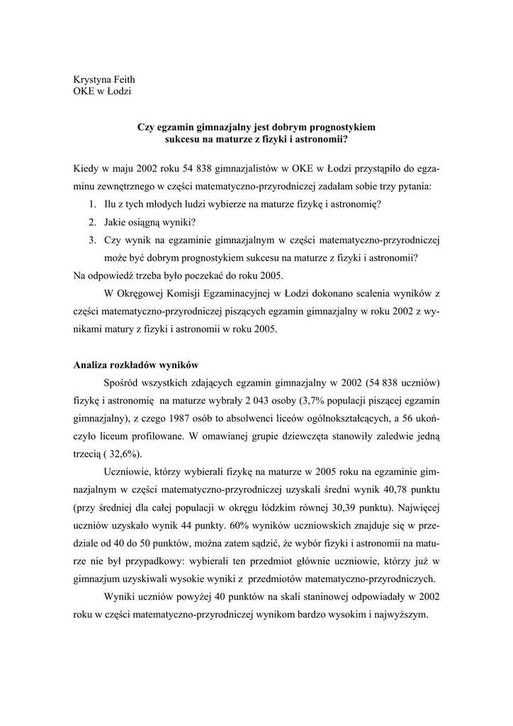 Krystyna Feith OKE w Łodzi Czy egzamin gimnazjalny jest dobrym prognostykiem sukcesu na maturze z fizyki i astronomii? Kiedy w maju 2002 roku 54 838 gimnazjalistów w OKE w Łodzi przystąpiło do egzaminu zewnętrznego w części matematyczno-przyrodniczej zadałam sobie trzy pytania: 1. Ilu z tych młodych ludzi wybierze na maturze fizykę i astronomię? 2. Jakie osiągną wyniki? 3. Czy wynik na egzaminie gimnazjalnym w części matematyczno-przyrodniczej może być dobrym prognostykiem sukcesu na maturze z fizyki i astronomii? Na odpowiedź trzeba było poczekać do roku 2005. W Okręgowej Komisji Egzaminacyjnej w Łodzi dokonano scalenia wyników z części matematyczno-przyrodniczej piszących egzamin gimnazjalny w roku 2002 z wynikami matury z fizyki i astronomii w roku 2005. Analiza rozkładów wyników Spośród wszystkich zdających egzamin gimnazjalny w 2002 (54 838 uczniów) fizykę i astronomię na maturze wybrały 2 043 osoby (3,7% populacji piszącej egzamin gimnazjalny), z czego 1987 osób to absolwenci liceów ogólnokształcących, a 56 ukończyło liceum profilowane. W omawianej grupie dziewczęta stanowiły zaledwie jedną trzecią ( 32,6%). Uczniowie, którzy wybierali fizykę na maturze w 2005 roku na egzaminie gimnazjalnym w części matematyczno-przyrodniczej uzyskali średni wynik 40,78 punktu (przy średniej dla całej populacji w okręgu łódzkim równej 30,39 punktu). Najwięcej uczniów uzyskało wynik 44 punkty. 60% wyników uczniowskich znajduje się w przedziale od 40 do 50 punktów, można zatem sądzić, że wybór fizyki i astronomii na maturze nie był przypadkowy: wybierali ten przedmiot głównie uczniowie, którzy już w gimnazjum uzyskiwali wysokie wyniki z przedmiotów matematyczno-przyrodniczych. Wyniki uczniów powyżej 40 punktów na skali staninowej odpowiadały w 2002 roku w części matematyczno-przyrodniczej wynikom bardzo wysokim i najwyższym. liczebność Rozkład wyników GMP 2002 Zdających 2043 Średnia 40,34 200 Mediana 41 150 Dominanta 44 100 Odchylenie standardowe Skośność 50 49 47 45 43 41 39 37 35 33 31 29 27 25 23 20 0 liczba punktów na maturze 2005 zdawali fizykę 5,44 -0,91 Kurtoza 1,04 Rozstęp 30 Minimum 20 Maksimum 50 Rys. 1. Rozkład wyników na GMP w 2002 r. w części matematyczno-przyrodniczej, dla uczniów, którzy w 2005 roku przystąpili do matury z fizyki i astronomii. W dalszej części skoncentrujemy się na wynikach uczniów z wynikami powyżej 40 punktów na egzaminie gimnazjalnym. Zdających 1238 Średnia 33,54 80 Mediana 34,00 60 Dominanta 40 Odchylenie standardowe 7,845 20 Skośność -,138 Kurtoza -,644 Rozstęp 39 Minimum 11 Maksimum 50 liczebność ROZKŁAD WYNIKÓW AI - fizyka 2005 liczba punktów GMP 2002 >40 pkt. 50 48 46 44 42 40 38 36 34 32 30 28 26 24 22 20 18 16 14 11 0 33 Rys. 2. Rozkład wyników za Arkusz I z fizyki i astronomii na maturze 2005, dla uczniów którzy na egzaminie gimnazjalnym w części matematyczno-przyrodniczej w 2002 roku uzyskali ponad 40 punktów. Rozkład można traktować jako normalny. Tylko 3 (0,2%) zdających uzyskało wynik poniżej 15 punktów. Gdyby wybrali fizykę i astronomię jako przedmiot obowiązkowy nie osiągnęli by progu zaliczeniowego. 40 % zdających uzyskało wynik w przedziale od 36 do 50 punktów i tym samym znaleźli się w staninach od wyżej średniego do najwyższego. Warto zauważyć, że w przypadku analizowanej grupy mediana wynosi 34 punk- ty podczas, gdy dla całej populacji zdających fizykę i astronomię 30 punktów. Dominanta dla obu tych grup wynosi odpowiednio 33 i 29 punktów. Przeanalizujmy, jak prezentują się wyniki matury z fizyki i astronomii pisanej na poziomie rozszerzonym. Ten poziom wybrało 1205 osób. ROZKŁAD WYNIKÓW AII - fizyka 2005 liczebność 80 Zdających 1205 Średnia 19,79 Mediana 19,00 60 Dominanta 40 Odchylenie standardowe 20 Skośność 0 0 4 8 12 16 20 24 28 32 liczba punktów GMP 2002>40 pkt. 36 40 44 48 21 9,711 ,365 Kurtoza -,343 Rozstęp 49 Minimum 0 Maksimum 49 Rys. 3. Rozkład wyników za arkusz AII z fizyki i astronomii dla uczniów, którzy na egzaminie gimnazjalnym w części matematyczno-przyrodniczej w 2002 roku uzyskali powyżęj 40 punktów. Jak pokazuje wykres na rys 3. rozkład przesunięty jest w kierunku wyników niższych. Mediana dla omawianej grupy zdających wynosi 19 punktów, dla całej populacji jest niższa o 4 punkty (15 pkt.). Dominanta jest równa odpowiednio 21 i 6 punktów. 40% wyników piszących egzamin na poziomie rozszerzonym mieści się w zakresie od 22 do 49 punktów. Zdający z tymi wynikami mieszczą się w staninie od średniego do najwyższego. Najliczniejsza grupa (259 osób) zdających znajduje się w staninie wysokim. Analiza zadań W teście gimnazjalnym (część matematyczno-przyrodnicza) w roku 2002 było 6 zadań z fizyki (3 zadania zamknięte i 3 otwarte). Maksymalna ilość punktów jakie zdający mógł otrzymać za zadania wynosiła 9 punktów, co stanowiło 18% wszystkich możliwych do zdobycia punktów za cały test. ROZKŁAD WYNIKÓW - zadania z fizyki na GMP 2002 500 liczebność 400 300 200 100 0 2 3 4 5 6 7 8 9 liczba punktów Rys. 4. Rozkład wyników – zadania z fizyki na egzaminie gimnazjalnym w 2002 r. dla uczniów, którzy przystąpili w 2005 roku do matury z fizyki i astronomii 85 % zdających otrzymało z fizyki 7 i więcej punktów na 9 możliwych do osiągnięcia. W poniższej tabeli zebrane zostały łatwości poszczególnych zadań z fizyki dla omawianej grupy i łatwości tych samych zadań dla całej populacji piszącej egzamin gimnazjalny w roku 2002. Tabela 1. Łatwości zadań z fizyki na egzaminie gimnazjalnym w 2002 r. Lp. 1. 2. 3. 4. 5. 6. Numer zadania 9. 11. 20. 29. 31. 34. Łatwość dla grupy 0,89 0,89 0,99 0,95 0,50 0,96 Łatwość dla populacji 0,65 0,61 0,90 0,39 0,19 0,77 Z analizy danych w tabeli 1. wynika wyraźnie, że zadania z fizyki dla omawianej grupy, były zdecydowanie łatwiejsze niż dla całej populacji pisz