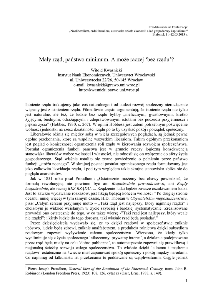 Przedstawione na konferencji: „Neoliberalizm, ordoliberalizm, austriacka szkoła ekonomii a ład gospodarczy kapitalizmu“ Białystok 11–12.03.2013 r. Mały rząd, państwo minimum. A może raczej ‘bez rządu’? Witold Kwaśnicki Instytut Nauk Ekonomicznych, Uniwersytet Wrocławski ul. Uniwersytecka 22/26, 50-145 Wrocław e-mail: [email protected] http://kwasnicki.prawo.uni.wroc.pl Istnienie rządu traktujemy jako coś naturalnego i od stuleci rozwój społeczny nierozłącznie wiązany jest z istnieniem rządu. Filozofowie często argumentują, że istnienie rządu nie tylko jest naturalne, ale też, że ludzie bez rządu byliby „nielicznymi, gwałtownymi, krótko żyjącymi, biednymi, odrażającymi i zdeprawowanymi istotami bez poczucia przyjemności i piękna życia” (Hobbes, 1930, s. 267). W opinii Hobbesa jest zatem potrzebnym poświęcenie wolności jednostki na rzecz działalności rządu po to by uzyskać pokój i porządek społeczny. Liberałowie różnią się między sobą w wielu szczegółowych poglądach, są jednak pewne ogólne przekonania, które są wspólne wszystkim liberałom. Takim ogólnym przekonaniem jest pogląd o konieczności ograniczenia roli rządu w kierowaniu rozwojem społeczeństwa. Postulat ograniczenia funkcji państwa jest w gruncie rzeczy logiczną konsekwencją stanowiska liberałów wobec wolności i własności, nie odnosił się on wyłącznie do sfery życia gospodarczego. Stąd właśnie ustaliło się znane powiedzenie o pełnieniu przez państwo funkcji „stróża nocnego”. W skrajnej postaci postulat ograniczonego rządu formułowany jest jako całkowita likwidacja rządu, i pod tym względem takie skrajne stanowisko zbliża się do poglądu anarchistów. Jak w 1851 roku pisał Proudhon1: „Ostatecznie możemy bez obawy powiedzieć, że formułą rewolucyjną nie powinno być ani Bezpośrednie prawodawstwo, ani Rządy bezpośrednie, ale raczej BEZ RZĄDU. ... Rządzenie ludzi będzie zawsze oszukiwaniem ludzi. Jest to zawsze wydawanie rozkazów, jest fikcją będącą końcem wolności.” Po drugiej stronie oceanu, mniej więcej w tym samym czasie, H.D. Thoreau w Obywatelskim nieposłuszeństwie, pisał „Całym sercem przyjmuje motto – „Taki rząd jest najlepszy, który najmniej rządzi” i chciałbym je widzieć wcielanym w życie szybciej i bardziej systematycznie. Zrealizowane prowadzi ono ostatecznie do tego, w co także wierzę -”Taki rząd jest najlepszy, który wcale nie rządzi”; i kiedy ludzie do tego dorosną, taki właśnie rząd będą posiadać.” Przez dziesięciolecia wydawało się, że to dzięki rządowi w społeczeństwie zniknie ubóstwo, ludzie będą zdrowi, zniknie analfabetyzm, a produkcja rolnictwa dzięki subsydiom rządowym zapewni wyżywienie całemu społeczeństwu. Wierzono, że kiedy tylko wyeliminuje się z życia społecznego ‘nikczemny, prywatny interes’, a działania podejmowane przez rząd będą miały na celu ‘dobro publiczne’, to automatycznie zapewni się prawidłową i racjonalną ścieżkę rozwoju całego społeczeństwa. To właśnie dzięki ‘silnemu i mądremu rządowi’ ostatecznie na świecie miał zapanować spokój społeczny i pokój między narodami. Co najmniej od kilkunastu lat przekonania te poddawane są wątpliwościom. Ciągle jednak 1 Pierre-Joseph Proudhon, General Idea of the Revolution of the Nineteenth Century, trans. John B. Robinson (London Freedom Press, 1923) 108, 126, cytat za (Oser, Brue, 1988, s. 149). 1 przeważa wiara, że złe funkcjonowanie rządu nie jest kwestią źle położonych fundamentów, że nadal na tej idei można kierować rozwojem społecznym, wystarczy jedynie dostroić pewne mechanizmy rządzenia. Z perspektywy kilkudziesięciu lat rozrostu rządu jako instytucji społecznej widać, że wiara w rząd była w istocie romantycznym marzeniem i próbą ucieczki od odpowiedzialności. Jeżeli spojrzymy na dokonania rządu w tych latach, porównamy je z obietnicami i oczekiwaniami to okaże się, że rząd okazał się niezmiernie skuteczny w dwóch rzeczach – (1) prowokowaniu i prowadzeniu wojny, oraz (2) deprecjacji pieniądza i generowaniu inflacji. Cechą charakterystyczną rządu centralnego jest pewna legitymizacja użycia siły, lub groźby użycia siły, jako środka przymusu stosowanego w stosunku do niektórych członków danej społeczności po to by wymusić na nich pewien typ zachowania, którego w istocie nie akceptują. Najistotniejsze jest to, iż rząd ma monopol na użycie, lub groźbę użycia, siły w stosunku do ludzi żyjących na danym terytorium. Dougald Stewart, student Adama Smitha, pisze, że na jednym z wykładów w 1749 roku Adam Smith twierdził, że po to by sprzyjać dobrobytowi społeczeństwa wystarczy by rząd pozwolił ludziom robić to co uznają za pożyteczne. Smith miał powiedzieć: „Bardzo mało jest wymagane by doprowadzić państwo do dobrobytu nawet z najniższego poziomu barbarzyństwa, mianowicie pokój, niskie podatki i tolerancyjne kierowanie sferą sprawiedliwości. Wszystkie formy rządów, które zbaczają z tej naturalnej ścieżki, lub które odwołują się do potrzeby zahamowania rozwoju społecznego na jakimś szczególnym etapie, są nienaturalne i po to by utrzymać się u władzy, zmuszone są odwoływać się do represji i tyranii.” (za Powell, 1995). Myśl tę Adam Smith rozwinął w Bogactwie narodów (1776) gdzie wyliczył trzy suwerenne funkcje ograniczonego rządu, mianowicie (1) ochronić społeczeństwo przed atakiem zewnętrznym; (2) utrzymywanie administracji sądowej i wymiaru sprawiedliwości, oraz (3) “obowiązek ustanawiania i utrzymywania pewnych urządzeń publicznych i publicznych instytucji, których ustanowienie i utrzymywanie nie może nigdy leżeć w interesie jednostki lub niewielkiej liczby jednostek, a to dlatego, że dochód z nich nie pokryje nigdy kosztów jednostce lub małej grupie jednostek, choć koszty, jakie poniosło ja