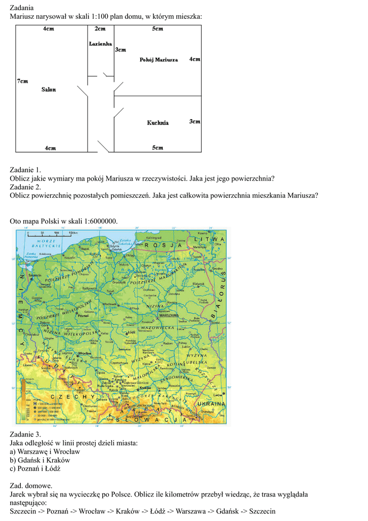 Zadania Mariusz narysował w skali 1:100 plan domu, w którym mieszka: Zadanie 1. Oblicz jakie wymiary ma pokój Mariusza w rzeczywistości. Jaka jest jego powierzchnia? Zadanie 2. Oblicz powierzchnię pozostałych pomieszczeń. Jaka jest całkowita powierzchnia mieszkania Mariusza? Oto mapa Polski w skali 1:6000000. Zadanie 3. Jaka odległość w linii prostej dzieli miasta: a) Warszawę i Wrocław b) Gdańsk i Kraków c) Poznań i Łódź Zad. domowe. Jarek wybrał się na wycieczkę po Polsce. Oblicz ile kilometrów przebył wiedząc, że trasa wyglądała następująco: Szczecin -> Poznań -> Wrocław -> Kraków -> Łódź -> Warszawa -> Gdańsk -> Szczecin