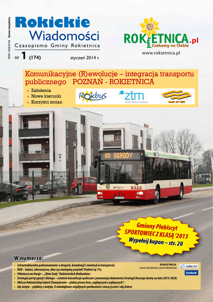 ISSN 1508-8138 Numer bezpłatny Rokickie Wiadomości Czasopismo Gminy Rokietnica nr 1 (174) styczeń 2014 r. www.rokietnica.pl Komunikacyjne (R)ewolucje – integracja transportu publicznego POZNAŃ - ROKIETNICA »» Założenia »» Nowe kierunki »» Korzyści zmian Gminny Plebiscyt SPORTOWIEC Z KLA SĄ ’201 Wypełnij kupon – st r. 20 W numerze: • • • • • • ROKIETNICA Infrastrukturalne podsumowania: o drogach, kanalizacji i rewolucji w transporcie; www.facebook.com/rokietnica NGO – balast, alternatywa, idea czy niezbędny pożytek? Podziel się 1%; Półwiecze we Dwoje – „Złote Gody” Rokietnickich Małżonków; Strategia partycypacji i dialogu – ostatnie konsultacje społeczne i prezentacja dokumentu Strategii Rozwoju Gminy na lata 2014-2020; Oblicza Rokietnickiej Galerii Championów – plebiscytowa lista „najlepszych z najlepszych”; Idą święta – pójdźmy z kolędą. O mikołajkowo-wigilijnych spotkaniach z mocą życzeń i siłą dobra; 3 Drodzy Czytelnicy! Zwyczajnie i po prostu, bez wszechobecnych ocen, recept i komentarzy. Za to spontanicznie i w pełnym blasku nadziei na lepsze – niech nadejdą Święta. Niech przełamią codzienność zabiegania, wykrzyczą bezsens wystudiowanych postaw i nieszczerości. Zadadzą kłam grze pozorów, wartościowaniu opartemu na ekwiwalencie. Niech wskrzeszą dobroć, przypomną siłę bezwarunkowego dobra, nauczą na nowo dziękować i przepraszać. Dostrzegać i ustępować. Dzielić się i zapraszać. Przemawiać wzruszeniem. Że nie są niczym odkrywczym? Że przychodząc co roku mijają nie przynosząc spodziewanego cudu? Dopóki tlą się pragnieniem oczekiwania, skłaniają do namiastki refleksji – warto. Może tym razem i na przekór sceptykom słowo stanie się ciałem i zamieszka z nami na trochę dłużej? Dziękując za kolejny rok czytelniczych spotkań, inspirujących wydarzeń, nauk i doświadczeń, podnoszonych problemów i prób ich naprawienia, przede wszystkim zaś za gotowość akceptacji dla podejmowanej z wielkim zobowiązaniem próby towarzyszenia Państwa życiu, zapraszam do lektury. Danuta Potrawiak Redaktor Naczelny „Rokickich Wiadomości” Idą święta… Darów o sile symboli i prostocie treści. Czystego piękna o barwie bieli. Naturalności gestów przełamywanych opłatkiem. Życzliwej tolerancji, pochylającej się i troskliwej. Wyrozumiałości walczącej wytrwale o kompromis z pewnością pozornych racji. Ciepła, które okala, zmienia i ostatecznie skutecznie przenika. Kolędowych oksymoronów wyśpiewanych wśród najbliższych, I szczęścia, którego nie krępuje egoizm. Sanktuarium p.w. Narodzenia NMP w Sobocie oraz Gminny Ośrodek Kultury w Rokietnicy zapraszają na IV Ogólnopolski Festiwal Kolęd i Pastorałek Sobota 2014 który odbędzie się w dniu 6 stycznia 2014 r. w Sanktuarium w Sobocie. Wszystkim Czytelnikom, Redakcja „Rokickich Wiadomości” NASZE PATRONATY: Finałowe przesłuchania rozpoczną się o godzinie 14.00. Laureatów poznamy około godziny 20.00 podczas uroczystej gali, którą uświetni niezwykły koncert w wykonaniu Zbigniewa Wodeckiego oraz laureatów. Patronat Honorowy: Wójt Gminy Rokietnica Patronat medialny: Organizator: Gminny Ośrodek Kultury w Rokietnicy Sponsorzy: www.gok.rokietnica.pl www.rokietnica.pl Plakat Kolędy i Pastorałki 2014.indd 1 Państwo Róża i Ryszard Lubka Rokickie Wiadomości Wydawca: Gmina Rokietnica Adres: ul. Golęcińska 1, 62-090 Rokietnica, tel 61-89-60-614 Redaktor naczelny: Danuta Potrawiak zaprasza codziennie w godzinach pracy Urzędu Gminy Zespół redakcyjny: Ryszard Lubka, Katarzyna Filipowiak-Łuczyńska, Anna Skrzypiec 4 stycznia 2014 roku, Restauracja „Pod Gruszą” – V Charytatywny Bal Sołtysów 6 stycznia 2014 roku, Sanktuarium Wniebowzięcia NMP w Sobocie - IV Ogólnopolski Festiwal Kolęd i Pastorałek – Sobota 2014. Gala finałowa z udziałem Zbigniewa Wodeckiego oraz Laureatów rozpocznie się około godziny 20.00. 12 stycznia 2014 roku, godzina 14.00 – 20.00, Szkoła Podstawowa im. Jana Brzechwy w Rokietnicy – XXII Finał Wielkiej Orkiestry Świątecznej Pomocy. GORĄCO ZAPRASZAMY!!! 12 stycznia 2014 roku – WIELKA ORKIESTRA ŚWIĄTECZNEJ POMOCY gra również w „BAJECZCE”! W niedzielę, 12 stycznia Przedszkole „Bajeczka” w Rokietnicy organizuje wielki Bal dla dzieci w wieku przedszkolnym. Bajeczkowa Wróżka zaprasza przedszkolaków do wspólnej zabawy, a Rodziców do przedszkolnej kawiarenki. W przerwie między kawą a ciastkiem proponujemy rodzicom aukcje: ciekawych przedmiotów oraz prac dziecięcych. „Bajeczka” czeka w godzinach 15.00 do 17.00. ZAPRASZAMY! 31 stycznia 2014 roku, godzina 18.00, Sala sołecka w Krzyszkowie - „Stopa bosa – stopa obuta. Historia ewolucji stóp i obuwia w kulturach”. Prelekcja w wykonaniu dr Katarzyny Sokołowskiej i mgr Kingi Sierżant z Wyższej Szkoły Zdrowia, Urody i Edukacji w Poznaniu. Spotkanie ma charakter otwarty, zapraszamy. 2013-12-05 15:02:15 Współpraca: Radosław Babica, Wojciech Brych-Kadziński, Maria Chojnacka, Arkadiusz Chołżyński, Karina Czyż, Andrzej Deckert, Anita Durowicz, Magdalena Dziel-Sierszuła, Katarzyna Filipowiak-Łuczyńska, Kazimierz Fryś, Grażyna Głowacka, Mariusz Grzymała, Piotr Hałas, Monika Hofman, Anna i Marek Kaniewscy, Przemysław Kiejnich, Katarzyna Kieliszek, Arkadiusz Klapiński, M. Kolasa, Wanda Koralewska, Edyta Łuckiewicz-Laskowska, Rafał Michalski, Maria Matuszczak, Joanna Miecznik-Kluczykowska, Izabela Olejniczak-Bysiewicz, Piotr Paupa, Dariusz Pawlak, Krystyna Semba, Stanisław Florian Sikorski, Piotr Stasiak, Dorota Statucka, M. Statucka, Sylwia Statucka-Magdziak, Andrzej Strażyński, Kazimierz Szulc, Emilia Świst, Ewa Welman, A. Złotnicka styczeń 2014 Redakcja zastrzega sobie prawo do skrótu i opracowywania materiałów. Za treść reklam i ogłoszeń redakcja nie odpowiada. Skład, reklamy: Studio KWADRAT tel.: 607 566 555, fax: 61 648 26 49, email: [email 