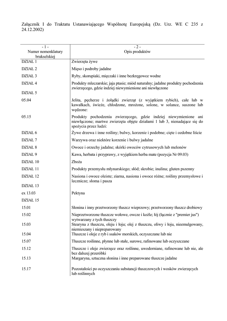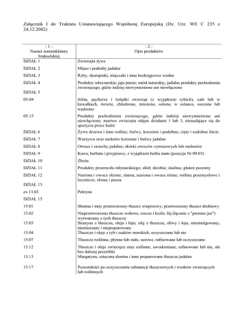 Załącznik I do Traktatu Ustanawiającego Wspólnotę Europejską (Dz. Urz. WE C 235 z 24.12.2002) -1Numer nomenklatury brukselskiej DZIAŁ 1 -2Opis produktów Zwierzęta żywe DZIAŁ 2 Mięso i podroby jadalne DZIAŁ 3 Ryby, skorupiaki, mięczaki i inne bezkręgowce wodne DZIAŁ 4 Produkty mleczarskie; jaja ptasie; miód naturalny; jadalne produkty pochodzenia zwierzęcego, gdzie indziej niewymienione ani niewłączone DZIAŁ 5 05.04 Jelita, pęcherze i żołądki zwierząt (z wyjątkiem rybich), całe lub w kawałkach, świeże, chłodzone, mrożone, solone, w solance, suszone lub wędzone: 05.15 Produkty pochodzenia zwierzęcego, gdzie indziej niewymienione ani niewłączone; martwe zwierzęta objęte działami 1 lub 3, nienadające się do spożycia przez ludzi: DZIAŁ 6 Żywe drzewa i inne rośliny; bulwy, korzenie i podobne; cięte i ozdobne liście DZIAŁ 7 Warzywa oraz niektóre korzenie i bulwy jadalne DZIAŁ 8 Owoce i orzechy jadalne; skórki owoców cytrusowych lub melonów DZIAŁ 9 Kawa, herbata i przyprawy, z wyjątkiem herba mate (pozycja Nr 09.03) DZIAŁ 10 Zboża DZIAŁ 11 Produkty przemysłu młynarskiego; słód; skrobie; inulina; gluten pszenny DZIAŁ 12 Nasiona i owoce oleiste; ziarna, nasiona i owoce różne; rośliny przemysłowe i lecznicze; słoma i pasza DZIAŁ 13 ex 13.03 Pektyna DZIAŁ 15 15.01 Słonina i inny przetworzony tłuszcz wieprzowy; przetworzony tłuszcz drobiowy 15.02 15.04 Nieprzetworzone tłuszcze wołowe, owcze i koźle; łój (łącznie z "premier jus") wytwarzany z tych tłuszczy Stearyna z tłuszczu, oleju i łoju; olej z tłuszczu, oliwy i łoju, nieemulgowany, niemieszany i niepreparowany Tłuszcze i oleje z ryb i ssaków morskich, oczyszczane lub nie 15.07 Tłuszcze roślinne, płynne lub stałe, surowe, rafinowane lub oczyszczane 15.12 Tłuszcze i oleje zwierzęce oraz roślinne, uwodorniane, rafinowane lub nie, ale bez dalszej przeróbki Margaryna, sztuczna słonina i inne preparowane tłuszcze jadalne 15.03 15.13 15.17 Pozostałości po oczyszczaniu substancji tłuszczowych i wosków zwierzęcych lub roślinnych -1Numer nomenklatury brukselskiej DZIAŁ 16 -2Opis produktów Przetwory z mięsa, ryb lub skorupiaków, mięczaków i innych bezkręgowców wodnych DZIAŁ 17 17.01 17.02 Cukier trzcinowy lub buraczany i chemicznie czysta sacharoza, w postaci stałej: Inne rodzaje cukru; syropy cukrowe; miód syntetyczny (zmieszany z naturalnym lub nie); karmel 17.03 Melasa, odbarwiona lub nie 17.05* Cukry, syropy, aromatyzowana melasa lub z dodatkiem barwników (w tym cukier waniliowy lub wanilina), z wyjątkiem soków owocowych z dodatkiem cukru w jakichkolwiek proporcjach DZIAŁ 18 18.01 Ziarna kakaowe, całe lub łamane, surowe lub palone 18.02 Kakaowe łuski, łupiny, osłonki i inne odpady z kakao DZIAŁ 20 Przetwory z warzyw, owoców, orzechów lub innych części roślin DZIAŁ 22 22.04 Moszcz winogronowy, fermentujący lub z fermentacją zatrzymaną w inny sposób niż przez dodanie alkoholu 22.05 Wino ze świeżych winogron; Wino moszcz ze świeżych winogronowy winogron; z fermentacją moszcz winogronowy zatrzymanąz fermentacją za przez dodanie alkoholu 22.07 Inne napoje na bazie fermentacji (np. jabłecznik, wino z gruszek i miód pitny) ex 22.08* ex 22.09* Alkohol etylowy, denaturowany lub nie, o jakiejkolwiek mocy, otrzymywany z produktów rolnych, o których mowa w załączniku I do Traktatu, z wyłączeniem wódek, likierów i innych napojów spirytusowych, złożone preparaty alkoholowe (znane jako „skoncentrowane ekstrakty”) do wyrobu napojów. ex 22.10* ocet i jego substytuty DZIAŁ 23 Pozostałości i odpady przemysłu spożywczego; gotowa pasza dla zwierząt DZIAŁ 24 24.01 Tytoń nieprzetworzony; odpady tytoniowe: DZIAŁ 45 45.01 Korek naturalny surowy; odpady korka; korek kruszony, granulowany lub mielony: DZIAŁ 54 54.01 DZIAŁ 57 57.01 * Len surowy lub przetworzony ale nieprzędzony; pakuły i odpady lniane (w tym skrawki workowe lub rozwłóknianie) Konopie naturalne (Cannabis sativa), surowe lub przetworzone ale nieprzędzone; pakuły i odpady z konopi naturalnych (w tym liny oraz skrawki workowe lub rozwłókniane) Pozycja dodana artykułem 1 rozporządzenia nr 7a Rady Europejskiej Wspólnoty Gospodarczej z 18 grudnia 1959 roku (Dz.U. 7 z 30.1.1961, str. 71/61).