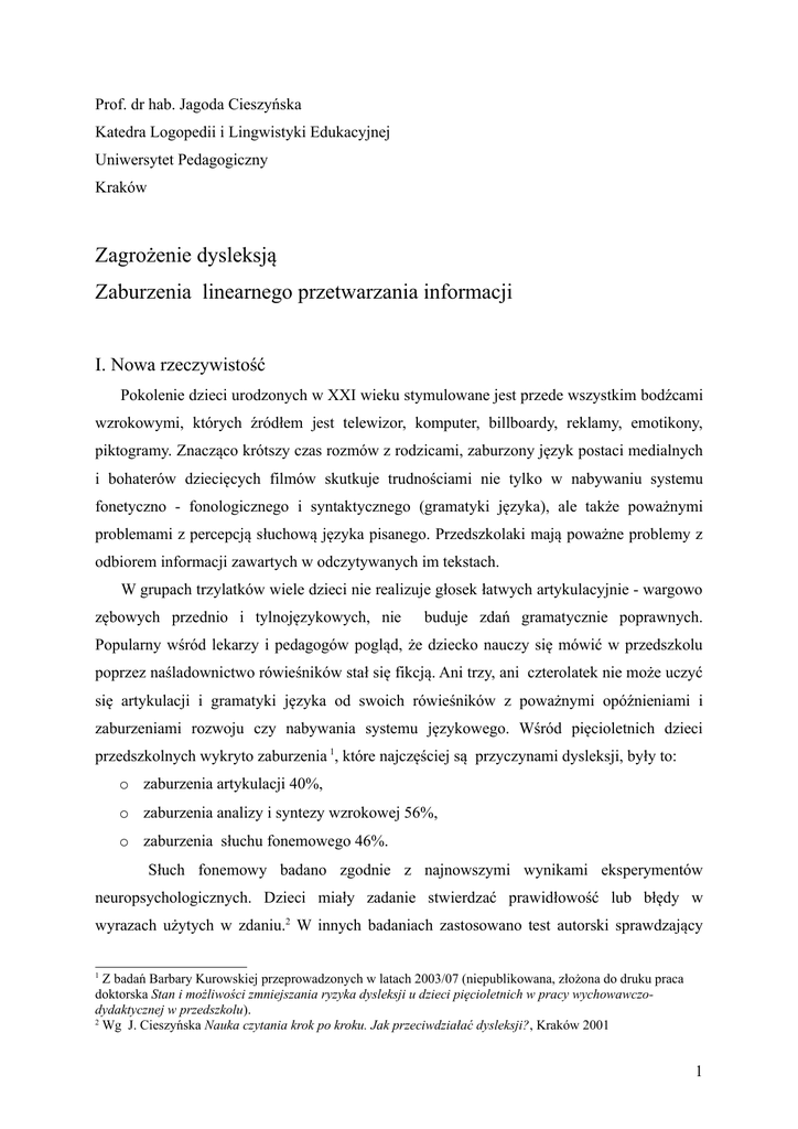 Prof. dr hab. Jagoda Cieszyńska Katedra Logopedii i Lingwistyki Edukacyjnej Uniwersytet Pedagogiczny Kraków Zagrożenie dysleksją Zaburzenia linearnego przetwarzania informacji I. Nowa rzeczywistość Pokolenie dzieci urodzonych w XXI wieku stymulowane jest przede wszystkim bodźcami wzrokowymi, których źródłem jest telewizor, komputer, billboardy, reklamy, emotikony, piktogramy. Znacząco krótszy czas rozmów z rodzicami, zaburzony język postaci medialnych i bohaterów dziecięcych filmów skutkuje trudnościami nie tylko w nabywaniu systemu fonetyczno - fonologicznego i syntaktycznego (gramatyki języka), ale także poważnymi problemami z percepcją słuchową języka pisanego. Przedszkolaki mają poważne problemy z odbiorem informacji zawartych w odczytywanych im tekstach. W grupach trzylatków wiele dzieci nie realizuje głosek łatwych artykulacyjnie - wargowo zębowych przednio i tylnojęzykowych, nie buduje zdań gramatycznie poprawnych. Popularny wśród lekarzy i pedagogów pogląd, że dziecko nauczy się mówić w przedszkolu poprzez naśladownictwo rówieśników stał się fikcją. Ani trzy, ani czterolatek nie może uczyć się artykulacji i gramatyki języka od swoich rówieśników z poważnymi opóźnieniami i zaburzeniami rozwoju czy nabywania systemu językowego. Wśród pięcioletnich dzieci przedszkolnych wykryto zaburzenia 1, które najczęściej są przyczynami dysleksji, były to: o zaburzenia artykulacji 40%, o zaburzenia analizy i syntezy wzrokowej 56%, o zaburzenia słuchu fonemowego 46%. Słuch fonemowy badano zgodnie z najnowszymi wynikami eksperymentów neuropsychologicznych. Dzieci miały zadanie stwierdzać prawidłowość lub błędy w wyrazach użytych w zdaniu.2 W innych badaniach zastosowano test autorski sprawdzający Z badań Barbary Kurowskiej przeprowadzonych w latach 2003/07 (niepublikowana, złożona do druku praca doktorska Stan i możliwości zmniejszania ryzyka dysleksji u dzieci pięcioletnich w pracy wychowawczodydaktycznej w przedszkolu). 2 Wg J. Cieszyńska Nauka czytania krok po kroku. Jak przeciwdziałać dysleksji?, Kraków 2001 1 1 percepcję fonemów opozycyjnych w sylabach. Zadaniem dzieci było orzekanie o identyczności lub jej braku w usłyszanych sylabach.3 Badania przesiewowe w grupach przedszkolnych przynoszą alarmujące wyniki, wskazujące na brak przygotowania sześciolatków do podjęcia nauki czytania i pisania. 4 Obserwowany u dzieci w wieku przedszkolnym opóźniony rozwój mowy, oraz liczne wady wymowy są spowodowane w głównej mierze: brakiem pionizacji języka, minimalnymi uszkodzeniami słuchu (alergie, katary, zapalenie ucha, hałas), powodującymi trudności w odbiorze głosek bezdźwięcznych, szczelinowych i zwartoszczelinowych, niezakończonym procesem forowania się lateralizacji stronnej, skutkującym brakiem formowania się przewagi lewej półkuli dla przetwarzania funkcji językowych, przetwarzaniem języka w strukturach prawej półkuli mózgu („prawa półkula nigdy nie jest zdolna wykonywać funkcji językowych tak dobrze jak lewa, nawet jeśli przejmie te funkcje bardzo wcześnie”5), obniżeniem prawności ruchowej, w tym praksji oralnej (błędy w karmieniu) i sprawności motorycznej (szczególnie manualnej). Rozwój poznawczy dokonuje się w ścisłym związku z kształtowaniem się funkcji motorycznych. Jeśli małe dziecko nie potrafi gryźć i żuć pokarmów, nie będzie mogło uczyć się mówić, jeśli nie skupia wzroku na twarzy dorosłego, nie będzie mogło oglądać obrazków i uczyć się rozumienia nazw przedmiotów. Jeśli nie chwyta, przeciwstawiając kciuk, nie będzie mogło manipulować przedmiotami.6 Sprawność manualna jest jednym z wyznaczników rozwoju praksji oralnej. Widać więc wyraźnie konieczność stymulacji wszystkich sfer rozwojowych. Oddzielenie funkcji poznawczych (zarówno w diagnozie, jak i terapii) nie jest możliwe. Wpływają one bowiem na siebie i wzajemnie się warunkują. Jakość funkcjonowania poznawczego i społecznego dziecka jest uzależniona od harmonijnego kształtowania się wszystkich możliwości psychicznych i fizycznych. Nie jest możliwe oceniane jednej sfery Praca magisterska napisana przez Małgorzatę Krajewską pod moim kierunkiem w latach 2008/2009, kontynuowana obecnie w ramach pracy doktorskiej. 4 Badania prowadzone pod moim kierunkiem w ramach prac magisterskich na kierunku polonistyka z logopedią oraz prac dyplomowych w latach 2006/09 na Podyplomowych Studiach Logopedycznych w Uniwersytecie Pedagogicznym w Krakowie. 5 W Budohoska., A., Grabowska , Dwie półkule jeden mózg, Warszawa 1994, s. 143 3 6 Por. J. Cieszyńska, M. Korendo, Wczesna interwencja terapeutyczna, Kraków 2008 2 bez odnoszenia jej do pozostałych (nie sposób diagnozować spostrzegania wzrokowego bez analizy rozwoju motorycznego i słuchowego). Od wielu lat mówi się i pisze o problemie zagrożenia dysleksją, zwraca uwagę na powiększającą się, z roku na rok, liczbę dzieci z trudnościami w przyswajaniu języka pisanego. Warto raz jeszcze uporządkować objawy wskazujące na możliwość wystąpienia trudności w nauce czytania i pisania. Do najczęstszych problemów wskazujących na możliwość wystąpienia zakłóceń w sekwencyjnym, linearnym porządkowaniu informacji należą: dysleksja w rodzinie (rodzice, rodzeństwo, kuzynostwo)7, padaczka u matki, zaburzenia przebiegu ciąży i porodu, wcześniactwo, dysharmonie w rozwoju psychoruchowym w okresie niemowlęcym i poniemowlęcym, leworęczność w rodzinie, skrzyżowana lateralizacja (możliwość badania ok. 3 roku życia), skrzyżowana lateralizacja u obojga rodziców, oburęczność utrzymująca się po ukończeniu 3. roku życia, trudności w ubieraniu się, problemy z porannym wstawaniem, trudności w opanowaniu jazdy na dwukołowym rowerze, kłopoty z rysowaniem, odwzorowywaniem linearnego układu klocków, problemy z naśladowaniem i układaniem sekwencji, trudności z naśladowan