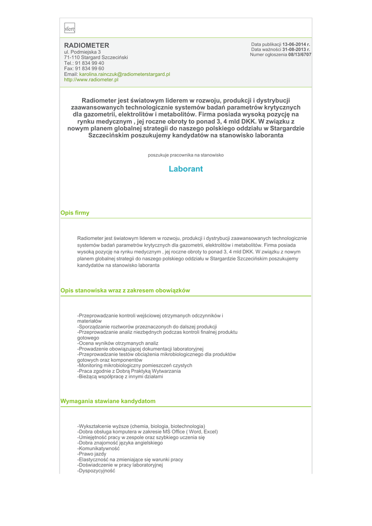 praca, oferty pracy RADIOMETER ul. Podmiejska 3 71-110 Stargard Szczeciński Tel.: 91 834 99 40 Fax: 91 834 99 60 Email: [email protected] http://www.radiometer.pl Data publikacji 13-06-2014 r. Data ważności 31-08-2013 r. Numer ogłoszenia 08/13/6707 Radiometer jest światowym liderem w rozwoju, produkcji i dystrybucji zaawansowanych technologicznie systemów badań parametrów krytycznych dla gazometrii, elektrolitów i metabolitów. Firma posiada wysoką pozycję na rynku medycznym , jej roczne obroty to ponad 3, 4 mld DKK. W związku z nowym planem globalnej strategii do naszego polskiego oddziału w Stargardzie Szczecińskim poszukujemy kandydatów na stanowisko laboranta poszukuje pracownika na stanowisko Laborant Opis firmy Radiometer jest światowym liderem w rozwoju, produkcji i dystrybucji zaawansowanych technologicznie systemów badań parametrów krytycznych dla gazometrii, elektrolitów i metabolitów. Firma posiada wysoką pozycję na rynku medycznym , jej roczne obroty to ponad 3, 4 mld DKK. W związku z nowym planem globalnej strategii do naszego polskiego oddziału w Stargardzie Szczecińskim poszukujemy kandydatów na stanowisko laboranta Opis stanowiska wraz z zakresem obowiązków -Przeprowadzanie kontroli wejściowej otrzymanych odczynników i materiałów -Sporządzanie roztworów przeznaczonych do dalszej produkcji -Przeprowadzanie analiz niezbędnych podczas kontroli finalnej produktu gotowego -Ocena wyników otrzymanych analiz -Prowadzenie obowiązującej dokumentacji laboratoryjnej -Przeprowadzanie testów obciążenia mikrobiologicznego dla produktów gotowych oraz komponentów -Monitoring mikrobiologiczny pomieszczeń czystych -Praca zgodnie z Dobrą Praktyką Wytwarzania -Bieżącą współpracę z innymi działami Wymagania stawiane kandydatom -Wykształcenie wyższe (chemia, biologia, biotechnologia) -Dobra obsługa komputera w zakresie MS Office ( Word, Excel) -Umiejętność pracy w zespole oraz szybkiego uczenia się -Dobra znajomość języka angielskiego -Komunikatywność -Prawo jazdy -Elastyczność na zmieniające się warunki pracy -Doświadczenie w pracy laboratoryjnej -Dyspozycyjność -Dyspozycyjność Oferujemy -niepowtarzalna okazja do pracy w dziedzinie technologii medycznych. -dużą samodzielność w działaniu -możliwości dalszego kształcenia i szkolenia -szereg innych świadczeń pracowniczych -atrakcyjne wynagrodzenie Forma kontaktu Zainteresowane osoby prosimy o wysyłanie CV w języku angielskim na adres [email protected] oraz o zamieszczenie w dokumentach aplikacyjnych zgody na temat przetwarzania danych osobowych. W temacie wiadomości proszę wpisać nazwę stanowiska. Informacje dodatkowe Minimalne wykształcenie: wyższe Branża: Inżynieria i technologia chemiczna Forma zatrudnienia: umowa o pracę Wymiar pracy: pełny etat Wynagrodzenie (netto): nie podano Lokalizacja: Polska Województwo: zachodniopomorskie, Miejsce pracy miasto(a) lub kraj(e): Stargard Szczeciński Prawo jazdy: tak Znajomość języka obcego: tak Ogłoszenie pochodzi z portalu www.i-praca.pl - Internetowy Portal Pracy ilość wyświetleń: 4438