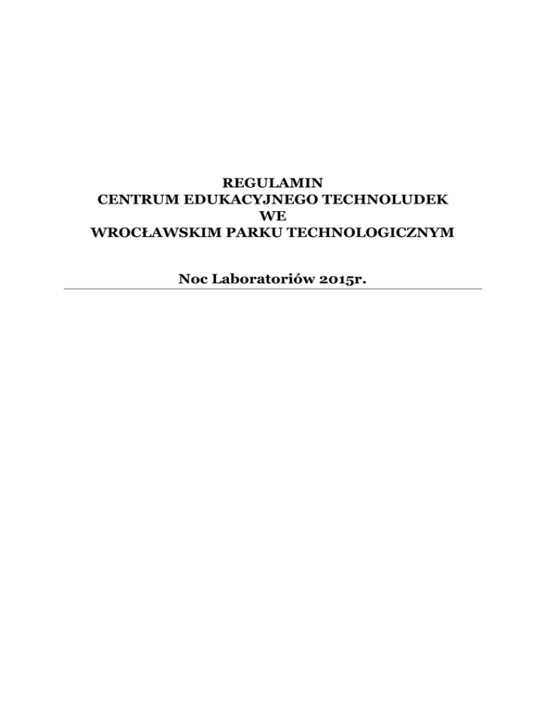 REGULAMIN CENTRUM EDUKACYJNEGO TECHNOLUDEK WE WROCŁAWSKIM PARKU TECHNOLOGICZNYM Noc Laboratoriów 2015r. §1 POSTANOWIENIA OGÓLNE 1.Regulamin określa zasady korzystania z Centrum Edukacyjnego „Technoludek”, w tym prawa i obowiązki Uczestników. 2. Ilekroć w Regulaminie jest mowa o: 1) Regulamin - należy przez to rozumieć poniższy regulamin korzystania z Centrum Edukacyjnego „Technoludek” we Wrocławskim Parku Technologicznym; 2) Centrum Edukacyjne - należy przez to rozumieć Centrum Edukacyjne „Technoludek” we Wrocławskim Parku Technologicznym; 3) Uczestnik - osoba fizyczna, która jest uczestnikiem warsztatów w Centrum Edukacyjnym „Technoludek”; 4) Warsztat - należy przez to rozumieć wyodrębnioną część treści tworzącą spójną całość pod względem merytorycznym. §2 ZASADY UDZIAŁU W WARSZTATACH 1. Udział w warsztatach organizowanych przez Centrum Edukacyjne w ramach I Nocy Laboratoriów jest bezpłatny pod warunkiem wcześniejszego, elektronicznego zgłoszenia na adres e-mail: [email protected]. 2. Udział w warsztatach organizowanych w ramach I Nocy Laboratoriów przez Centrum Edukacyjne jest równoznaczne z zapoznaniem się z niniejszym Regulaminem oraz wyrażeniem zgody na przestrzeganie jego postanowień. 3. Podczas warsztatów nie należy prowadzić rozmów przez telefony komórkowe, zaleca się ich wyłączenie przed rozpoczęciem warsztatów. 4. Podczas warsztatów zabrania się: 1) dokonywania jakiejkolwiek rejestracji obrazu, dźwięku bez zgody pracownika Centrum Edukacyjnego; 2) zachowania zakłócającego innym Uczestnikom udział w warsztatach. 5. Uczestnik przebywający w Centrum Edukacyjnym powinien zachowywać w sposób nie szkodzący i nie zagrażający innym Uczestnikom. 6. Obowiązkiem Uczestników jest: 1) przestrzeganie niniejszego Regulaminu, 2) przestrzeganie zasad bezpieczeństwa przy korzystaniu z wyposażenia Centrum Edukacyjnego oraz porządkowych obowiązujących na terenie Centrum, 3) przestrzegania zasad współżycia w grupie, 4) wykorzystywania sprzętu i pomocy dydaktycznych zgodnie z postanowieniami Regulaminu. 7. Na terenie Centrum Edukacyjnego wraz z przyległymi pomieszczeniami obowiązuje bezwzględny zakaz: 1) 2) przebywania osób trzecich w czasie prowadzenia warsztatów, wstępu osób w stanie wskazującym na spożycie alkoholu lub użycie wszelkiego rodzaju środków odurzających, 3) spożywania alkoholu i innych środków odurzających oraz palenie tytoniu, 4) wstępu do pomieszczeń niebędących salami warsztatowymi, 5) używania jakichkolwiek źródeł ognia, 6) zaśmiecania sali i przyległych pomieszczeń, 7) wnoszenia niebezpiecznych przedmiotów w postaci: świec dymnych, wyrobów pirotechnicznych, materiałów pożarowo niebezpiecznych, substancji żrących, farbujących lub powodujących zanieczyszczenia. 8. Uczestnicy biorący udział w warsztatach pozostają pod opieką nauczycieli, opiekunów prawnych lub rodziców. 9. W przypadku niedochowania któregokolwiek z powyższych zakazów jak również innych przepisów niniejszego Regulaminu, naruszania przez Uczestnika porządku publicznego lub stwarzania zagrożenia dla pozostałych osób biorących udział w warsztatach, Uczestnik może liczyć się z natychmiastową koniecznością opuszczenia Centrum Edukacyjnego. §3 ZASADY KORZYSTANIA ZE SPRZĘTU I URZADZEŃ 1. Korzystając ze sprzętu i urządzeń Uczestnik zobowiązany jest do jego używania zgodnie z przeznaczeniem oraz zasadami BHP i Ppoż. 2. Centrum Edukacyjne nie ponosi odpowiedzialności za stan techniczny i bezpieczeństwo sprzętu nie będącego jego własnością. 3. O wszystkich zauważonych uszkodzeniach sprzętu, wyposażenia, urządzeń oraz występujących zagrożeniach należy natychmiast powiadomić pracownika Centrum Edukacyjnego. 4. Uczestnicy niszczący sprzęt lub wyposażenie Centrum Edukacyjnego ponoszą pełną odpowiedzialność materialną za wyrządzone szkody. 5. Osoby wskazane w § 2 ust. 4 mogą zostać obciążone pełną lub częściową odpłatnością za zniszczony lub uszkodzony sprzęt przez Uczestników pozostających pod ich opieką. §4 OBOWIĄZKI CENTRUM EDUKACYJNEGO 1. Do obowiązków Centrum Edukacyjnego należy w szczególności: 1) zapewnienie pełnego bezpieczeństwa Uczestnikom warsztatów. 2) respektowanie postanowień Regulaminu oraz zapewnienie ładu i porządku przed rozpoczęciem warsztatów, w czasie ich trwania oraz po zakończeniu imprezy. §5 POSTANOWIENIA KOŃCOWE 1. W kwestiach nieuregulowanych niniejszym Regulaminem mają zastosowanie odpowiednie przepisy prawa. 2. Sądem właściwym do rozstrzygania ewentualnych sporów między Uczestnikiem, a Centrum Edukacyjnym jest sąd właściwy miejscowo i rzeczowo dla siedziby Centrum Edukacyjnego. 3. Regulamin wchodzi w życie w dniu 01.07.2015. 4. Centrum Edukacyjne nie ponosi odpowiedzialności za pozostawione lub zgubione na terenie Centrum Edukacyjnego rzeczy osobiste, dokumenty, pieniądze.