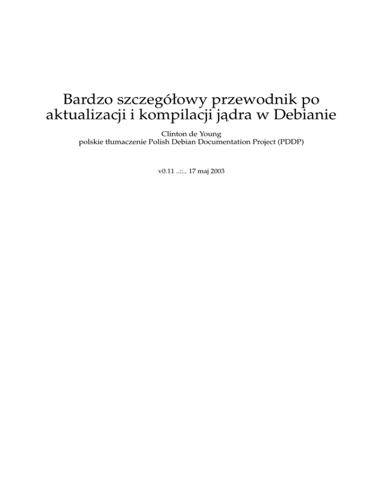 Bardzo szczegółowy przewodnik po aktualizacji i kompilacji jadra ˛ w Debianie Clinton de Young polskie tłumaczenie Polish Debian Documentation Project (PDDP) v0.11 ..::.. 17 maj 2003 Prawa autorskie Copyright © 2002, 2003 Clinton De Young Copyright © polskie tłumaczenie Polish Debian Documentation Project (PDDP) Dokument przetłumaczony przez grup˛e Polish Debian Documentation Project (http://debian. linux.org.pl). Polskie tłumaczenie tego przewodnika jest obj˛ete licencja˛ GNU FDL (Free Documentation License). Został on napisany w nadziei, że b˛edzie użyteczny dla społeczności użytkowników Debiana, ale nie udziela si˛e na niego żadnej gwarancji; używaj go wyłacznie ˛ na własne ryzyko. i Spis treści 1 2 3 Przedsłowie 1 1.1 O autorze . . . . . . . . . . . . . . . . . . . . . . . . . . . . . . . . . . . . . . . . . . 1 1.2 Tłumaczenie . . . . . . . . . . . . . . . . . . . . . . . . . . . . . . . . . . . . . . . . 1 Wprowadzenie, pobieranie jadra ˛ 3 2.1 Wst˛ep . . . . . . . . . . . . . . . . . . . . . . . . . . . . . . . . . . . . . . . . . . . . 3 2.2 Wprowadzenie, pobieranie jadra ˛ . . . . . . . . . . . . . . . . . . . . . . . . . . . . 3 2.3 Oczekiwania . . . . . . . . . . . . . . . . . . . . . . . . . . . . . . . . . . . . . . . . 3 2.4 Pobieranie nowego jadra ˛ . . . . . . . . . . . . . . . . . . . . . . . . . . . . . . . . . 4 Budowanie jadra ˛ krok po kroku, wymagania 7 3.1 Przygotowanie źródeł jadra ˛ 2.4.20 . . . . . . . . . . . . . . . . . . . . . . . . . . . 7 3.1.1 Krok 1: Otwórz okno terminala . . . . . . . . . . . . . . . . . . . . . . . . . 8 3.1.2 Krok 2: Przejdź do katalogu do którego zapisałeś plik linux-2.4.20.tar.gz 3.1.3 Krok 3: Zaloguj si˛e jako administrator używajac ˛ su . . . . . . . . . . . . . 8 3.1.4 Krok 4: Przenieś plik linux-2.4.20.tar.gz do katalogu /usr/src . 8 3.1.5 Krok 5: Sprawdź katalog /usr/src . . . . . . . . . . . . . . . . . . . . . . 8 3.1.6 Krok 6: Rozpakuj plik linux-2.4.20.tar.gz . . . . . . . . . . . . . . . 10 3.1.7 Krok 7: Utwórz dowiazanie ˛ symboliczne o nazwie linux wskazujace ˛ na linux-2.4.20 . . . . . . . . . . . . . . . . . . . . . . . . . . . . . . . . . . 10 3.2 4 Pliki potrzebne do konfiguracji i kompilacji jadra ˛ . . . . . . . . . . . . . . . . . . . 10 Konfiguracja jadra ˛ 11 4.1 Uruchamianie narz˛edzia do konfiguracji jadra ˛ . . . . . . . . . . . . . . . . . . . . 11 4.2 Konfiguracja jadra ˛ Linuksa . . . . . . . . . . . . . . . . . . . . . . . . . . . . . . . 12 8 SPIS TREŚCI 5 6 7 Konfiguracja jadra ˛ do obsługi dźwi˛eku, ext3 i nagrywarek ii 15 5.1 Konfiguracja jadra ˛ do obsługi dźwi˛eku . . . . . . . . . . . . . . . . . . . . . . . . 15 5.2 Konfiguracja Debiana do obsługi nagrywarek . . . . . . . . . . . . . . . . . . . . . 15 5.3 Właczanie ˛ obsługi systemu plików Ext3 (Chcesz to zrobić!) . . . . . . . . . . . . . 17 Kompilacja, instalacja jadra ˛ 19 6.1 Zapisywanie konfiguracji jadra ˛ i kompilacja . . . . . . . . . . . . . . . . . . . . . . 19 6.2 Instalacja nowego jadra ˛ . . . . . . . . . . . . . . . . . . . . . . . . . . . . . . . . . . 20 Ext3, rozwiazywanie ˛ problemów, zakończenie 21 7.1 Ustawianie komputera by używał systemu plików z ksi˛egowaniem Ext3 . . . . . 21 7.2 Co jeśli coś pójdzie nie tak? . . . . . . . . . . . . . . . . . . . . . . . . . . . . . . . 23 7.3 Zakończenie . . . . . . . . . . . . . . . . . . . . . . . . . . . . . . . . . . . . . . . . 23 1 Rozdział 1 Przedsłowie 1.1 O autorze Nazywam si˛e Clinton De Young i pracuj˛e jako Development Manager dla firmy programistycznej Altiris. Biegle władam angielskim oraz płynnie japońskim. W wolnym czasie tłumacz˛e dokumenty z i na j˛ezyk japoński a czasami współpracuj˛e z różnymi firmami w pisaniu programów na rynek japoński. Pomimo tego wszystkiego, na pierwszym miejscu stawiam rodzin˛e. Sa˛ oni najważniejszymi ludźmi w moim życiu. ( Adres oryginalnego artykułu http://www.osnews.com/story.php?news_id=2949 ) 1.2 Tłumaczenie Do powstania polskiej wersji j˛ezykowej tego dokumentu przyczynili si˛e nast˛epujacy ˛ członkowie grupy PDDP: Tłumaczenia: • Bartosz Feński <[email protected]> Korekta: • Oskar Ostafin Wi˛ecej o grupie PDDP możesz dowiedzieć si˛e na naszej oficjalnej stronie http://debian. linux.org.pl Rozdział 1. Przedsłowie 2 3 Rozdział 2 Wprowadzenie, pobieranie jadra ˛ 2.1 Wst˛ep Jeśli czytasz ten artykuł to zakładam, że wiesz czym jest Jadro ˛ Linuksa (http://www.kernel. org) i dlaczego mógłbyś chcieć je zaktualizować. Jednakże, jeśli dziwnym trafem czytasz ten przewodnik, a po prostu używasz Linuksa i nie masz poj˛ecia czym jest jadro ˛ (kernel) i dlaczego miałbyś je aktualizować, to nast˛epne dwa paragrafy sa˛ dla Ciebie (jeśli szukasz mniej szczegółowej instrukcji aktualizacji jadra ˛ na jakiejkolwiek dystrybucji kliknij tutaj (http:// www.osnews.com/story.php?news_id=443). Najprościej ujmujac ˛ jadro ˛ Linuksa to mózg systemu. Mówi systemowi jakie systemy plików, sprz˛et, protokoły itd., sa˛ obsługiwane. Oczywiście robi jeszcze wiele innych rzeczy, ale na razie taka mała definicja nam wystarczy. 2.2 Wprowadzenie, pobieranie jadra ˛ Moje podzi˛ekowania Zanim zaczniemy, chciałem serdecznie podzi˛ekować wszystkim ludziom, za odzew po moim ostatnim artykule Bardzo Szczegółowy Przewodnik po Instalacji Debiana 3.0 (http://www. osnews.com/story.php?news_id=2016). Jestem wdzi˛eczny za wglad, ˛ poprawki i komentarze. Chciałem również przeprosić, za opóźnienie zwiazane ˛ z tym artykułem. Moje życie przeszło wiele zawirowań w ostatnich kilku miesiacach. ˛ Ciesz˛e si˛e, że ostatecznie znowu jestem w formie. 2.3 Oczekiwania Dlaczego mógłbyś chcieć bawić si˛e z jadrem? ˛ No cóż, wszyscy ludzie (b˛edacy ˛ troszk˛e ponad zwykłymi śmiertelnikami i madrzejsi ˛ ode mnie), którzy nieustannie pracuja˛ nad jadrem, ˛ dodaja˛ do niego obsług˛e nowego sprz˛etu,