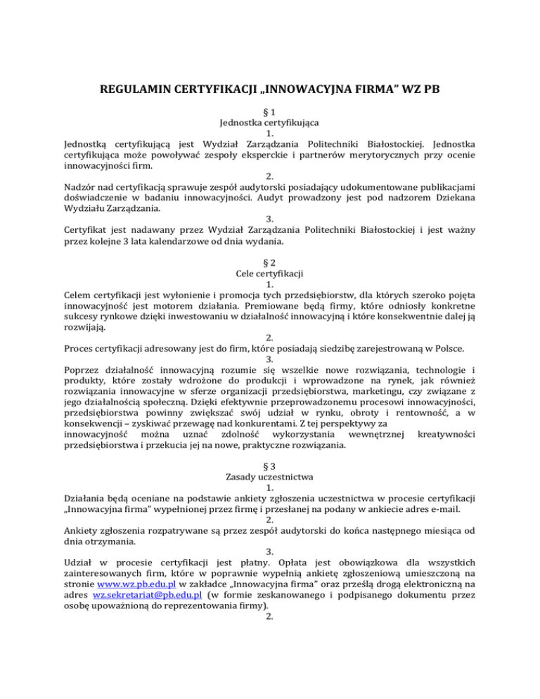 REGULAMIN CERTYFIKACJI „INNOWACYJNA FIRMA” WZ PB §1 Jednostka certyfikująca 1. Jednostką certyfikującą jest Wydział Zarządzania Politechniki Białostockiej. Jednostka certyfikująca może powoływać zespoły eksperckie i partnerów merytorycznych przy ocenie innowacyjności firm. 2. Nadzór nad certyfikacją sprawuje zespół audytorski posiadający udokumentowane publikacjami doświadczenie w badaniu innowacyjności. Audyt prowadzony jest pod nadzorem Dziekana Wydziału Zarządzania. 3. Certyfikat jest nadawany przez Wydział Zarządzania Politechniki Białostockiej i jest ważny przez kolejne 3 lata kalendarzowe od dnia wydania. §2 Cele certyfikacji 1. Celem certyfikacji jest wyłonienie i promocja tych przedsiębiorstw, dla których szeroko pojęta innowacyjność jest motorem działania. Premiowane będą firmy, które odniosły konkretne sukcesy rynkowe dzięki inwestowaniu w działalność innowacyjną i które konsekwentnie dalej ją rozwijają. 2. Proces certyfikacji adresowany jest do firm, które posiadają siedzibę zarejestrowaną w Polsce. 3. Poprzez działalność innowacyjną rozumie się wszelkie nowe rozwiązania, technologie i produkty, które zostały wdrożone do produkcji i wprowadzone na rynek, jak również rozwiązania innowacyjne w sferze organizacji przedsiębiorstwa, marketingu, czy związane z jego działalnością społeczną. Dzięki efektywnie przeprowadzonemu procesowi innowacyjności, przedsiębiorstwa powinny zwiększać swój udział w rynku, obroty i rentowność, a w konsekwencji – zyskiwać przewagę nad konkurentami. Z tej perspektywy za innowacyjność można uznać zdolność wykorzystania wewnętrznej kreatywności przedsiębiorstwa i przekucia jej na nowe, praktyczne rozwiązania. §3 Zasady uczestnictwa 1. Działania będą oceniane na podstawie ankiety zgłoszenia uczestnictwa w procesie certyfikacji „Innowacyjna firma” wypełnionej przez firmę i przesłanej na podany w ankiecie adres e-mail. 2. Ankiety zgłoszenia rozpatrywane są przez zespół audytorski do końca następnego miesiąca od dnia otrzymania. 3. Udział w procesie certyfikacji jest płatny. Opłata jest obowiązkowa dla wszystkich zainteresowanych firm, które w poprawnie wypełnią ankietę zgłoszeniową umieszczoną na stronie www.wz.pb.edu.pl w zakładce „Innowacyjna firma” oraz prześlą drogą elektroniczną na adres [email protected] (w formie zeskanowanego i podpisanego dokumentu przez osobę upoważnioną do reprezentowania firmy). 2. Jednostka certyfikująca nie ponosi odpowiedzialności za nieprawdziwość danych nadesłanych przez uczestników Certyfikacji. 4. Jednostka certyfikująca zastrzega sobie prawo do wyrywkowej weryfikacji prawdziwości przedstawionych informacji ze strony firm. §4 Zasady Oceny 1. Procedura oceny innowacyjności firmy obejmuje zakresem 2 lata działalności firmy przed terminem złożenia wniosku. 2. Ocena merytoryczna będzie mieć przebieg dwustopniowy. Nadesłane zgłoszenia przechodzą analizę zgodności z wymogami formalnymi. Następnie audytorzy niezależnie od siebie nadają punkty poszczególnym kryteriom. Wymagane jest uzyskanie minimum 50% możliwych do uzyskania punktów. Certyfikujący może przeprowadzić wyrywkową weryfikację zgłoszenia oraz wezwać zgłaszającego do przedstawienia dodatkowych wyjaśnień/informacji. 3. Kryteriami oceny w procesie certyfikacji „Innowacyjna firmy” są kategorie: A – Inwestycje w środki trwałe i wartości niematerialne i prawne, B – Innowacyjny produkt, C – Innowacyjna usługa, D – Inne innowacje. Poszczególnym kryteriom przyznawana jest ocena punktowa według tabeli: Kategoria A - Inwestycje w środki trwałe i wartości niematerialne i prawne w postaci zrealizowanych lub rozpoczętych inwestycji (maksymalnie 20 punktów) Kryterium a) zrealizowane inwestycje oraz inwestycje rozpoczęte w środki trwałe i/lub w wartości niematerialne i prawne b) wprowadzone rozwiązania i funkcjonalności w ramach wdrożeń telco i/lub IT rozliczane na podstawie opłat abonamentowych c) wprowadzone rozwiązania telco i/lub IT, które działają w modelu tzw. „chmury" d) wdrożenie nowych i/lub istotnie ulepszonych produktów lub usług - innowacja produktowa e) zastosowanie nowej metody marketingowej obejmującej znaczące zmiany w projekcie/konstrukcji produktu lub opakowaniu, dystrybucji, promocji lub strategii cenowej innowacja marketingowa f) zastosowanie nowych i/lub istotnie ulepszonych metod produkcji wyrobów i/lub świadczenia usług - innowacja procesowa g) wdrożenie nowych lub istotnie ulepszonych metod organizacyjnych w przyjętych przez firmę zasadach działania, w organizacji miejsca pracy lub w stosunkach z otoczeniem - innowacja organizacyjna h) korzystanie z dotacji unijnych wspomagających rozwój ogólny firmy i/lub wdrażanie w firmie innowacji i) prowadzenie prac badawczo-rozwojowych przez pracowników firmy lub we współpracy z innymi podmiotami zewnętrznymi j) inne kryteria - zmniejszenie działalnością firmy negatywnego wpływu na środowisko; posiadanie certyfikowanego systemu jakości m.in. ISO; przyznane firmie nagrody i wyróżnienia B - Kategoria „Innowacyjny produkt" (maksymalnie 10 punktów) Kryterium a) wdrożenie nowego i/lub istotnie ulepszonego produktu - innowacja produktowa b) skala/zasięg innowacyjności produktu według firmy c) przyznane nagrody, wyróżnienia, certyfikaty dotyczące nowego i/lub istotnie ulepszonego produktu C - Kategoria „Innowacyjna usługa" (maksymalnie 10 punktów) Kryterium a) wdrożenie nowej i/lub istotnie ulepszonej usługi - innowacja produktowa b) skala/zasięg innowacyjności usługi według firmy c) przyznane nagrody, wyróżnienia, certyfikaty dotyczące nowej i/lub istotnie ulepszonej usługi D - Kategoria „Inne innowacje” (maksymalnie 20 punktów) Kryterium a) problemy i wyzwania z obszaru telco i/lub IT, które stały się inspiracją do przeprowadzenia wdrożenia b) opis zast