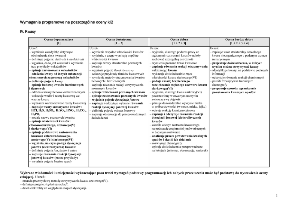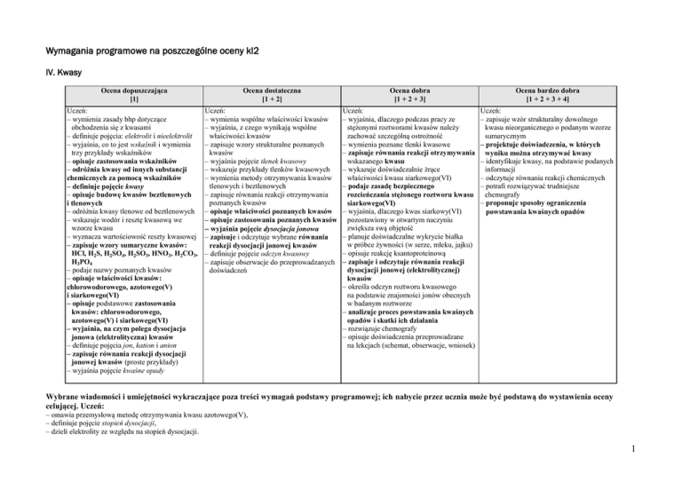 Wymagania programowe na poszczególne oceny kl2 IV. Kwasy Ocena dopuszczająca [1] Ocena dostateczna [1 + 2] Ocena dobra [1 + 2 + 3] Ocena bardzo dobra [1 + 2 + 3 + 4] Uczeń: – wymienia zasady bhp dotyczące obchodzenia się z kwasami – definiuje pojęcia: elektrolit i nieelektrolit – wyjaśnia, co to jest wskaźnik i wymienia trzy przykłady wskaźników – opisuje zastosowania wskaźników – odróżnia kwasy od innych substancji chemicznych za pomocą wskaźników – definiuje pojęcie kwasy – opisuje budowę kwasów beztlenowych i tlenowych – odróżnia kwasy tlenowe od beztlenowych – wskazuje wodór i resztę kwasową we wzorze kwasu – wyznacza wartościowość reszty kwasowej – zapisuje wzory sumaryczne kwasów: HCl, H2S, H2SO4, H2SO3, HNO3, H2CO3, H3PO4 – podaje nazwy poznanych kwasów – opisuje właściwości kwasów: chlorowodorowego, azotowego(V) i siarkowego(VI) – opisuje podstawowe zastosowania kwasów: chlorowodorowego, azotowego(V) i siarkowego(VI) – wyjaśnia, na czym polega dysocjacja jonowa (elektrolityczna) kwasów – definiuje pojęcia jon, kation i anion – zapisuje równania reakcji dysocjacji jonowej kwasów (proste przykłady) – wyjaśnia pojęcie kwaśne opady Uczeń: – wymienia wspólne właściwości kwasów – wyjaśnia, z czego wynikają wspólne właściwości kwasów – zapisuje wzory strukturalne poznanych kwasów – wyjaśnia pojęcie tlenek kwasowy – wskazuje przykłady tlenków kwasowych – wymienia metody otrzymywania kwasów tlenowych i beztlenowych – zapisuje równania reakcji otrzymywania poznanych kwasów – opisuje właściwości poznanych kwasów – opisuje zastosowania poznanych kwasów wyjaśnia pojęcie dysocjacja jonowa – zapisuje i odczytuje wybrane równania reakcji dysocjacji jonowej kwasów – definiuje pojęcie odczyn kwasowy – zapisuje obserwacje do przeprowadzanych doświadczeń Uczeń: – wyjaśnia, dlaczego podczas pracy ze stężonymi roztworami kwasów należy zachować szczególną ostrożność – wymienia poznane tlenki kwasowe – zapisuje równania reakcji otrzymywania wskazanego kwasu – wykazuje doświadczalnie żrące właściwości kwasu siarkowego(VI) – podaje zasadę bezpiecznego rozcieńczania stężonego roztworu kwasu siarkowego(VI) – wyjaśnia, dlaczego kwas siarkowy(VI) pozostawiony w otwartym naczyniu zwiększa swą objętość – planuje doświadczalne wykrycie białka w próbce żywności (w serze, mleku, jajku) – opisuje reakcję ksantoproteinową – zapisuje i odczytuje równania reakcji dysocjacji jonowej (elektrolitycznej) kwasów – określa odczyn roztworu kwasowego na podstawie znajomości jonów obecnych w badanym roztworze – analizuje proces powstawania kwaśnych opadów i skutki ich działania – rozwiązuje chemografy – opisuje doświadczenia przeprowadzane na lekcjach (schemat, obserwacje, wniosek) Uczeń: – zapisuje wzór strukturalny dowolnego kwasu nieorganicznego o podanym wzorze sumarycznym – projektuje doświadczenia, w których wyniku można otrzymywać kwasy – identyfikuje kwasy, na podstawie podanych informacji – odczytuje równania reakcji chemicznych – potrafi rozwiązywać trudniejsze chemografy – proponuje sposoby ograniczenia powstawania kwaśnych opadów Wybrane wiadomości i umiejętności wykraczające poza treści wymagań podstawy programowej; ich nabycie przez ucznia może być podstawą do wystawienia oceny celującej. Uczeń: – omawia przemysłową metodę otrzymywania kwasu azotowego(V), – definiuje pojęcie stopień dysocjacji, – dzieli elektrolity ze względu na stopień dysocjacji. 1 V. Wodorotlenki Ocena dopuszczająca [1] Ocena dostateczna [1 + 2] Ocena dobra [1 + 2 + 3] Ocena bardzo dobra [1 + 2 + 3 + 4] Uczeń: – wymienia zasady bhp dotyczące obchodzenia się z zasadami – odróżnia zasady od innych substancji chemicznych za pomocą wskaźników – definiuje pojęcia wodorotlenek i zasada – opisuje budowę wodorotlenków – podaje wartościowość grupy wodorotlenowej – zapisuje wzory sumaryczne wodorotlenków: NaOH, KOH, Ca(OH)2, Al(OH)3 – opisuje właściwości oraz zastosowania wodorotlenków: sodu, potasu i wapnia – wyjaśnia, na czym polega dysocjacja jonowa (elektrolityczna) zasad – zapisuje równania dysocjacji jonowej zasad (proste przykłady) podaje nazwy jonów powstałych w wyniku – odróżnia zasady od kwasów za pomocą wskaźników – wymienia rodzaje odczynu roztworów – określa zakres pH i barwy wskaźników dla poszczególnych odczynów Uczeń: – wymienia wspólne właściwości zasad – wyjaśnia, z czego wynikają wspólne właściwości zasad – definiuje pojęcie tlenek zasadowy – podaje przykłady tlenków zasadowych – wymienia dwie główne metody otrzymywania wodorotlenków – zapisuje równania reakcji otrzymywania wodorotlenku sodu, potasu i wapnia – wyjaśnia pojęcia woda wapienna, wapno palone i wapno gaszone – określa rozpuszczalność wodorotlenków na podstawie tabeli rozpuszczalności – odczytuje proste równania dysocjacji jonowej (elektrolitycznej) zasad – definiuje pojęcie odczyn zasadowy – omawia skalę pH – bada odczyn i pH roztworu – zapisuje obserwacje do przeprowadzanych doświadczeń Uczeń: – rozróżnia pojęcia wodorotlenek i zasada – wymienia przykłady wodorotlenków i zasad – wyjaśnia, dlaczego podczas pracy z zasadami należy zachować szczególną ostrożność – wymienia poznane tlenki zasadowe – zapisuje równania reakcji otrzymywania wybranego wodorotlenku – planuje doświadczenia, w których wyniku, można otrzymać wodorotlenek: sodu, potasu lub wapnia – planuje sposób otrzymywania wodorotlenków trudno rozpuszczalnych – zapisuje i odczytuje równania dysocjacji jonowej (elektrolitycznej) zasad – określa odczyn roztworu zasadowego na podstawie znajomości jonów obecnych w badanym roztworze – rozwiązuje chemografy – opisuje doświadczenia przeprowadzane na lekcjac