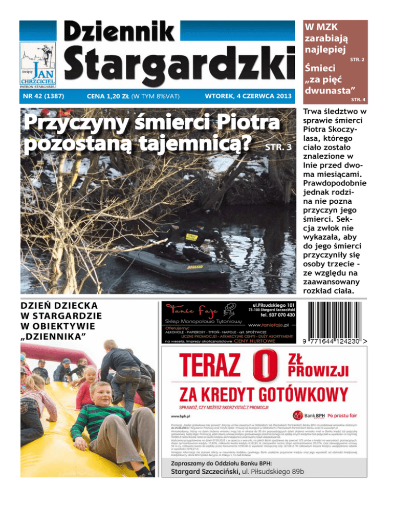 W MZK zarabiają najlepiej STR. 2 NR 42 (1387) CENA 1,20 ZŁ (W TYM 8%VAT) WTOREK, 4 CZERWCA 2013 Przyczyny śmierci Piotra pozostaną tajemnicą? STR. 3 DZIEŃ DZIECKA W STARGARDZIE W OBIEKTYWIE „DZIENNIKA” Śmieci „za pięć dwunasta” STR. 4 Trwa śledztwo w sprawie śmierci Piotra Skoczylasa, którego ciało zostało znalezione w Inie przed dwoma miesiącami. Prawdopodobnie jednak rodzina nie pozna przyczyn jego śmierci. Sekcja zwłok nie wykazała, aby do jego śmierci przyczyniły się osoby trzecie ze względu na zaawansowany rozkład ciała. 2 NR 47 (1387) 04.06.2013 RAPORT DS SPRAWDŹ, ILE ZAROBILI... CYKL „DZIENNIKA STARGARDZKIEGO”, CZĘŚĆ 6 W MZK zarabia się najlepiej Tradycyjnie najbardziej majętnym dyrektorem pozostaje Jan Gumuła, zarządzający stargardzkim MZK, który łącznie z dodatkowymi źródłami zarobił w ubiegłym roku ponad 155 tys. zł. Nie należy on jednak do najbardziej oszczędnych. Gorzej wynagradzani są dyrektorzy instytucji kulturalnych i sportowych. IRENEUSZ ZIEMBICKI, DYREKTOR SCK Dyrektor Stargardzkiego Centrum Kultury zarobił w ubiegłym roku 100 380,34 zł. Zgromadził 38 tys. zł oszczędności, co stanowi wspólnotę majątkową. Ponadto posiada 2070 akcji w Enea S.A., które otrzymał w spadku. Są one warte 32 561,10 zł i należą do odrębnego majątku dyrektora. Gospodarz SCK posiada dwa mieszkania: o powierzchni 57,80 m kw., warte 189 tys. zł oraz 47,6 m kw., warte 150 tys. zł. Pierwsze z nich stanowi wspólnotę majątkową, drugie jest majątkiem odrębnym. Jest też trzecie mieszkanie – 48 m kw., w którym Ireneusz Ziembicki ma 1/6 udziałów. Posiada ponadto gospodarstwo rolne o powierzchni 1,19 ha, warte 16 100 zł. OGŁOSZENIE Zarząd O/R Polskiego Związku Emerytów, Rencistów i Inwalidów oraz Klub Seniora informują, że w CZERWCU 2013 r. organizują: 05.06.13 - Spotkanie tematyczne w DKK, godz.11.00 06.06.13 - Wyjazd na Lagunę ze Starówki, godz. 9.00 07.06.13 - Wyjazd nad morze - Międzyzdroje, godz. 8.00 z Pl. Wolności 12.06.13 - Spotkanie integracyjne w DKK, godz. 11.00 13.06.13 - Wyjazd na Lagunę ze Starówki, godz. 9.00 14.06.13 - Wyjazd nad morze - Międzywodzie, godz. 8.00 z Pl. Wolności 19.06.13 - ,,Powitanie lata” - piknik w Morzyczynie - wyjazd z Placu Wolności o godz. 11.00 20.06.13 - Wyjazd na Lagunę ze Starówki, godz. 9.00 21.06.13 - Wyjazd nad morze – Dziwnów, godz. 8.00 z Pl. Wolności 26.06.13 - Zajęcia psychoedukacyjne godz.11.00 w DKK 27.06.13 - Wyjazd na Lagunę ze Starówki, godz. 9.00 28.06.13 - Wyjazd nad morze – Pobierowo, godz. 8.00 z Pl. Wolności KLUB SENIORA Wtorek - koło brydżowe, godz. 10.00-13.00 – J. Świątek Środa - chór, godz. 9.30-10.30 – Mieczysław Smółka Środa - zajęcia taneczne, godz. 13.00-14.00 - Marek Sienkiewicz Czwartek - koło robótek, godz. 10.00-12.00 - Urszula Malesa Czwartek - zajęcia literackie, godz. 12.00 - T. Tyszkiewicz Z A J Ę C I A R E H A B I L I TA C Y J N E Ćwiczenia na basenie: w SP 5 - piątek, godz. 14.30; OSIR - wtorek, godz. 14:30 Ćwiczenia rehabilitacyjne w galerii Starówka - według ustaleń wewnętrznych. Rehabilitacja w grocie solnej - czas dowolny U WA G A ! Zapraszamy na: - 10-dniowe wczasy w Pokrzywnie we wrześniu - wycieczka Niepokalanów - Warszawa, 26.06-01.07.13 Zapisy w biurze ul. Szczecińska 17 tel. 91-834-52-22 Nasza strona internetowa: www. pzeri.stargard.pl DANUTA BOJARSKA, DYREKTOR MOPS Dyrektorka Miejskiego Ośrodka Pomocy Społecznej zarobiła w ubiegłym roku 97 721,55 zł brutto. Oprócz tego, dorobiła kwotę 5088 zł w Miejskiej Komisji Rozwiązywania Problemów Alkoholowych. Ponadto otrzymała 1260 zł z Sądu Rejonowego w Stargardzie. Zgromadziła 6 tys. zł oszczędności, które wraz z dochodami stanowią odrębny majątek pani dyrektor. Posiada dom o powierzchni 117,70 m kw., warty 350 tys. zł, który stanowi współwłasność z obcą osobą. Oprócz tego jest jeszcze budynek gospodarczy i garaż, które łącznie zajmują 150,90 m kw. i warte są 20 tys. zł. Jeździ mercedesem 5200 z 1999 roku. Spłaca kredyt hipoteczny, zaciągnięty na remont domu w wysokości 56 tys. zł. Samochód i dług należą do wspólnoty majątkowej z osobą obcą. KRZYSZTOF KOPACKI, DYREKTOR KSIĄŻNICY STARGARDZKIEJ Dyrektor Książnicy zarobił w ubiegłym roku 83 046,62 zł. Z umowy o dzieło otrzymał 200 zł. Zgromadził 30 738,03 zł oszczędności. Posiada dwa mieszkania o powierzchniach 28 i 44 m kw., warte 80 i 130 tys. zł. WIESŁAW DUBIJ, KOMENDANT STRAŻY MIEJSKIEJ Przełożony strażników zarobił w ubiegłym roku 81 369,67 zł. Z umów-zlecenia i o dzieło dorobił dodatkowe 17 748,80 zł. Nie zaoszczędził żadnej kwoty. Posiada dom o powierzchni 187 m kw., warty 500 tys. zł. Działka przynależna do budynku ma powierzchnię 474 m kw. i warta jest 47 tys. zł. Ponadto komendant ma 38-metrowe mieszkanie, warte 120 tys. zł. Jeździ toyotą corollą verso z 2004 roku. Spłaca kredyt hipoteczny, zaciągnięty na budowę domu w wysokości 300 tys. zł. Wszystkie elementy majątku stanowią małżeńską wspólnotę majątkową. JAN GUMUŁA, DYREKTOR MZK Dyrektor Miejskiego Zakładu Komunikacji w ubiegłym roku zarobił z tego tytułu 127 182,09 zł. Z umowy o pracę w Zespole Szkół Budowlano-Technicznych dorobił 22 791,08 zł. Ponadto zarobił 2371,20 zł z umowy-zlecenia w Grupie Szkół Niepublicznych. Oprócz tego z umowy-zlecenia w Wyższej Szkole Integracji Społecznej w Szczecinie otrzymał 2688 zł. Dyrektor zgromadził na swoim koncie 75 tys. zł oszczędności. Posiada dom o powierzchni 170,7 m kw., warty 650 tys. zł. Jeździ fordem S-maxem z 2008 roku. TADEUSZ GUTOWSKI, DYREKTOR MOS Dyrektor Młodzieżowego Ośrodka Sportowego zarobił w ubiegłym roku 69 978,39 zł. Zgromadził na swoim koncie 82 tys. zł oszczędności. Posiada dom o powierzchni 154 m kw., warty 360 tys. zł. Oprócz tego ma 16-metrowy garaż, warty 16 tys. zł. Jeździ oplem signum z 2005 roku. Majątek 