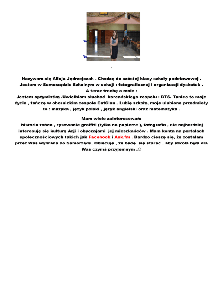Nazywam się Alicja Jędrzejczak . Chodzę do szóstej klasy szkoły podstawowej . Jestem w Samorządzie Szkolnym w sekcji : fotograficznej i organizacji dyskotek . A teraz trochę o mnie : Jestem optymistką .Uwielbiam słuchać koreańskiego zespołu : BTS. Taniec to moje życie , tańczę w obornickim zespole CatClan . Lubię szkołę, moje ulubione przedmioty to : muzyka , język polski , język angielski oraz matematyka . Mam wiele zainteresowań: historia tańca , rysowanie graffiti (tylko na papierze ), fotografia , ale najbardziej interesuję się kulturą Azji i obyczajami jej mieszkańców . Mam konta na portalach społecznościowych takich jak Facebook i Ask.fm . Bardzo cieszę się, że zostałam przez Was wybrana do Samorządu. Obiecuję , że będę się starać , aby szkoła była dla Was czymś przyjemnym .