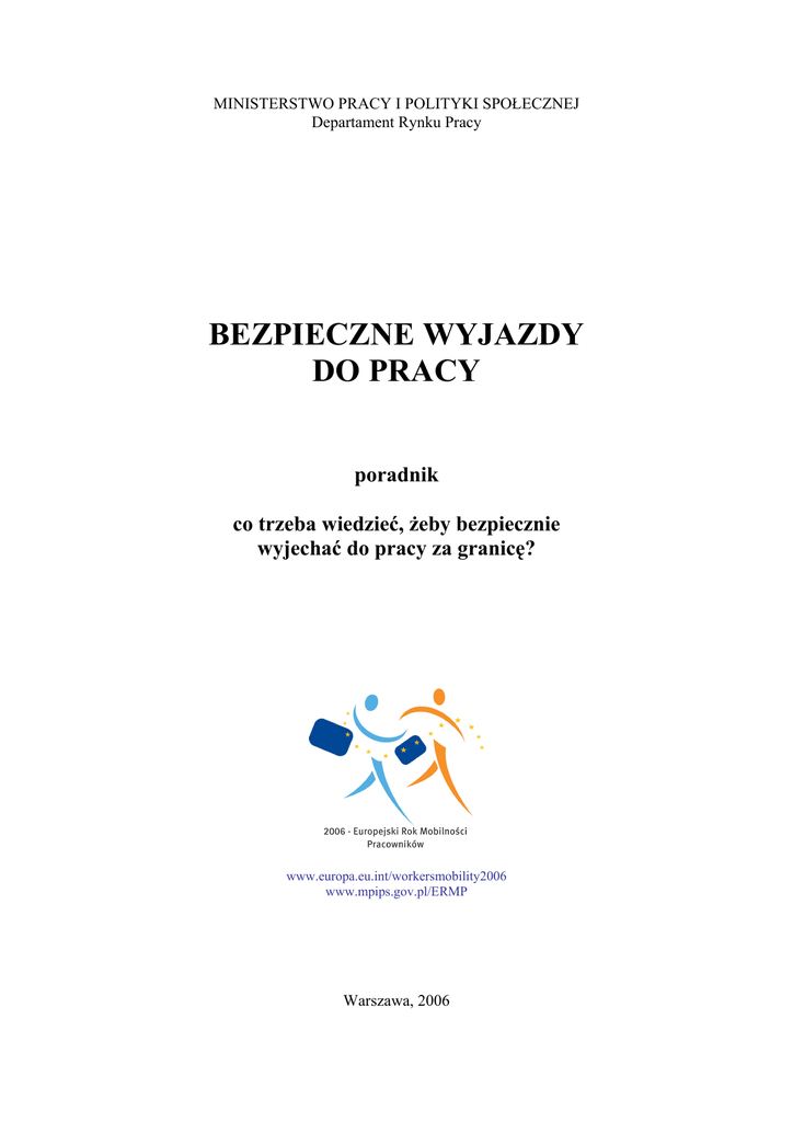 MINISTERSTWO PRACY I POLITYKI SPOŁECZNEJ Departament Rynku Pracy BEZPIECZNE WYJAZDY DO PRACY poradnik co trzeba wiedzieć, żeby bezpiecznie wyjechać do pracy za granicę? www.europa.eu.int/workersmobility2006 www.mpips.gov.pl/ERMP Warszawa, 2006 SPIS TREŚCI 1. POŚREDNICTWO PRACY ŚWIADCZONE PRZEZ AGENCJE ZATRUDNIENIA 2. POŚREDNICTWO PRACY W RAMACH SYSTEMU EURES 3. WYJAZDY W RAMACH UMÓW MIĘDZYRZĄDOWYCH 4. SPIS ADRESÓW WOJEWÓDZKICH URZĘDÓW PRACY 5. SPIS ADRESÓW ODDZIAŁÓW KONTROLI LEGALNOŚCI ZATRUDNIENIA 6. SPIS ADRESÓW AMBASAD RP I KONSULATÓW RP NA TERENIE UE 2 Słowo wstępne Okres wakacyjny sprzyja poszukiwaniu pracy dorywczej, pracy czasowej i w zasadzie każdego zajęcia, które mogłoby przynieść jakieś dochody. Wakacje to także wzmożony okres poszukiwania pracy przez studentów i uczniów, którzy korzystając z chwili czasu chcą podreperować swój budżet. Otwarcie niektórych zagranicznych rynków pracy, jak również ułatwienia w dostępie do innych spowodowało, że możemy szukać pracy poza Polską. Bądźmy jednak bardzo ostrożni w wyszukiwaniu atrakcyjnych ofert. Wyjazdy do pracy za granicę, choć atrakcyjne, bywają niebezpieczne. Do Ministerstwa Pracy i Polityki Społecznej stale napływają informacje o działalności nielegalnych pośredników pracy, w tym również o pobieraniu od osób wysokich opłat nie zapewniając im miejsc pracy. Liczą oni na nasze niedoświadczenie i niewiedzę w tym zakresie. Dlatego by nie dać się oszukać bardzo uważnie trzeba czytać ogłoszenia i dokładnie sprawdzać warunki zatrudnienia, warto dokładnie przeczytać umowę oraz sprawdzić firmę, która pośredniczy w znalezieniu pracy bądź samego pracodawcę. Chcąc przeciwdziałać rozszerzaniu się zjawiska nielegalnego pośrednictwa pracy, Ministerstwo Pracy i Polityki Społecznej opracowało poradnik skierowany do osób, które planują wyjechać w poszukiwaniu pracy za granicą, korzystając z usług publicznego lub niepublicznego pośrednictwa pracy oraz systemu EURES. Okresowy wyjazd do pracy w innym kraju jest od kilku lat jedną z najczęstszych form emigracji zewnętrznej Polaków. Przygotowany przez Ministerstwo Pracy i Polityki Społecznej poradnik przedstawia możliwości podejmowania legalnego zatrudnienia obywateli polskich w krajach europejskich. Poradnik obejmuje regulacje prawne i zasady obowiązujące przy ubieganiu się o pracę oraz przedstawia sposoby poszukiwania zatrudnienia. Wyrażamy nadzieję, że zgromadzone przez nas informacje będą pomocne przy podejmowaniu decyzji o wyjeździe za granicę. Departament Rynku Pracy 3 1. POŚREDNICTWO PRACY ŚWIADCZONE PRZEZ AGENCJE ZATRUDNIENIA Wysoki poziom bezrobocia w Polsce powoduje, że z roku na rok coraz więcej osób korzysta z usług agencji zatrudnienia. Świadczą o tym choćby dane nadsyłane do Ministerstwa, z których wynika, iż za pośrednictwem takich agencji do pracy za granicę wyjeżdża rocznie ponad 50 tysięcy osób. Dla tych osób ważna jest możliwość zdobycia kwalifikacji oraz poprawy swojej sytuacji materialnej i poziomu życia. Niestety, wciąż pojawiają się informacje o działalności nielegalnych pośredników proponujących pracę za granicą, którzy często, chcąc uwiarygodnić swoją ofertę, angażują w proces rekrutacji publiczne służby zatrudnienia. Jakie rodzaje agencji zatrudnienia mogą działać ma terenie Polski ? Wyróżniamy pięć rodzajów agencji zatrudnienia : - pośrednictwa pracy na terenie Rzeczypospolitej Polskiej, - pośrednictwa obywateli polskich do pracy za granicą u pracodawców zagranicznych, - doradztwa personalnego, - poradnictwa zawodowego, - pracy tymczasowej. Czym się zajmują poszczególne agencje? Agencje pośrednictwa pracy świadczące usługi w zakresie: 1) pośrednictwa pracy na terenie Rzeczypospolitej Polskiej, 2) pośrednictwa do pracy za granicą u pracodawców zagranicznych – udzielają pomocy poszukującym pracy w uzyskaniu odpowiedniego zatrudnienia a pracodawcom w znalezieniu pracowników o odpowiednich kwalifikacjach, Agencje doradztwa personalnego – świadczą odpłatnie usługi na rzecz pracodawców, Agencje poradnictwa zawodowego – udzielają pomocy w wyborze odpowiedniego zawodu i miejsca zatrudnienia, informacji zawodowych oraz pomocy w doborze kandydatów do pracy na stanowiska wymagające szczególnych predyspozycji psychofizycznych. Agencje pracy tymczasowej - kierują własnych pracowników do pracodawcy użytkownika celem wykonywania pracy tymczasowej. Która agencja zatrudnienia działa legalnie? Zgodnie z ustawą z dnia 20 kwietnia 2004 r. o promocji zatrudnienia i instytucjach rynku pracy wszystkie agencje zatrudnienia oferujące usługi na terenie Rzeczpospolitej Polskiej muszą posiadać wpis do rejestru agencji zatrudnienia potwierdzony certyfikatem (do dnia 31.10.2005 r. wystawianym przez Ministra Gospodarki i Pracy, natomiast od dnia 1.11.2005 r. przez Marszałka Województwa, właściwego dla siedziby podmiotu). Na co zwrócić uwagę przed wyjazdem za pośrednictwem agencji pośrednictwa do pracy za granicą? 4 Agencja pośrednictwa kierująca do pracy za granicą ma obowiązek zawarcia z osobą kierowaną do pracy umowę (art. 85 ustawy z dnia 20 kwietnia 2004 r. o promocji zatrudnienia i instytucjach rynku pracy – Dz. U. Nr 99, poz. 1001, z późn. zm.). Umowa taka musi zawierać takie informacje jak: - zagranicznego pracodawcę, - okres zatrudnienia lub innej pracy zarobkowej, - rodzaj oraz warunki pracy i wynagradzania, a także przysługujące osobie kierowanej do pracy świadczenia socjalne, - warunki ubezpieczenia społecznego oraz od następstw nieszczęśliwych wypadków i chorób tropikalnych, - obowiązki i uprawnienia osoby kierowanej do pracy oraz agencji pośrednictwa pracy, - zakres odpowiedzialności cywilnej stron w przypadku niewykonania lub nienależytego wykonania umowy zawartej między agencją pośrednictwa pracy a obywatelem polskim, w tym stronę pokry