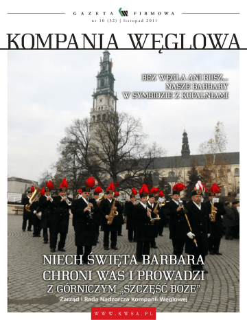 G A Z E T A F I R M O W A n r 10 ( 3 2 ) | l i s t o p a d 2 011 bez węgla ani rusz... nasze barbary w symbiozie z kopalniami Niech świĘta barbara chroni was i prowadzi z górniczym „szczęść boże” Zarząd i Rada Nadzorcza Kompanii Węglowej W W W. K W S A . P L G A Z E T A F I NASZA KOMPANIA D rodzy Czytelnicy! Ani się obejrzeliśmy, a tu już kolejna Barbórka… Czas mija nieubłaganie i tylko od nas zależy, czy wykorzystamy go należycie. Zdajemy sobie sprawę z tego, że straconych chwil nikt nam nie odda, a mimo to często trwonimy cenne dni i minuty. Pochłaniają nas czynności zupełnie zbędne, pogrążamy się w jałowych sporach, odwlekamy ważne decyzje tak, jakbyśmy znali tajne hasło do skarbca z jakimś czasowym bonusem… Z drugiej strony żyjemy w ciągłym pośpiechu, bez wytchnienia, bez komfortu wyciszenia i refleksji. Nasuwa się pytanie, czy to świat wszedł na tak wysokie obroty, że za nim nie nadążamy, czy to my sami nakręcamy wrzeciono czasu, biegając w kółko jak mysz na kołowrotku? Każdy musi sobie sam na to odpowiedzieć… o ile oczywiście znajdzie na takie rozważania czas. Proszę mi wybaczyć te refleksje, które być może nie są bezpośrednio związane z tematyką naszej gazety, ale nasunęły mi się one po wspaniałym dniu, kiedy to razem z tysiącami górników dane mi było uczestniczyć w pielgrzymce do Matki Boskiej Częstochowskiej. To miejsce, czas i okoliczności wyjątkowe nie tylko dla wierzących. Taki dzień jak niedziela 20 listopada – dzień pielgrzymki – pozwala na ogarnięcie tego wszystkiego, o czym pisałem na wstępie. Jest odskocznią od zwyczajnych zmagań, nie tylko z czasem. Daje nową porcję energii, pozwalając jednocześnie na uporządkowanie myśli i emocji. Ta energia, wewnętrzny spokój i ład będą nam bardzo potrzebne w codziennej pracy. I za ten dar składam Czarnej Madonnie serdeczne podziękowania. Jan Czypionka R M O W A Listopad 3 List do górników W YDARZENIA 4 Górnicza brać pod opieką Matki Boskiej Pielgrzymka górników na Jasną Górę 6 FAKTY • LICZBY • WYDARZENIA 8 W piątą rocznicę katastrofy w „Halembie”… Uczczono pamięć 23 górników, którzy zginęli w wybuchu metanu i pyłu węglowego 9 Bez węgla ani rusz… Węgiel nadal będzie istotnym surowcem w energetyce zarówno w Polsce, jak i na świecie 10 Praktyki w nowej hali Praktyki uczniowskie na terenie kopalni „Piast” 11 Arcybiskup Skworc wraca do rodzinnych stron Dotychczasowy ordynariusz tarnowski został następcą abp. Damiana Zimonia 12 Wnioski z porażek i sukcesów Rozmowa z Janem Stokłosą, dyrektorem technicznym Zakładu Górniczego „Piekary” 14 Nasze Barbary Sylwetki pracownic kopalni „Rydułtowy-Anna” 18 Nasze Barbary Sylwetki pracownic kopalni „Jankowice” W KOMPANII 20 W symbiozie z kopalniami Kompanijny Ośrodek Szkolenia 22 Barbórki na numizmatach W Knurowie święta Barbara jest otaczana szczególnym kultem 23 W Pszowie nie zapomniano o naszej patronce Od wielu stuleci szczególną czcią na Śląsku górnicy darzyli świętą Barbarę LUDZIE I MIEJSCA 24 Łączą od 15 lat Zakład Informatyki i Telekomunikacji 25 Oddając krew – darujesz życie 26 Stworzeni jesteśmy przez pamięć Książka „W Rudzie Śląskiej na Górnym Śląsku, czyli Zakład Górniczy «Mikołaj» Hrabiego Franciszka Ballestrema” 28 Lektura obowiązkowa Książka autorstwa dr. inż. Bogdana Ćwięka 29 „Bobrek-Centrum” najlepszy pod siatką 32 G a ler i a KO M PA N I A W Ę G L OWA Ga zeta f ir mowa Redakcja: Biuro Komunikacji KW SA dyrektor Zbigniew Madej Redaktor naczelny: Jan Czypionka [email protected] Adres redakcji: 40-039 Katowice ul. Powstańców 30, p. 64 tel. 032 7572025 Wydawca: Kompania Węglowa SA 40-039 Katowice ul. Powstańców 30 Druk: Tolek, drukarnia im. K. Miarki Zdjęcie na okładce: 21. pielgrzymka górników na Jasną Górę. Fot. Jan Czypionka Oddano do druku: 25.XI.2011 Drodzy górnicy! P rzy okazji każdej Barbórki składamy sobie życzenia górniczego szczęścia. To dzień dla nas szczególny. Mamy czas na refleksję i zadumę. Najczęściej wtedy mówimy: to już minął rok! Przychodzi wtedy moment podsumowania tego, co zrobiliśmy. Myślę, że wszyscy mamy powody do satysfakcji. Kompania Węglowa pozostaje firmą o ustabilizowanej pozycji na rynku. Osiąga dobre wyniki ekonomicznofinansowe. Dlatego pragnę wszystkim bardzo gorąco podziękować za trud i wysiłek. Praca górnika jest nie tylko ciężka, ale i niebezpieczna. W tym dniu warto o tym mówić bardzo dobitnie. Nie możemy zapominać o historii. Musimy przypominać, ile potu, ale i krwi wylaliśmy, by nie tylko wyrywać matce naturze czarne złoto, lecz by dzięki górniczej braci mogły rozwijać się śląskie miasta i cały region. Drodzy górnicy! Patrzymy w przyszłość. W tym roku przyjmiemy do pracy pięć tysięcy osób. Przygotowaliśmy nową strategię i strukturę organizacyjną firmy. Przed Kompanią otwierają się nowe perspektywy rozwoju. Warto to podkreślić przy okazji Barbórki. Dla 60 tysięcznej rzeszy naszych pracowników nie tylko ważne jest to, co było w mijającym roku, ale to, co nas czeka w przyszłości. Kompania Węglowa stoi przed nowymi wyzwaniami. Stawiamy sobie ambitne cele. Chcemy ustabilizować, a nawet, w zależności od potrzeb, zwiększać wydobycie. Dalszy rozwój firmy jest naszym priorytetem. Tego oczekuje od nas rynek. W polityce energetycznej rządu węgiel jest najważniejszym surowcem energetycznym w naszym kraju. Kompania Węglowa pozostanie zarazem jego największym producentem nie tylko w Polsce, ale i w Unii Europejskiej. Nie poprzestaniemy na wydobywaniu węgla. Przygotowujemy się do jego przetwarzania na prąd w elektrowni, której będziemy współwłaścicielem. Realizacja tych planów zależeć będzie od każdego z nas, bez względu na zajmowane stanowisko. Tworzymy górniczą rodzinę. Dlatego wierzę, że wspólnie osiągniemy zakładane cel