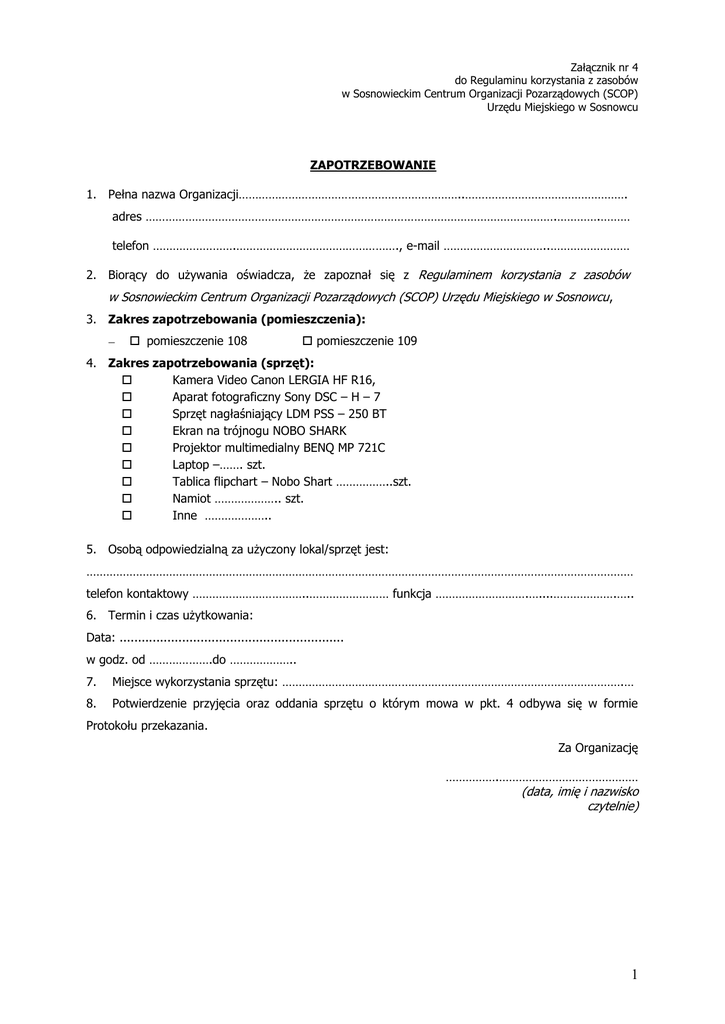 Załącznik nr 4 do Regulaminu korzystania z zasobów w Sosnowieckim Centrum Organizacji Pozarządowych (SCOP) Urzędu Miejskiego w Sosnowcu ZAPOTRZEBOWANIE 1. Pełna nazwa Organizacji…………………………………………………………..…………………………………………. adres …………………………………………………………………………………………………………….………….……… telefon …………………….…………………………………………., e-mail …………………………..…………………… 2. Biorący do używania oświadcza, że zapoznał się z Regulaminem korzystania z zasobów w Sosnowieckim Centrum Organizacji Pozarządowych (SCOP) Urzędu Miejskiego w Sosnowcu , 3. Zakres zapotrzebowania (pomieszczenia): pomieszczenie 108 pomieszczenie 109 4. Zakres zapotrzebowania (sprzęt): Kamera Video Canon LERGIA HF R16, Aparat fotograficzny Sony DSC – H – 7 Sprzęt nagłaśniający LDM PSS – 250 BT Ekran na trójnogu NOBO SHARK Projektor multimedialny BENQ MP 721C Laptop –……. szt. Tablica flipchart – Nobo Shart ……………..szt. Namiot ……………….. szt. Inne ……………….. 5. Osobą odpowiedzialną za użyczony lokal/sprzęt jest: ………………………………………………………………………………………………………………………………………………… telefon kontaktowy ……………………………..…………………… funkcja ……………………….…....……………….….. 6. Termin i czas użytkowania: Data: ............................................................. w godz. od ……………….do ……………….. 7. Miejsce wykorzystania sprzętu: ………………………………………………………………………………………….… 8. Potwierdzenie przyjęcia oraz oddania sprzętu o którym mowa w pkt. 4 odbywa się w formie Protokołu przekazania. Za Organizację …………….…………………………………… (data, imię i nazwisko czytelnie) 1 Protokół przekazania W dniu ……………………………………..…….. Organizacji ………………………………………………………………………………………………………………………………... został przekazany następujący sprzęt (model, numer seryjny, wyposażenie dodatkowe) Kamera Video Canon LERGIA HF R16 wraz z akumulatorem, kompaktowym zasilaczem (razem z przewodem zasilającym), kablem sterowniczym wideo (wtyczki żółta, czerwona, biała), kablem komponentowym (wtyczki czerwona, zielona, niebieska), kablem USB, 3 płyty CD-ROM z oprogramowaniem, instrukcją obsługi; Aparat fotograficzny Sony DSC – H – 7 wraz z ładowarką, akumulatorem, kablem zasilającym, instrukcją obsługi, kablem USB, pilotem, osłoną obiektywu, pierścieniem obiektywu, kartą pamięci, CD, pokrowcem; Sprzęt nagłaśniający LDM PSS – 250 BT: 2 mikrofony bezprzewodowe, kolumna pasywna, kolumna z nagłośnieniem, kabel łączący, kabel zasilający, 2 statywy pod mikrofon; Ekran na trójnogu NOBO SHARK; Projektor multimedialny BENQ MP 721C wraz z instrukcją obsługi, kablem zasilającym, kabel VGA, kabel Video, pokrowiec, CD, pilot; Notebook Progress Mobile 5FL91 + pokrowiec na notebooka; Notebook Lenovo SL 500T2670 2GB + pokrowiec na notebooka; Namiot szt. …………………; Inne …………. na czas od ……………..……………. godz. ……………..…….. do ………………....…….. godz. ………………………. do używania w …………………………………………………………………………………………………………….………….… Udostępniony sprzęt jest sprawny. Organizacja SCOP …………………………… (data i podpis) ………………………….… (data i podpis) Zwrot sprzętu W dniu …………………………….. został zwrócony wyżej opisany sprzęt. Udostępniony sprzęt jest sprawny/niesprawny*. Uwagi ………………………………………………………………………………………………………………………………………………… Organizacja SCOP …………………………… (data i podpis) ………………………….….… (data i podpis) *niepotrzebne skreślić 2