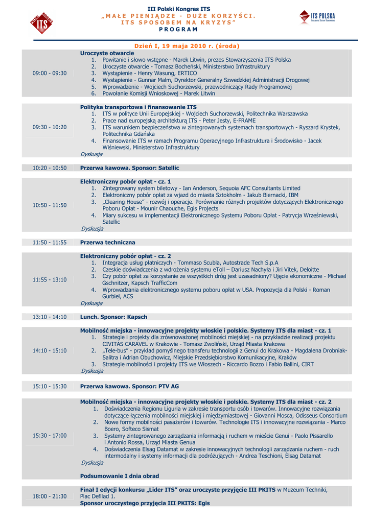 III Polski Kongres ITS „MAŁE PIENIĄDZE - DUŻE KORZYŚCI. ITS SPOSOBEM NA KRYZYS” PROGRAM 09:00 - 09:30 09:30 - 10:20 Dzień I, 19 maja 2010 r. (środa) Uroczyste otwarcie 1. Powitanie i słowo wstępne - Marek Litwin, prezes Stowarzyszenia ITS Polska 2. Uroczyste otwarcie - Tomasz Bocheński, Ministerstwo Infrastruktury 3. Wystąpienie - Henry Wasung, ERTICO 4. Wystąpienie - Gunnar Malm, Dyrektor Generalny Szwedzkiej Administracji Drogowej 5. Wprowadzenie - Wojciech Suchorzewski, przewodniczący Rady Programowej 6. Powołanie Komisji Wnioskowej - Marek Litwin Polityka transportowa i finansowanie ITS 1. ITS w polityce Unii Europejskiej - Wojciech Suchorzewski, Politechnika Warszawska 2. Prace nad europejską architekturą ITS - Peter Jesty, E-FRAME 3. ITS warunkiem bezpieczeństwa w zintegrowanych systemach transportowych - Ryszard Krystek, Politechnika Gdańska 4. Finansowanie ITS w ramach Programu Operacyjnego Infrastruktura i Środowisko - Jacek Wiśniewski, Ministerstwo Infrastruktury Dyskusja 10:20 - 10:50 10:50 - 11:50 Przerwa kawowa. Sponsor: Satellic Elektroniczny pobór opłat - cz. 1 1. Zintegrowany system biletowy - Ian Anderson, Sequoia AFC Consultants Limited 2. Elektroniczny pobór opłat za wjazd do miasta Sztokholm - Jakub Biernacki, IBM 3. „Clearing House” - rozwój i operacje. Porównanie różnych projektów dotyczących Elektronicznego Poboru Opłat - Mounir Chaouche, Egis Projects 4. Miary sukcesu w implementacji Elektronicznego Systemu Poboru Opłat - Patrycja Wrześniewski, Satellic Dyskusja 11:50 - 11:55 11:55 - 13:10 Przerwa techniczna Elektroniczny pobór opłat - cz. 2 1. Integracja usług płatniczych - Tommaso Scubla, Autostrade Tech S.p.A 2. Czeskie doświadczenia z wdrożenia systemu eToll – Dariusz Nachyła i Jiri Vitek, Deloitte 3. Czy pobór opłat za korzystanie ze wszystkich dróg jest uzasadniony? Ujęcie ekonomiczne - Michael Gschnitzer, Kapsch TrafficCom 4. Wprowadzania elektronicznego systemu poboru opłat w USA. Propozycja dla Polski - Roman Gurbiel, ACS Dyskusja 13:10 - 14:10 14:10 - 15:10 Lunch. Sponsor: Kapsch Mobilność miejska - innowacyjne projekty włoskie i polskie. Systemy ITS dla miast - cz. 1 1. Strategie i projekty dla zrównoważonej mobilności miejskiej - na przykładzie realizacji projektu CIVITAS CARAVEL w Krakowie - Tomasz Zwoliński, Urząd Miasta Krakowa 2. „Tele-bus” - przykład pomyślnego transferu technologii z Genui do Krakowa - Magdalena DrobniakSalitra i Adrian Obuchowicz, Miejskie Przedsiębiorstwo Komunikacyjne, Kraków 3. Strategie mobilności i projekty ITS we Włoszech - Riccardo Bozzo i Fabio Ballini, CIRT Dyskusja 15:10 - 15:30 15:30 - 17:00 Przerwa kawowa. Sponsor: PTV AG Mobilność miejska - innowacyjne projekty włoskie i polskie. Systemy ITS dla miast - cz. 2 1. Doświadczenia Regionu Liguria w zakresie transportu osób i towarów. Innowacyjne rozwiązania dotyczące łączenia mobilności miejskiej i międzymiastowej - Giovanni Mosca, Odisseus Consortium 2. Nowe formy mobilności pasażerów i towarów. Technologie ITS i innowacyjne rozwiązania - Marco Boero, Softeco Sismat 3. Systemy zintegrowanego zarządzania informacją i ruchem w mieście Genui - Paolo Pissarello i Antonio Rossa, Urząd Miasta Genua 4. Doświadczenia Elsag Datamat w zakresie innowacyjnych technologii zarządzania ruchem - ruch intermodalny i systemy informacji dla podróżujących - Andrea Teschioni, Elsag Datamat Dyskusja Podsumowanie I dnia obrad 18:00 - 21:30 Finał I edycji konkursu „Lider ITS” oraz uroczyste przyjęcie III PKITS w Muzeum Techniki, Plac Defilad 1. Sponsor uroczystego przyjęcia III PKITS: Egis III Polski Kongres ITS „MAŁE PIENIĄDZE - DUŻE KORZYŚCI. ITS SPOSOBEM NA KRYZYS” PROGRAM 8:30 - 9:45 Dzień II, 20 maja 2010 r. (czwartek) Efektywność i architektura ITS 1. Metody badania efektywności działania systemu sterowania ruchem na przykładzie projektu w Munster - Jurgen Mueck, Siemens AG 2. Koncepcja rozwoju Inteligentnych Systemów Transportowych na obszarze m.st. Warszawy Aleksander Ronowicz i Andrzej Zdzitowiecki, 4Pi 3. Filozofia budowy zintegrowanego Inteligentnego Systemu Transportu - Maciej Wielgus, IBM Polska 4. Wspólna architektura systemów zarządzania ruchem w mieście i na drogach krajowych w ramach systemu zarządzania ruchem w aglomeracji miejskiej - Piotr Haremza, Siemens Dyskusja 9:45 - 9:50 9:50 - 11:20 Przerwa techniczna Systemy zarządzania ruchem - cz. 1 1. ITS w sterowaniu ruchem tramwajowym - Jeremi Rychlewski, Politechnika Poznańska 2. Systemy prowadzenia ruchu przy użyciu tablic elektronicznych o zmiennej treści - Piotr Krukowski, Zarząd Dróg i Utrzymania, Wrocław 3. System zarządzania ruchem w Poznaniu - zaawansowana koncepcja architektury i implementacji - Mariusz Kaczmarek, Politechnika Poznańska Dyskusja 11:20 - 11:40 11:40 - 13:10 Przerwa kawowa. Sponsor: Instytut Transportu Samochodowego Systemy zarządzania ruchem - cz. 2 1. Problematyka wykonywania krótkookresowych prognoz ruchu na potrzeby zarządzania i sterowania ruchem - Tomasz Dybicz, Politechnika Warszawska 2. Adaptacyjne sterowanie ruchem w sieciach ulic bazujące na algorytmach genetycznych rezultaty projektu w Bawarii - Herwig Wulffius, GEVAS 3. Londyńskie doświadczenia we wprowadzaniu priorytetów dla autobusów oraz zastosowania akomodacyjnego systemu sterowania ruchem SCOOT - Adam Giszczak, TRL 4. Ekologiczne systemy sterowania i zarządzania ruchem - Siebe Turksma, Peek Traffic 5. The Multimodal Mobility Agency: nowa koncepcja zarządzania mobilnością przez władze publiczne - Farid Debbah, Egis Mobilité Dyskusja 13:10 - 14:00 Lunch. Sponsor: IBM 14:00 - 15:15 Bezpieczeństwo transportu 1. Standaryzacja paneuropejskiego systemu automatycznego powiadamiania ratunkowego eCall Tomasz Kamiński, Instytut Transportu Samochodowego 2. Zastosowanie ITS w zarządzaniu bezpieczeństwem drogowego transportu zbiorowego - Łukasz Franek, Politechnika Krakowska 3. Automatyczna identyfika