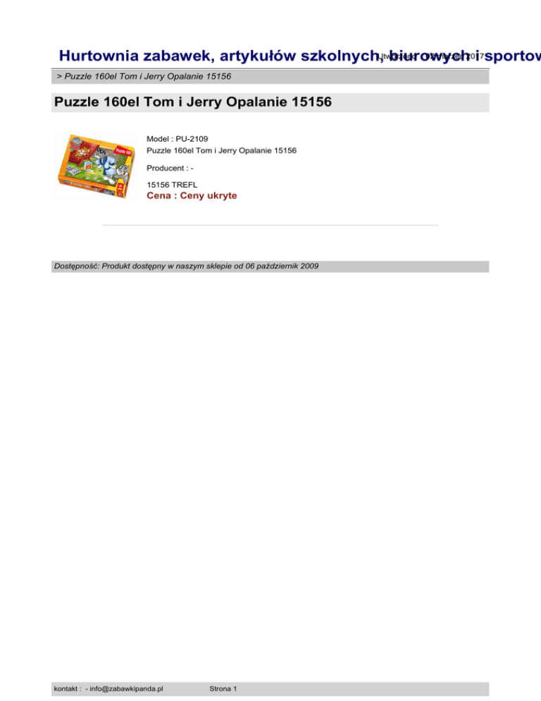 : 02 marzec 2017 Hurtownia zabawek, artykułów szkolnych,Utworzono biurowych i sportow > Puzzle 160el Tom i Jerry Opalanie 15156 Puzzle 160el Tom i Jerry Opalanie 15156 Model : PU-2109 Puzzle 160el Tom i Jerry Opalanie 15156 Producent : 15156 TREFL Cena : Ceny ukryte Dostępność: Produkt dostępny w naszym sklepie od 06 październik 2009 kontakt : - [email protected] Strona 1