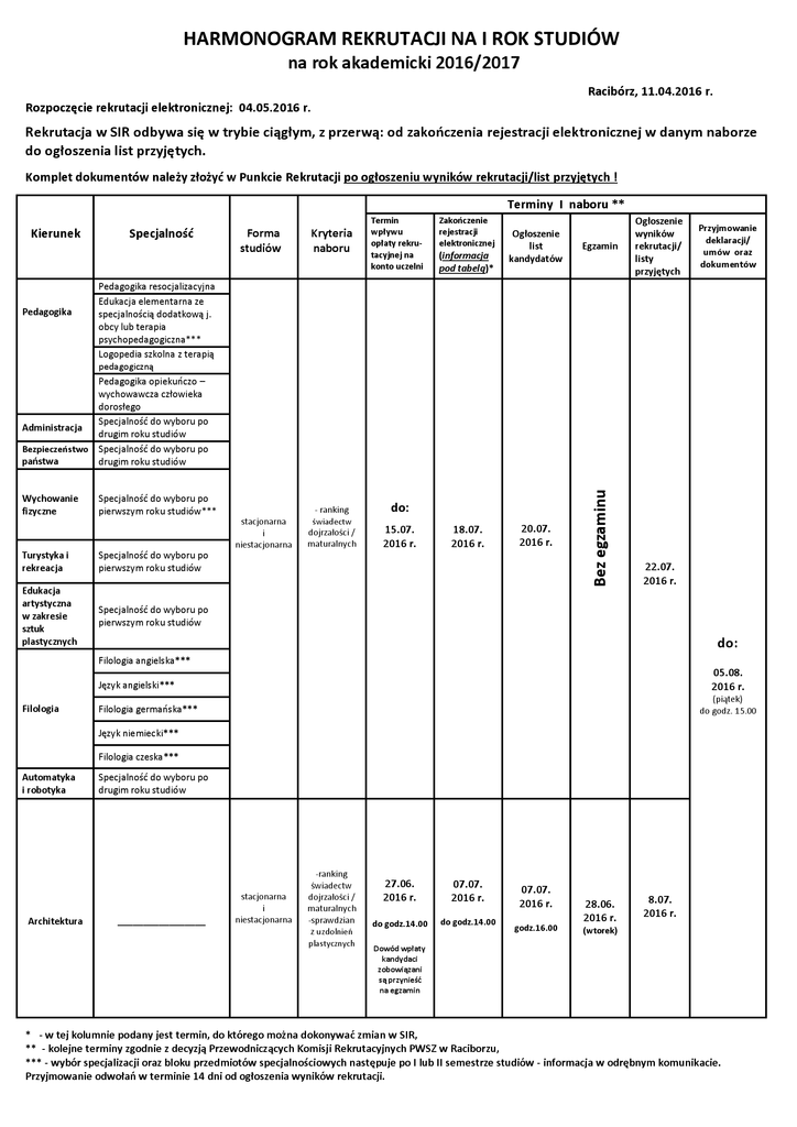 HARMONOGRAM REKRUTACJI NA I ROK STUDIÓW na rok akademicki 2016/2017 Racibórz, 11.04.2016 r. Rozpoczęcie rekrutacji elektronicznej: 04.05.2016 r. Rekrutacja w SIR odbywa się w trybie ciągłym, z przerwą: od zakończenia rejestracji elektronicznej w danym naborze do ogłoszenia list przyjętych. Komplet dokumentów należy złożyć w Punkcie Rekrutacji po ogłoszeniu wyników rekrutacji/list przyjętych ! Kierunek Specjalność Forma studiów Kryteria naboru Termin wpływu opłaty rekrutacyjnej na konto uczelni Zakończenie rejestracji elektronicznej (informacja pod tabelą)* Ogłoszenie list kandydatów Egzamin 20.07. 2016 r. Bez egzaminu Terminy I naboru ** Ogłoszenie wyników rekrutacji/ listy przyjętych Przyjmowanie deklaracji/ umów oraz dokumentów Pedagogika resocjalizacyjna Edukacja elementarna ze Pedagogika specjalnością dodatkową j. obcy lub terapia psychopedagogiczna*** Logopedia szkolna z terapią pedagogiczną Pedagogika opiekuńczo – wychowawcza człowieka dorosłego Specjalność do wyboru po Administracja drugim roku studiów Bezpieczeństwo Specjalność do wyboru po państwa drugim roku studiów Wychowanie fizyczne Specjalność do wyboru po pierwszym roku studiów*** stacjonarna i niestacjonarna Turystyka i rekreacja Specjalność do wyboru po pierwszym roku studiów Edukacja artystyczna w zakresie sztuk plastycznych Specjalność do wyboru po pierwszym roku studiów - ranking świadectw dojrzałości / maturalnych do: 15.07. 2016 r. 18.07. 2016 r. 22.07. 2016 r. do: Filologia angielska*** 05.08. 2016 r. Język angielski*** Filologia (piątek) do godz. 15.00 Filologia germańska*** Język niemiecki*** Filologia czeska*** Automatyka i robotyka Architektura Specjalność do wyboru po drugim roku studiów _________________ stacjonarna i niestacjonarna -ranking świadectw dojrzałości / maturalnych -sprawdzian z uzdolnień plastycznych 27.06. 2016 r. 07.07. 2016 r. do godz.14.00 do godz.14.00 07.07. 2016 r. godz.16.00 28.06. 2016 r. 8.07. 2016 r. (wtorek) Dowód wpłaty kandydaci zobowiązani są przynieść na egzamin * - w tej kolumnie podany jest termin, do którego można dokonywać zmian w SIR, ** - kolejne terminy zgodnie z decyzją Przewodniczących Komisji Rekrutacyjnych PWSZ w Raciborzu, *** - wybór specjalizacji oraz bloku przedmiotów specjalnościowych następuje po I lub II semestrze studiów - informacja w odrębnym komunikacie. Przyjmowanie odwołań w terminie 14 dni od ogłoszenia wyników rekrutacji.