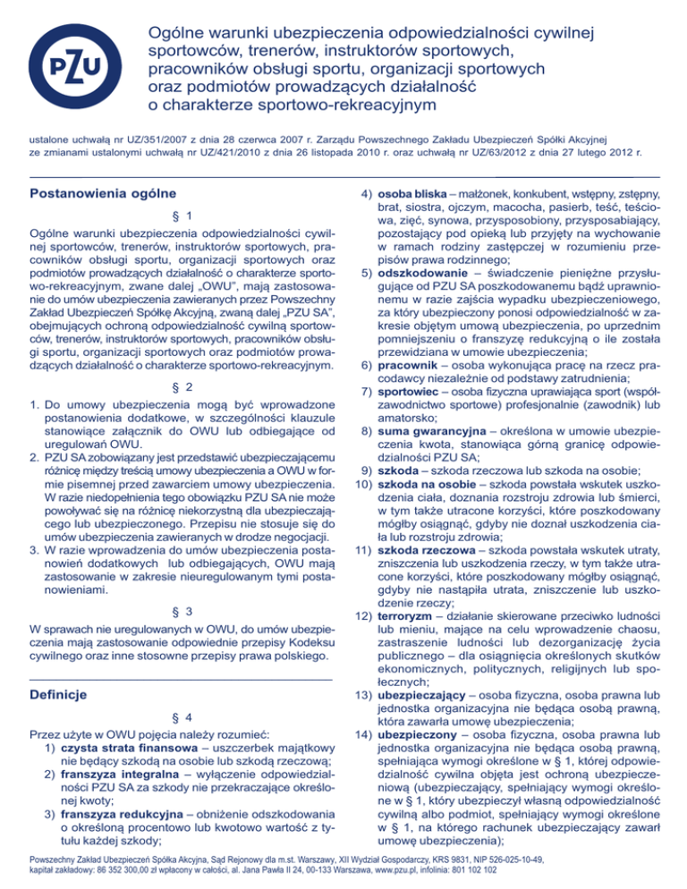 Ogólne warunki ubezpieczenia odpowiedzialności cywilnej sportowców, trenerów, instruktorów sportowych, pracowników obsługi sportu, organizacji sportowych oraz podmiotów prowadzących działalność o charakterze sportowo-rekreacyjnym ustalone uchwałą nr UZ/351/2007 z dnia 28 czerwca 2007 r. Zarządu Powszechnego Zakładu Ubezpieczeń Spółki Akcyjnej ze zmianami ustalonymi uchwałą nr UZ/421/2010 z dnia 26 listopada 2010 r. oraz uchwałą nr UZ/63/2012 z dnia 27 lutego 2012 r. Postanowienia ogólne § 1 Ogólne warunki ubezpieczenia odpowiedzialności cywilnej sportowców, trenerów, instruktorów sportowych, pracowników obsługi sportu, organizacji sportowych oraz podmiotów prowadzących działalność o charakterze sportowo-rekreacyjnym, zwane dalej „OWU”, mają zastosowanie do umów ubezpieczenia zawieranych przez Powszechny Zakład Ubezpieczeń Spółkę Akcyjną, zwaną dalej „PZU SA”, obejmujących ochroną odpowiedzialność cywilną sportowców, trenerów, instruktorów sportowych, pracowników obsługi sportu, organizacji sportowych oraz podmiotów prowadzących działalność o charakterze sportowo-rekreacyjnym. § 2 1. Do umowy ubezpieczenia mogą być wprowadzone postanowienia dodatkowe, w szczególności klauzule stanowiące załącznik do OWU lub odbiegające od uregulowań OWU. 2. PZU SA zobowiązany jest przedstawić ubezpieczającemu różnicę między treścią umowy ubezpieczenia a OWU w formie pisemnej przed zawarciem umowy ubezpieczenia. W razie niedopełnienia tego obowiązku PZU SA nie może powoływać się na różnicę niekorzystną dla ubezpieczającego lub ubezpieczonego. Przepisu nie stosuje się do umów ubezpieczenia zawieranych w drodze negocjacji. 3. W razie wprowadzenia do umów ubezpieczenia postanowień dodatkowych lub odbiegających, OWU mają zastosowanie w zakresie nieuregulowanym tymi postanowieniami. § 3 W sprawach nie uregulowanych w OWU, do umów ubezpieczenia mają zastosowanie odpowiednie przepisy Kodeksu cywilnego oraz inne stosowne przepisy prawa polskiego. _____________________________________________ Definicje § 4 Przez użyte w OWU pojęcia należy rozumieć: 1) czysta strata finansowa – uszczerbek majątkowy nie będący szkodą na osobie lub szkodą rzeczową; 2) franszyza integralna – wyłączenie odpowiedzialności PZU SA za szkody nie przekraczające określonej kwoty; 3) franszyza redukcyjna – obniżenie odszkodowania o określoną procentowo lub kwotowo wartość z tytułu każdej szkody; 4) osoba bliska – małżonek, konkubent, wstępny, zstępny, brat, siostra, ojczym, macocha, pasierb, teść, teściowa, zięć, synowa, przysposobiony, przysposabiający, pozostający pod opieką lub przyjęty na wychowanie w ramach rodziny zastępczej w rozumieniu przepisów prawa rodzinnego; 5) odszkodowanie – świadczenie pieniężne przysługujące od PZU SA poszkodowanemu bądź uprawnionemu w razie zajścia wypadku ubezpieczeniowego, za który ubezpieczony ponosi odpowiedzialność w zakresie objętym umową ubezpieczenia, po uprzednim pomniejszeniu o franszyzę redukcyjną o ile została przewidziana w umowie ubezpieczenia; 6) pracownik – osoba wykonująca pracę na rzecz pracodawcy niezależnie od podstawy zatrudnienia; 7) sportowiec – osoba fizyczna uprawiająca sport (współzawodnictwo sportowe) profesjonalnie (zawodnik) lub amatorsko; 8) suma gwarancyjna – określona w umowie ubezpieczenia kwota, stanowiąca górną granicę odpowiedzialności PZU SA; 9) szkoda – szkoda rzeczowa lub szkoda na osobie; 10) szkoda na osobie – szkoda powstała wskutek uszkodzenia ciała, doznania rozstroju zdrowia lub śmierci, w tym także utracone korzyści, które poszkodowany mógłby osiągnąć, gdyby nie doznał uszkodzenia ciała lub rozstroju zdrowia; 11) szkoda rzeczowa – szkoda powstała wskutek utraty, zniszczenia lub uszkodzenia rzeczy, w tym także utracone korzyści, które poszkodowany mógłby osiągnąć, gdyby nie nastąpiła utrata, zniszczenie lub uszkodzenie rzeczy; 12) terroryzm – działanie skierowane przeciwko ludności lub mieniu, mające na celu wprowadzenie chaosu, zastraszenie ludności lub dezorganizację życia publicznego – dla osiągnięcia określonych skutków ekonomicznych, politycznych, religijnych lub społecznych; 13) ubezpieczający – osoba fizyczna, osoba prawna lub jednostka organizacyjna nie będąca osobą prawną, która zawarła umowę ubezpieczenia; 14) ubezpieczony – osoba fizyczna, osoba prawna lub jednostka organizacyjna nie będąca osobą prawną, spełniająca wymogi określone w § 1, której odpowiedzialność cywilna objęta jest ochroną ubezpieczeniową (ubezpieczający, spełniający wymogi określone w § 1, który ubezpieczył własną odpowiedzialność cywilną albo podmiot, spełniający wymogi określone w § 1, na którego rachunek ubezpieczający zawarł umowę ubezpieczenia); Powszechny Zakład Ubezpieczeń Spółka Akcyjna, Sąd Rejonowy dla m.st. Warszawy, XII Wydział Gospodarczy, KRS 9831, NIP 526-025-10-49, kapitał zakładowy: 86 352 300,00 zł wpłacony w całości, al. Jana Pawła II 24, 00-133 Warszawa, www.pzu.pl, infolinia: 801 102 102 15) wypadek ubezpieczeniowy – działanie lub zaniechanie, w wyniku którego wyrządzona zostaje szkoda. _____________________________________________ Przedmiot i zakres ochrony ubezpieczeniowej § 5 6) 1. Przedmiotem ubezpieczenia jest odpowiedzialność cywilna ubezpieczonego wobec osób trzecich za szkody będące następstwem czynu niedozwolonego (odpowiedzialność cywilna deliktowa) w związku z prowadzoną przez ubezpieczonego działalnością albo aktywnością sportową albo wykonywanym zawodem określonymi w umowie ubezpieczenia oraz z posiadanym w związku z tą działalnością albo aktywnością sportową albo wykonywanym zawodem mieniem. 2. Ochroną ubezpieczeniową objęte są także szkody wyrządzone w następstwie rażącego niedbalstwa, z zastrzeżeniem postanowień § 7 us