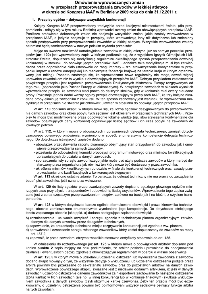 Omówienie wprowadzonych zmian w przepisach przeprowadzania zawodów w lekkiej atletyce w okresie od Kongresu IAAF w Berlinie w 2009 roku do dnia 31.12.2011 r. 1. Przepisy ogólne – dotyczące wszystkich konkurencji Kolejny Kongres IAAF przeprowadzony tradycyjnie przed kolejnymi mistrzostwami świata, (dla przypomnienia - odbyły się w tym roku w Berlinie) wprowadził szereg zmian do obowiązujących przepisów IAAF. Poniższe omówienie dokonanych zmian nie obejmuje wszystkich zmian, jakie zostały wprowadzone w przepisach IAAF, a jedynie obejmuje te przepisy, które wprowadzają inny niż dotychczas lub zmieniony sposób postępowania przy przeprowadzaniu zawodów w lekkiej atletyce. Wszystkie wprowadzone zmiany natomiast będą zamieszczone w nowym polskim wydaniu przepisów. Mając na uwadze możliwość uatrakcyjnienia zawodów w lekkiej atletyce, już na samym początku przepisów (art. 100) jest wprowadzony zapis w którym podkreśla się, że z wyjątkiem Igrzysk Olimpijskich i Mistrzostw Świata, dopuszcza się modyfikację regulaminu określającego sposób przeprowadzania dowolnej konkurencji w stosunku do obowiązujących przepisów IAAF. Jednakże taka modyfikacja musi być zatwierdzona przez odpowiednie ciało (stosownie do rangi imprezy – tzn. stowarzyszenie kontynentalne w przypadku imprez o randze europejskiej lub macierzystą federację krajową na terenie kraju w którym organizowany jest miting). Ponadto zastrzega się, że wprowadzane nowe regulaminy nie mogą dawać więcej uprawnień zawodnikom niż to wynika z obowiązujących przepisów IAAF. Dobrym przykładem zastosowania powyższego przepisu jest regulamin przeprowadzania Drużynowych Mistrzostw Europy rozgrywanych od tego roku (poprzednio jako Puchar Europy w lekkoatletyce). W powyższych zawodach w skokach wysokich wprowadzono przepis, że zawodnik traci prawo do dalszych skoków, gdy w konkursie miał cztery nieudane próby. Pozostaje jednak nadal ważny ogólny przepis obowiązujący w przepisach IAAF, że trzy kolejne nieudane próby eliminują zawodnika z konkursu. W ten sposób zachowany jest warunek, że wprowadzana modyfikacja w przepisach nie stwarza jakichkolwiek ułatwień w stosunku do obowiązujących przepisów IAAF. W art. 110 dopisano akapit, w którym mówi się, że liczba sędziów desygnowanych do przeprowadzenia danych zawodów oraz okres pobytu tych sędziów jest określany w przepisach technicznych IAAF. Przepisy te mogą być modyfikowane przez odpowiednie lokalne władze (np. stowarzyszenia kontynentalne dla zawodów obejmujących dany kontynent) dopasowując liczbę sędziów i ich czas pobytu na zawodach do lokalnych potrzeb. W art. 112, w którym mowa o obowiązkach i uprawnieniach delegata technicznego, zamiast dotychczasowego opisowego omówienia, wymieniono w sposób enumeratywny kompetencje delegata technicznego. Do dotychczas istniejących zapisów dodano: - obowiązek przedstawienia raportu pisemnego obejmujący stan przygotowań do zawodów jak i omówienie przeprowadzenia samych zawodów. - przesłania do odpowiedniej komórki propozycji programu minutowego oraz minimów kwalifikacyjnych uprawniających do udziału w danych zawodach. - sporządzenia listy sprzętu zawodniczego jakie może być użyty podczas zawodów a który ma być dostarczony przez organizatora jak również ten który może być dostarczony przez zawodnika. - określenia minimów kwalifikacyjnych do udziału w finale dla konkurencji technicznych oraz zasady przeprowadzania rund kwalifikacyjnych w konkurencjach biegowych. W art. 113 skreślono ostatnie zdanie. To oznacza, że delegat techniczny nie ma prawa do zarządzenia badań płci zawodnika, jeśli uzna to za wskazane. W art. 120 do listy sędziów przeprowadzających zawody dopisano sędziego głównego sędziów mierzących czas przy użyciu transponderów i odpowiednią liczbę asystentów. Wprowadzenie tego zapisu związane jest z coraz częstszym przeprowadzaniem biegów, zarówno na trasie jak i na bieżni, z użyciem transponderów. W art. 123 w którym dotychczas bardzo ogólnie sformułowano obowiązki i prawa kierownika technicznego, obecnie zamieszczono enumeratywnie wymienione jego kompetencje. Do dotychczas istniejącego tekstu zapisanego obecnie jako ppkt. a) dodano następujące zapisane obowiązki: b) rozmieszczanie i usuwanie urządzeń i sprzętu zgodnie z technicznym planem organizacyjnym zatwierdzonym dla danych zawodów przez delegatów technicznych, c) zapewnienie, że prezentacja techniczna miejsc rozgrywania konkurencji jest zgodna z ww. planem, d) sprawdzanie i oznaczanie sprzętu własnego zawodników który został dopuszczony do zawodów na mocy art. 187.2, e) zapewnić, iż przed zawodami otrzymał wszelkie stosowne certyfikaty stosownie do art. 135. W odniesieniu do rozbudowanego już art. 125 w którym mowa o obowiązkach arbitrów dopisano pod koniec punktu 2 zapis mający na celu podkreślenie, że arbiter posiada uprawnienia do podejmowania działania i ewentualnych decyzji zgodnie z obowiązującym regulaminem w oparciu o własne obserwacje. W art. 125.5 w którym mowa o udzielaniu/udzieleniu ostrzeżeń lub wykluczania zawodnika z zawodów dodano akapit mówiący o tym, że wszystkie decyzje o wykluczeniu lub udzieleniu ostrzeżenia podjęte przez arbitra powinny być przekazane do sekretariatu zawodów oraz do pozostałych arbitrów na danych zawodach. Wprowadzenie powyższego akapitu związane jest z niedawno dodanym artykułem, iż jeśli w danych zawodach udzielono ostrzeżenie danemu zawodnikowi za niesportowe zachowanie to następne ostrzeżenie (żółta kartka) w tych zawodach (ale np. w innej konkurencji lub w konkursie finałowym) skutkuje wykluczeniem zawodnika z danych zawodów (czyli otrzymuje kartkę czerwoną). Żeby ten przepis mógł być egzekwowany, o udzieleniu ostrzeżenia powinni być poinformowani wszyscy sędziowie pełniący funkcje arbitra na tych zawodach. Ponadto w art. 125 dodano
