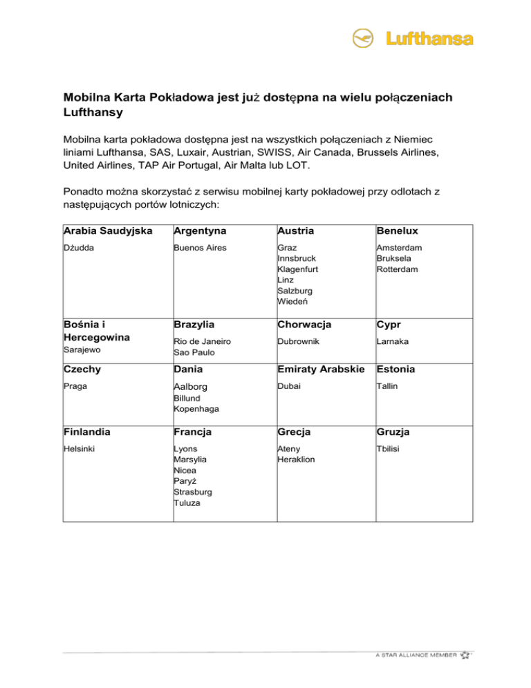Mobilna Karta Pokładowa jest już dostępna na wielu połączeniach Lufthansy Mobilna karta pokładowa dostępna jest na wszystkich połączeniach z Niemiec liniami Lufthansa, SAS, Luxair, Austrian, SWISS, Air Canada, Brussels Airlines, United Airlines, TAP Air Portugal, Air Malta lub LOT. Ponadto można skorzystać z serwisu mobilnej karty pokładowej przy odlotach z następujących portów lotniczych: Arabia Saudyjska Argentyna Austria Benelux Dżudda Buenos Aires Graz Innsbruck Klagenfurt Linz Salzburg Wiedeń Amsterdam Bruksela Rotterdam Bośnia i Hercegowina Brazylia Chorwacja Cypr Rio de Janeiro Sao Paulo Dubrownik Larnaka Sarajewo Czechy Dania Emiraty Arabskie Estonia Praga Aalborg Dubai Tallin Billund Kopenhaga Finlandia Francja Grecja Gruzja Helsinki Lyons Marsylia Nicea Paryż Strasburg Tuluza Ateny Heraklion Tbilisi Hiszpania Hongkong Irak Irlandia Barcelona Bilbao Fuerteventura Gran Canaria Ibiza Las Palmas Madryt Malaga Maó (Minorki) Palma Sewilla Teneryfa Walencja Hongkong Arbela Dublin Islandia Japonia Kanada Katar Reykjavík Nagoya Osaka Tokio – Haneda Tokio – Narita Montreal Toronto Vancouver Ad-Dauha Kazachstan Kenia Kolumbia Korea Południowa Astana Nairobi Bogota Seul Liban Litwa Łotwa Malezja Bejrut Wilno Ryga Kuala Lumpur Malta Mauritius Meksyk Norwegia Malta Mauritius Cancun Meksyk Bergen Oslo Stavanger Oman Polska Portugalia Maskat Bydgoszcz Gdańsk Katowice Kraków Lublin Poznań Rzeszów Warszawa Wrocław Faro Lizbona Porto Republika Południowej Afryki Johannesburg Kapsztad Rosja Rumunia Serbia Jekaterynburg Moskwa - Domodiedowo Moskwa - Vnukovo Niżny Nowogród Perm Samara Bukareszt Kluż Sibiu Belgrad Szwecja Tajlandia Turcja Wegry Göteborg Sztokholm Bangkok Antalya Bodrum Izmir Stambuł Budapeszt Wielka Brytania Włochy Wenezuela Aberdeen Birmingham Edinburgh Ankona Bolonia Brindisi Florencjy Genua Katania Mediolan - Linate Mediolan – Malpensa Neapol Palermo Pisa Rzym Turyn Wenecja Werona Caracas Glasgow Jersey London – City Londyn – Gatwick London – Heathrow Manchester Newcastle Stany Zjednoczone Atlanta Boston Charlotte Chicago Dallas Denver Detroit Filadelfia Houston Los Angeles Miami Nowy Jork – JFK Nowy Jork – Newark Orlando San Francisco Seattle Tampa Waszyngton