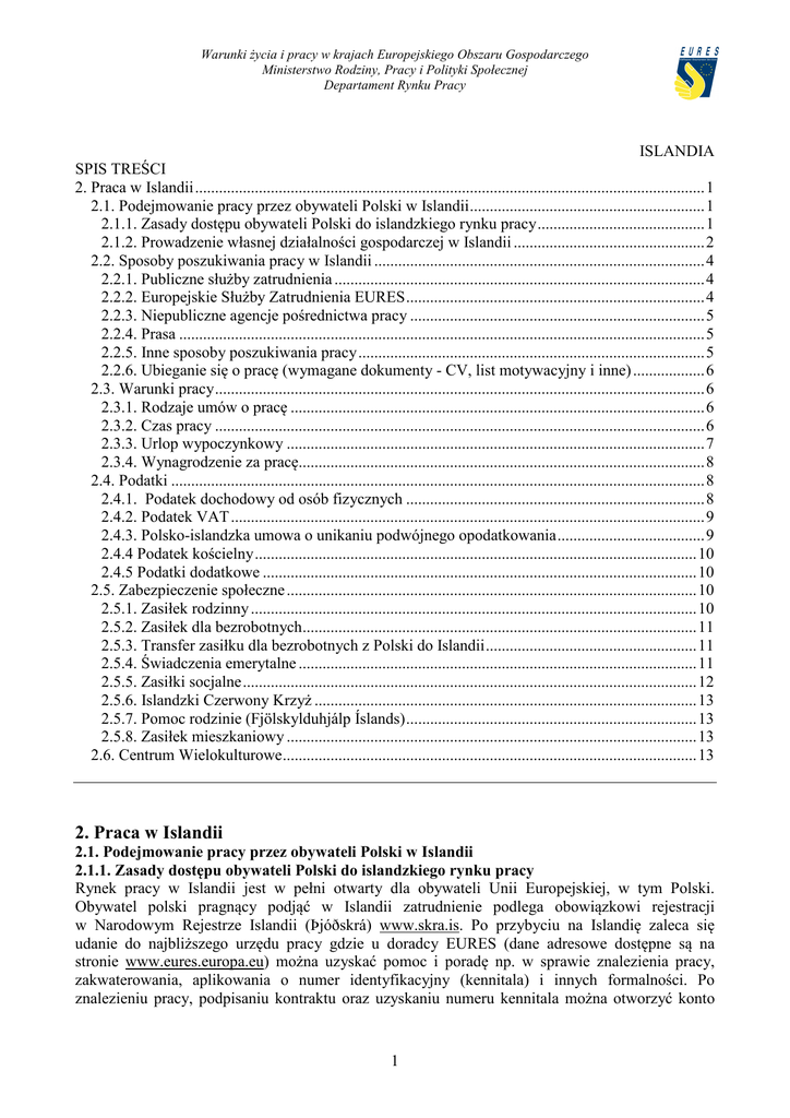 Warunki życia i pracy w krajach Europejskiego Obszaru Gospodarczego Ministerstwo Rodziny, Pracy i Polityki Społecznej Departament Rynku Pracy ISLANDIA SPIS TREŚCI 2. Praca w Islandii ................................................................................................................................ 1 2.1. Podejmowanie pracy przez obywateli Polski w Islandii ........................................................... 1 2.1.1. Zasady dostępu obywateli Polski do islandzkiego rynku pracy .......................................... 1 2.1.2. Prowadzenie własnej działalności gospodarczej w Islandii ................................................ 2 2.2. Sposoby poszukiwania pracy w Islandii ................................................................................... 4 2.2.1. Publiczne służby zatrudnienia ............................................................................................. 4 2.2.2. Europejskie Służby Zatrudnienia EURES ........................................................................... 4 2.2.3. Niepubliczne agencje pośrednictwa pracy .......................................................................... 5 2.2.4. Prasa .................................................................................................................................... 5 2.2.5. Inne sposoby poszukiwania pracy ....................................................................................... 5 2.2.6. Ubieganie się o pracę (wymagane dokumenty - CV, list motywacyjny i inne) .................. 6 2.3. Warunki pracy ........................................................................................................................... 6 2.3.1. Rodzaje umów o pracę ........................................................................................................ 6 2.3.2. Czas pracy ........................................................................................................................... 6 2.3.3. Urlop wypoczynkowy ......................................................................................................... 7 2.3.4. Wynagrodzenie za pracę...................................................................................................... 8 2.4. Podatki ...................................................................................................................................... 8 2.4.1. Podatek dochodowy od osób fizycznych ........................................................................... 8 2.4.2. Podatek VAT ....................................................................................................................... 9 2.4.3. Polsko-islandzka umowa o unikaniu podwójnego opodatkowania ..................................... 9 2.4.4 Podatek kościelny ............................................................................................................... 10 2.4.5 Podatki dodatkowe ............................................................................................................. 10 2.5. Zabezpieczenie społeczne ....................................................................................................... 10 2.5.1. Zasiłek rodzinny ................................................................................................................ 10 2.5.2. Zasiłek dla bezrobotnych ................................................................................................... 11 2.5.3. Transfer zasiłku dla bezrobotnych z Polski do Islandii ..................................................... 11 2.5.4. Świadczenia emerytalne .................................................................................................... 11 2.5.5. Zasiłki socjalne .................................................................................................................. 12 2.5.6. Islandzki Czerwony Krzyż ................................................................................................ 13 2.5.7. Pomoc rodzinie (Fjölskylduhjálp Íslands) ......................................................................... 13 2.5.8. Zasiłek mieszkaniowy ....................................................................................................... 13 2.6. Centrum Wielokulturowe ........................................................................................................ 13 2. Praca w Islandii 2.1. Podejmowanie pracy przez obywateli Polski w Islandii 2.1.1. Zasady dostępu obywateli Polski do islandzkiego rynku pracy Rynek pracy w Islandii jest w pełni otwarty dla obywateli Unii Europejskiej, w tym Polski. Obywatel polski pragnący podjąć w Islandii zatrudnienie podlega obowiązkowi rejestracji w Narodowym Rejestrze Islandii (Þjóðskrá) www.skra.is. Po przybyciu na Islandię zaleca się udanie do najbliższego urzędu pracy gdzie u doradcy EURES (dane adresowe dostępne są na stronie www.eures.europa.eu) można uzyskać pomoc i poradę np. w sprawie znalezienia pracy, zakwaterowania, aplikowania o numer identyfikacyjny (kennitala) i innych formalności. Po znalezieniu pracy, podpisaniu kontraktu oraz uzyskaniu numeru kennitala można otworzyć konto 1 Warunki życia i pracy w krajach Europejskiego Obszaru Gospodarczego Ministerstwo Rodziny, Pracy i Polityki Społecznej Departament Rynku Pracy bankowe i aplikować o kartę podatkową, a także załatwić formalności związane z pozwoleniem na pobyt (jest to jednak wymagane jedynie wówczas, gdy planujemy pobyt przekraczający 3 miesiące). Strona islandzka zastrzega jednak, iż problemy ze znalezieniem pracy mogą mieć osoby nieznające języka angielskiego. Ponadto od przyjeżdżających do pracy oczekiwana jest gotowość do podjęcia nauki języka islandzkiego. W Islandii dużo ofert pracy występuje zwykle w przemyśle rybnym oraz w rolnictwie, np. w gospodarstwach rolnych zajmujących się hodowlą trzody chlewnej i na fermach zwierząt futerkowych. Rośnie również zapotrzebowa