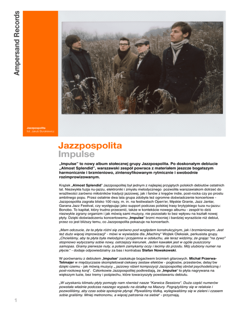 Ampersand Records Jazzpospolita fot. Jakub Burakiewicz Jazzpospolita Impulse „Impulse” to nowy album stołecznej grupy Jazzpospolita. Po doskonałym debiucie „Almost Splendid”, warszawski zespół powraca z materiałem jeszcze bogatszym harmonicznie i brzmieniowo, zintensyfikowanym rytmicznie i swobodnie rozimprowizowanym. Krążek „Almost Splendid” Jazzpospolitej był jednym z najlepiej przyjętych polskich debiutów ostatnich lat. Niezwykła fuzja nu-jazzu, elektroniki i zmysłu melodycznego pozwoliła warszawiakom dotrzeć do wrażliwości zarówno miłośników tradycji jazzowej, jak i fanów z kręgów indie, post-rocka czy po prostu ambitnego popu. Przez ostatnie dwa lata grupa zdobyła też ogromne doświadczenie koncertowe Jazzpospolita zagrała blisko 100 razy, m. in. na festiwalach Openʼer, Męskie Granie, Jazz Jantar, Garana Jazz Festival, czy występując jako support podczas polskiej trasy brytyjskiego tuza nu-jazzu: Bonobo. To kapitał, który trudno przecenić, także w kontekście nowego albumu - zespół to dziś niezwykle zgrany organizm i jak mówią sami muzycy, nie pozostało to bez wpływu na kształt nowej płyty. Dzięki doświadczeniu koncertowemu „Impulse” brzmi mocniej i bardziej wyraziście niż debiut, przez co jest bliższy temu, co Jazzpospolita pokazuje na koncertach. „Mam odczucie, że ta płyta różni się zarówno pod względem konstrukcyjnym, jak i brzmieniowym. Jest też dużo więcej improwizacji“ - mówi w wywiadzie dla „Machiny“ Wojtek Oleksiak, perkusista grupy. „Chcieliśmy, aby ta płyta była melodyjna i przyjemna w odsłuchu, ale teraz widzimy, że grając "na żywo" stopniowo wytyczamy sobie nowy, ostrzejszy kierunek. Jeden kawałek jest w ogóle puszczony samopas. Gramy pierwsze nuty, a potem zamykamy oczy i lecimy do przodu. Mój ulubiony numer na płycie.“ - dodaje odpowiedzialny za bas i kontrabas Stefan Nowakowski. W porównaniu z debiutem „Impulse“ zaskakuje bogactwem brzmień gitarowych. Michał PrzerwaTetmajer w międzyczasie skompletował ciekawy zestaw efektów - pogłosów, przesterów, delayʼów dzięki czemu - jak mówią muzycy „ jazzowy rdzeń kompozycji Jazzpospolitej obrósł psychodeliczną i post-rockową korą“. Członkowie Jazzpospolitej podkreślają, że „Impulse“ to płyta nagrywana na większym luzie, bez tremy i pośpiechu, które towarzyszyły powstawaniu debiutu. „W uzyskaniu klimatu płyty pomogły nam również nasze "Karwica Sessions". Duża część numerów powstała właśnie podczas naszego wypadu na działkę na Mazury. Pogrążyliśmy się w relaksie i pozwoliliśmy, aby czas sobie spokojnie płynął. Pływaliśmy łódką, wylegiwaliśmy się w zieleni i czasem sobie graliśmy. Mniej metronomu, a więcej patrzenia na siebie“ - przyznają. 1 JAZZPOSPOLITA IMPULSE Ampersand Records “Duża część numerów powstała właśnie podczas naszego wypadu na działkę na Mazury. Pogrążyliśmy się w relaksie i pozwoliliśmy, aby czas sobie spokojnie płynął. Pływaliśmy łódką, wylegiwaliśmy się w zieleni i czasem sobie graliśmy. Mniej metronomu, a więcej patrzenia na siebie.” Choć całość zagrana jest z niemal wirtuozerską sprawnością, filozofię pod hasłem: „mniej metronomu“ słychać już od pierwszych taktów płyty. Kompozycja „Co myślisz o wandalizmie“ napędzane pianistycznym loopem i motoryczną perkusją, ze znakomitymi partiami Tetmajera, to muzyczny wandalizm, który śmiało można stawiać za wzór wszystkim twórcom. Dla Jazzpospolitej, by zacytować klasyka, „Skyʼs the Limit” - w niektóch fragmentach zespół odlatuje w kosmiczno-psychodeliczne podróże śladami Hancocka circa „Sextant” czy Sun Ra. Po mocno nabijanych trzech kompozycjach na otwarcie, dwie kolejne - nieco wyciszone na wstępie, filmowe „Pobudzenie” z pięknymi gitarowymi pajęczynkami na gitarze oraz „Ciężkie Powietrze” z mocnym basowym groove, to chwila oddechu po szaleństwach z pierwszego impulsywnego kwadranasa. „Grzyb” to z kolei konkretne postrockowe pochody basu i gitary z doskonałym crescendo i kodą. Największą niespodzianką na płycie jest jednak brawurowa siedmiominutowa kompozycja „Nigdy nie pada na górnym Mokotowie” , swego rodzaju micro-improv-electro-jazz na przecięciu z elektroniczną awangardą spod znaku Mouse On Mars. To świadectwo tego, jak bardzo dojrzał stołeczny kwartet. Jazzpospolita zamykają zaś album wycieczką w stronę tradycji progresywnego jazz-rocka z lat 70tych, grając z werwą, której nie powstydziliby się Mahavishnu Orchestra na „In Flames”, Jaga Jazzist czy nawet...The Mars Volta. „Impulse” to po prostu burzliwa dźwiękowa odyseja, w której pamięć o korzeniach łączy się z futurystycznyimi wizjami - mocne potwierdzenie najwyższej formy jednego z najciekawszych polskich zespołów. Jazzpospolita Impulse 2012 Ampersand Records | d26 | premiera: 2012.02.27 Tracklista: 1. Co myślisz o wandalizmie? 2. Czerwona flaga (ale ja się kąpię) 3. Pasażer U-Boota 4. Pobudzenie 5. Ciężkie powietrze 6. Grzyb 7. Nigdy nie pada na górnym Mokotowie 8. Protest Song? 2