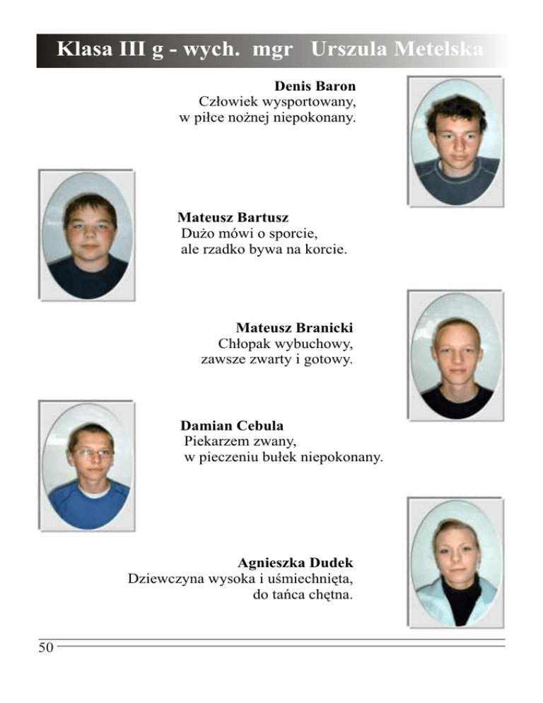 Klasa III g - wych. mgr Urszula Metelska Denis Baron Cz³owiek wysportowany, w pi³ce no¿nej niepokonany. Mateusz Bartusz Du¿o mówi o sporcie, ale rzadko bywa na korcie. Mateusz Branicki Ch³opak wybuchowy, zawsze zwarty i gotowy. Damian Cebula Piekarzem zwany, w pieczeniu bu³ek niepokonany. Agnieszka Dudek Dziewczyna wysoka i uœmiechniêta, do tañca chêtna. 50 Klasa III a - wyh. Mgr M. Strza³a Absolwenci PG 8 w Opolu Kamil Dudek Przewodnicz¹cy klasy, lubi imprezy, ogniska i przyjació³ z klasy. £ukasz Golec Dziêki temu bramkarzowi wygrywamy, gdy w pi³kê no¿n¹ gramy. Piotrek Hudala Ch³opak wygadany, dziêki silnemu charakterowi znany. Asia Joszko Przyjació³ka Simony i Józki, lubi ch³opaków i gruszki. ¯aneta Komor Piêkne nogi, ³adne rysy twarzy, ka¿demu ch³opakowi taka dziewczyna siê marzy. 51 Klasa III g - wych. mgr Urszula Metelska Simona Lakwa Humor œwietny ma i do tego ³adnie œpiewa. Krystyna Mross Przyjació³ka lubiana, przez wszystkich kochana. Karolina Niestrój Humanistka, nowej Rzeczpospolitej maturzystka. Anna Piechota Dziewczyna opalona, trochê pokrêcona. Sebastian Piechotta Niezbyt gadatliwy, lecz ch³opak sprawiedliwy. 52 Klasa III a - wyh. Mgr M. Strza³a Absolwenci PG 8 w Opolu Agnieszka Roziewska Dziewczyna ambitna, zawsze weso³a, inteligentna i sprytna. Marcin Segiet „Sergiejem” zwany, w nauce bardzo dobrze obeznany. Dorota Spik Dziewczyna z klas¹, elegancj¹, gracj¹ i pozytywn¹ motywacj¹. Jakub Tomczak Fizykê bardzo lubi, chyba j¹ poœlubi. Paulina Wocka Dyskoteki i zabawy lubi, z ch³opakami siê czubi. 53 Klasa III g - wych. mgr Urszula Metelska Dawid ¯wak Skrzypek radosny, wyœmienity, weso³y i trochê niewy¿yty. 54 Klasa III a - wyh. Mgr M. Strza³a Grono Pedagogiczne Wojciech Rerich Ma³gorzata Ludwikowska Maryla Strza³a Adamczyk Anna Adamska Jadwiga Agatowicz Krystyna Badur Regina Boryczka Agnieszka Chrabo³ Alicja Ciszkiewicz Ma³gorzata Dedyk Piotr F¹frowicz Jolanta Gazarkiewicz Ma³gorzata GaŸdzik Ewa Go³¹bek Maciej Gorecka Alicja Górniak S³awomir Gruca Lucyna Helman Maria Helwing Krzysztof Jantos Marzena Janusz Lilla Kaczmarek Tomasz Klimkowska Mariola Kowalczyk Aneta Koziuk Jadwiga Kutypa Gra¿yna Machaczek Anna Maæków Izabela Mechel Dorota Metelska Urszula Mi¹¿ek Iwona Mucha Ma³gorzata Namys³o Anna Nawrocki Robert Paurat Ingeborg Pobierowski Marek ks. Pustelak Krzysztof Pytel Danuta Rabiej Jaros³aw R¹czka Bogus³aw Sawczyn Danuta Selak Beata Siemieniuk Jolanta Skrêtkowski Tomasz Szpala Iwona Œlêzak Alina Turek Krystyna WoŸniak Marek Zabajewska Anna Zacharewicz Bartosz Zaniewicz Ma³gorzata Zaremba £ukasz 55