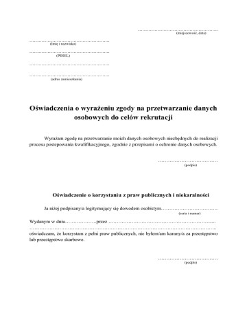 …………………………………………….. (miejscowość, data) …………………………………………….. (Imię i nazwisko) …………………………………………….. (PESEL) …………………………………………….. …………………………………………….. (adres zamieszkania) Oświadczenia o wyrażeniu zgody na przetwarzanie danych osobowych do celów rekrutacji Wyrażam zgodę na przetwarzanie moich danych osobowych niezbędnych do realizacji procesu postepowania kwalifikacyjnego, zgodnie z przepisami o ochronie danych osobowych. ……………………………… (podpis) Oświadczenie o korzystaniu z praw publicznych i niekaralności Ja niżej podpisany/a legitymujący się dowodem osobistym……………………………. (seria i numer) Wydanym w dniu……………….przez ……………………………………………………...... ………………………………………………………………………………………………….. oświadczam, że korzystam z pełni praw publicznych, nie byłem/am karany/a za przestępstwo lub przestępstwo skarbowe. ……………………………… (podpis) …………………………………………….. (miejscowość, data) …………………………………………….. (Imię i nazwisko) …………………………………………….. (PESEL) …………………………………………….. …………………………………………….. (adres zamieszkania) Oświadczenia kandydata o niewnoszeniu roszczeń do Komendanta Powiatowego PSP Ja niżej podpisany/a legitymujący się dowodem osobistym……………………………. (seria i numer) wydanym w dniu……………….przez ……………………………………………………...... ………………………………………………………………………………………………….. Oświadczam, że nie będę wnosił/a roszczeń do Komendanta Powiatowego PSP w Zambrowie o wypłatę odszkodowania z tytułu ewentualnego wypadku w trakcie przeprowadzania poszczególnych etapów procesu rekrutacji ……………………………… (podpis) …………………………. ………………………dnia………………. (pieczęć zakładu służby zdrowia) miejscowość data ZAŚWIADCZENIE LEKARSKIE o braku przeciwskazań zdrowotnych do wykonywania ćwiczeń fizycznych Zaświadcza się, że Pan/ Pani……………………………………………………………………. (imię i nazwisko) Urodzony/a…………………………………………..w………………………………………... (data urodzenia) (miejscowość) Zamieszkały/a:………………………………………………………………………………….. (adres) Jest zdolny/ zdolna do ćwiczeń wydolnościowych (próba harwardzka), testu sprawności fizycznej (podciąganie się na drążku, bieg na 50 i 1000 metrów), testu akrofobii ( wejście i zejście po drabinie mechanicznej nachylonej pod kątem 75 stopni, na wysokość 20 metrów) oraz nie ma przeciwskazań do udziału w sprawdzianie z umiejętności pływania (50 metrów stylem dowolnym). Zaświadczenie wydaje się w celu przedłożenia w Komendzie Powiatowej Państwowej Straży Pożarnej w Zambrowie dla potrzeb prowadzonej rekrutacji do służby. ……………………………… (pieczątka i podpis lekarza)
