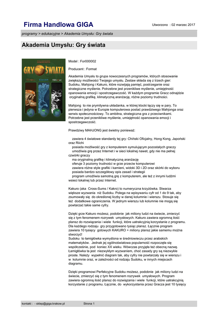 Firma Handlowa GIGA Utworzono : 02 marzec 2017 programy > edukacyjne > Akademia Umysłu: Gry świata Akademia Umysłu: Gry świata Model : For000002 Producent : Format Akademia Umysłu to grupa nowoczesnych programów, których stosowanie zwiększy możliwości Twojego umysłu. Zestaw składa się z trzech gier: Sudoku, Mahjong i Kakuro, które rozwijają pamięć, postrzeganie oraz strategiczne myślenie. Potrzebne jest przenikliwe myślenie, umiejętność opanowania emocji i spostrzegawczość. W każdym programie Gracz odnajdzie oryginalną grafikę, klimatyczną aranżację, różne poziomy trudności. Mahjong to nie prymitywna układanka, w której klocki łączy się w pary. To pierwsza i jedyna w Europie komputerowa postać prawdziwego Mahjonga oraz serwis społecznościowy. To ambitna, strategiczna gra z przeciwnikami. Potrzebne jest przenikliwe myślenie, umiejętność opanowania emocji i spostrzegawczość. Prawdziwy MAHJONG jest świetny ponieważ: zawiera 4 światowe standardy tej gry: Chiński Oficjalny, Hong Kong, Japoński oraz Riichi posiada możliwość gry z komputerem symulującym pozostałych graczy umożliwia grę przez Internet i w sieci lokalnej nawet, gdy nie ma pełnej czwórki graczy ma oryginalną grafikę i klimatyczną aranżację oferuje 3 poziomy trudności w grze przeciw komputerowi zawiera różne style grafiki i kamieni, widoki 3D i 2D oraz skórki do wyboru posiada bardzo szczegółowy opis zasad i strategii program umożliwia samotną grę z komputerem, ale też z innymi ludźmi wsieci lokalnej lub przez Internet. Kakuro (aka Cross-Sums / Kakro) to numeryczna krzyżówka. Stwarza większe wyzwania niż Sudoku. Polega na wpisywaniu cyfr od 1 do 9 tak, aby zsumowały się do określonej liczby w danej kolumnie i wierszu. Stosuje się też dodatkowe ograniczenia. W jednym wierszu lub kolumnie nie mogą się powtarzać takie same cyfry. Dzięki grze Kakuro możesz, podobnie jak miliony ludzi na świecie, zmierzyć się z tym fenomenem rozrywek umysłowych. Kakuro zawiera ogromną ilość plansz do rozwiązania i wiele funkcji, które uatrakcyjnią korzystanie z programu. Dla każdego rodzaju gry przygotowano tysiąc plansz. Łącznie program zawiera 10 tysięcy gotowych KAKURO + miliony plansz jakie samemu można stworzyć! Sudoku to łamigłówka wymyślona w średniowieczu przez arabskich matematyków. Jednak jej ogólnoświatowa popularność rozpoczęła się współcześnie, pod koniec XX wieku. Wówczas przyjęła też obecną nazwę. Łamigłówka ta jest niezwykłym wyzwaniem, choć zasady gry są niezwykle proste. Należy wypełnić diagram tak, aby cyfry nie powtarzały się w wierszu i w kolumnie oraz, w zależności od rodzaju Sudoku, w innych miejscach diagramu. Dzięki programowi Perfekcyjne Sudoku możesz, podobnie jak miliony ludzi na świecie, zmierzyć się z tym fenomenem rozrywek umysłowych. Program zawiera ogromną ilość plansz do rozwiązania i wiele funkcji, które uatrakcyjnią korzystanie z programu. Łącznie, do wykorzystania przez Gracza jest 10 tysięcy kontakt : - [email protected] Strona 1 Firma Handlowa GIGA programy > edukacyjne > Akademia Umysłu: Gry świata Akademia Umysłu: Gry świata plansz! Cena : 49,90 zł Brutto ( 49,90 zł Netto) kontakt : - [email protected] Strona 2 Utworzono : 02 marzec 2017