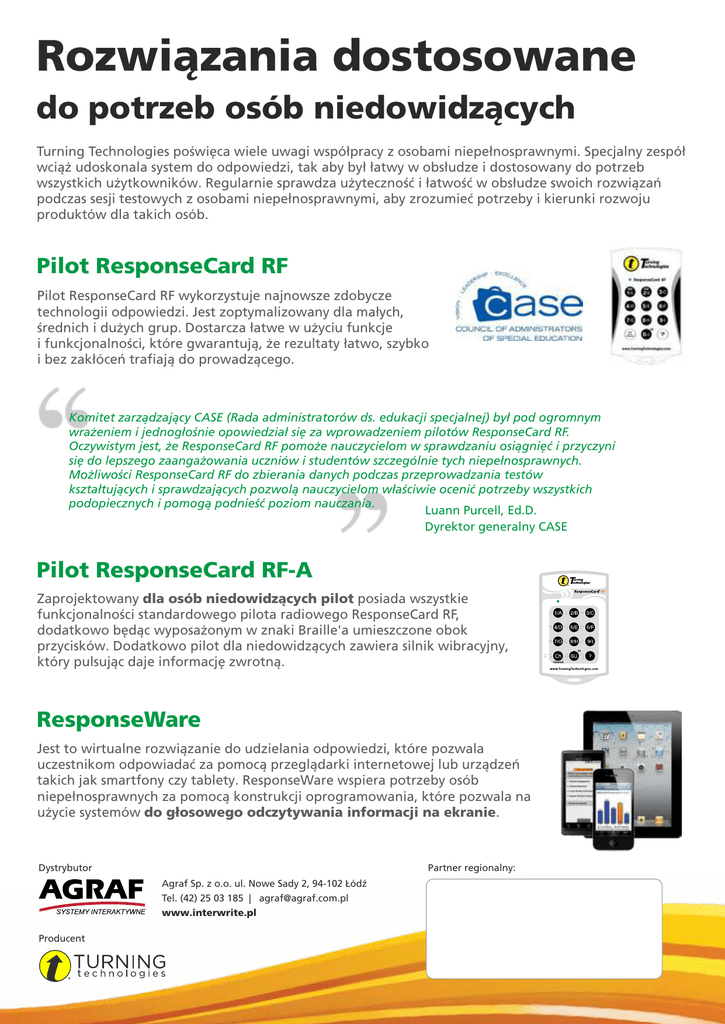 Rozwiązania dostosowane do potrzeb osób niedowidzących Turning Technologies poświęca wiele uwagi współpracy z osobami niepełnosprawnymi. Specjalny zespół wciąż udoskonala system do odpowiedzi, tak aby był łatwy w obsłudze i dostosowany do potrzeb wszystkich użytkowników. Regularnie sprawdza użyteczność i łatwość w obsłudze swoich rozwiązań podczas sesji testowych z osobami niepełnosprawnymi, aby zrozumieć potrzeby i kierunki rozwoju produktów dla takich osób. Pilot ResponseCard RF Pilot ResponseCard RF wykorzystuje najnowsze zdobycze technologii odpowiedzi. Jest zoptymalizowany dla małych, średnich i dużych grup. Dostarcza łatwe w użyciu funkcje i funkcjonalności, które gwarantują, że rezultaty łatwo, szybko i bez zakłóceń trafiają do prowadzącego. Komitet zarządzający CASE (Rada administratorów ds. edukacji specjalnej) był pod ogromnym wrażeniem i jednogłośnie opowiedział się za wprowadzeniem pilotów ResponseCard RF. Oczywistym jest, że ResponseCard RF pomoże nauczycielom w sprawdzaniu osiągnięć i przyczyni się do lepszego zaangażowania uczniów i studentów szczególnie tych niepełnosprawnych. Możliwości ResponseCard RF do zbierania danych podczas przeprowadzania testów kształtujących i sprawdzających pozwolą nauczycielom właściwie ocenić potrzeby wszystkich podopiecznych i pomogą podnieść poziom nauczania. Luann Purcell, Ed.D. Dyrektor generalny CASE Pilot ResponseCard RF-A Zaprojektowany dla osób niedowidzących pilot posiada wszystkie funkcjonalności standardowego pilota radiowego ResponseCard RF, dodatkowo będąc wyposażonym w znaki Braille'a umieszczone obok przycisków. Dodatkowo pilot dla niedowidzących zawiera silnik wibracyjny, który pulsując daje informację zwrotną. ResponseWare Jest to wirtualne rozwiązanie do udzielania odpowiedzi, które pozwala uczestnikom odpowiadać za pomocą przeglądarki internetowej lub urządzeń takich jak smartfony czy tablety. ResponseWare wspiera potrzeby osób niepełnosprawnych za pomocą konstrukcji oprogramowania, które pozwala na użycie systemów do głosowego odczytywania informacji na ekranie. Dystrybutor Partner regionalny: Agraf Sp. z o.o. ul. Nowe Sady 2, 94-102 Łódź Tel. (42) 25 03 185 | [email protected] www.interwrite.pl Producent