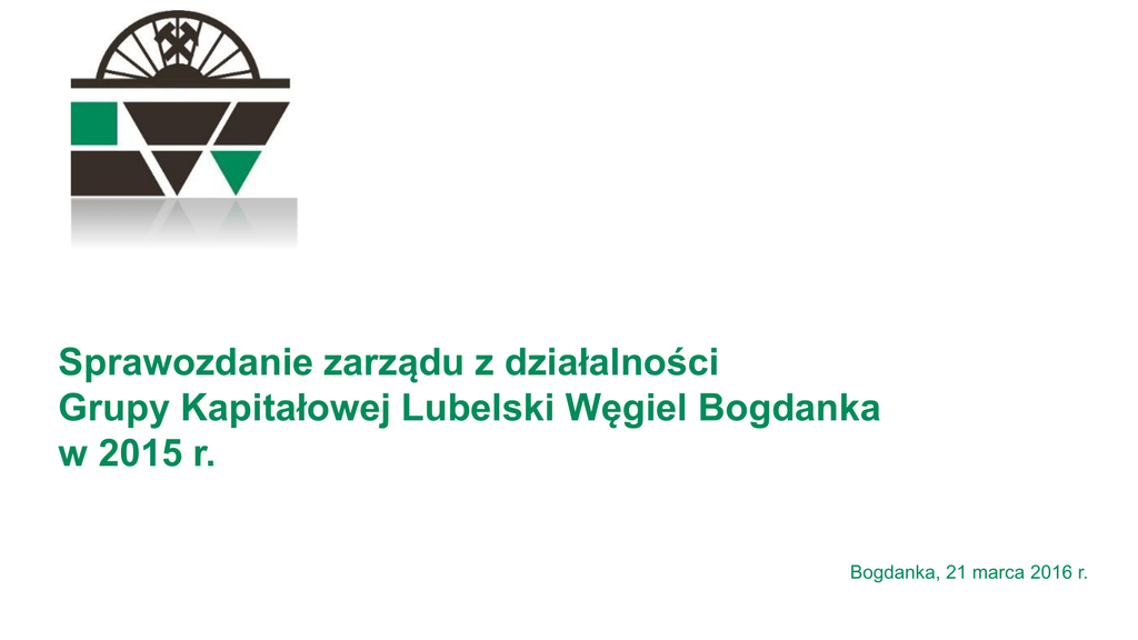 Sprawozdanie zarządu z działalności Grupy Kapitałowej Lubelski Węgiel Bogdanka w 2015 r. Bogdanka, 21 marca 2016 r. GK LW BOGDANKA W LICZBACH 2 11,9% Udział w rynku węgla kamiennego w Polsce -6,4% 14,4% Udział w rynku węgla energetycznego w Polsce -190,0% -202,7% -469,0% -505,4% EBIT +6,7% PRZYCHODY ZE SPRZEDAŻY 22,5% -33,0% -8,5% ZYSK NETTO -8,0% -7,8% -1,3% EBITDA PRODUKCJA NETTO -6,6% -21,9% +9,1% DŁUGOŚĆ WYKONANYCH WYROBISK SPRZEDAŻ WĘGLA (ILOŚĆ) Zmiana 2015/2014 Udział w dostawach węgla do energetyki zawodowej w Polsce Zmiana IVQ 2015/IVQ 2014 Corporate governance LIST PREZESA ZARZĄDU 3 Uzyskane w ubiegłym roku wyniki operacyjne były ujemne, co wynikało z faktu, iż zostały obciążone odpisem w kwocie 624,8 mln zł z tytułu utraty wartości rzeczowych aktywów trwałych i wartości niematerialnych i prawnych. Dokonanie odpisu stanowiło jednorazową operację o charakterze księgowym, która nie ma wpływu na bieżącą działalność operacyjną Grupy ani na jej sytuację płynnościową. Bez uwzględniania ww. odpisu osiągnęliśmy zysk operacyjny w wysokości 298,6 mln zł oraz wynik netto sięgający 226,4 mln zł, co należy uznać za solidne, satysfakcjonujące wyniki, biorąc pod uwagę ubiegłoroczną sytuację rynkową. Rok 2015 przyniósł również istotne zmiany w strukturze akcjonariatu Jednostki Dominującej. W wyniku ogłoszonego 14 września przez Enea SA wezwania do zapisywania się na sprzedaż akcji LW Bogdanka SA, Enea SA 29 października nabyła 64,57% tych walorów i wraz ze swoją spółka zależną Enea Wytwarzanie sp. z o.o. dysponuje łącznie 66% akcji Bogdanki. Funkcjonowanie w strukturach dużej grupy energetycznej stwarza nam nowe możliwości, wśród których na czoło wysuwa się stabilizacja poziomu zbytu surowca oraz perspektywa jego zwiększenia, związana z dostawami do nowego bloku w Kozienicach. Szanowni Państwo, Mam przyjemność oddać do Państwa rąk skonsolidowany raport roczny GK LW Bogdanka za 2015 rok. Był to dla nas okres niezwykle złożony, pełen wyzwań, z jakimi nie mieliśmy do czynienia bodaj od początku istnienia Grupy. Spadające ceny węgla, które na rynkach międzynarodowych obniżyły się w skali roku o 27% do ok. 50 USD za tonę i osiągnęły historyczne minima, nadpodaż surowca oraz duży poziom jego zapasów u głównych krajowych odbiorców, mniejsze zapotrzebowani na węgiel, skomplikowana sytuacja śląskich kopalń – to tylko kilka z rynkowych uwarunkowań, w jakich przyszło nam funkcjonować w 2015 roku. Dostosowując się do nich zmuszeni byliśmy zweryfikować plan produkcji węgla handlowego i zrealizować go na poziomie 8,5 mln ton, niższym o 8,0% od osiągniętego w 2014 roku. Optymalizacja wydobycia była kluczowym elementem programu, jaki wdrożyliśmy w roku 2015, by dostosować działalność Grupy do możliwości sprzedażowych na coraz trudniejszym rynku. Obejmował on ponadto redukcję kosztów oraz optymalizację nakładów inwestycyjnych i zatrudnienia. Nasz plan zrealizowaliśmy z sukcesem, wypracowując w minionym roku przychody ze sprzedaży na poziomie prawie 1,9 mld zł oraz wynik EBITDA wynoszący 686,3 mln zł. Utrzymaliśmy również satysfakcjonujący wskaźnik rentowności EBITDA, który w 2015 r. osiągnął 36,4% i pozostał na ponadprzeciętnym dla branży poziomie. Nasza Grupa zawsze skutecznie konkurowała efektywnością opartą na rachunku ekonomicznym. Również w minionym roku Bogdanka utrzymała pozycję lidera kosztowego wśród krajowych producentów węgla kamiennego i najbardziej efektywnej kopalni w Polsce. Dołożymy wszelkich starań, by tak było również w przyszłości. Najbliższe lata zapowiadają się na równie trudne, jak rok miniony. Nic nie wskazuje na to, by ceny węgla miały wzrosnąć, a sytuacja śląskich kopalń miała ulec znaczącej poprawie. Nauczeni doświadczeniem 2015 roku jesteśmy dobrze przygotowani na te warunki i wyzwania. Dostosowaliśmy produkcję węgla do możliwości jego sprzedaży, kontynuujemy realizację programu optymalizacji kosztów, zachowujemy bezpieczny poziom płynności finansowej, co po raz kolejny pozytywnie wyróżniło nas na tle polskiej branży górniczej. Prowadzimy też intensywne działania, których celem jest wejście na nowe rynki, w tym zagraniczne, i pozyskanie nowych odbiorców, zwłaszcza w grupie małych i średnich przedsiębiorstw. W obecnej trudnej i zmiennej sytuacji rynkowej chcemy przede wszystkim zapewnić Grupie z jednej strony stabilność finansową, z drugiej zaś elastyczność działalności operacyjnej. Pozwoli to, w przypadku poprawy możliwości sprzedażowych, na zwiększenie produkcji oraz efektywniejsze wykorzystanie mocy wytwórczych. GK LW Bogdanka jest najbardziej efektywną i nowoczesną kopalnią w Polsce. Posiada wszelkie atuty niezbędne do tego, by po raz kolejny sprostać trudnym warunkom rynkowym oraz umocnić swoją biznesową pozycję z korzyścią dla wszystkich interesariuszy. Z wyrazami szacunku, Prezes Zarządu LW Bogdanka SA 1. Podsumowanie operacyjne PODSUMOWANIE OPERACYJNE 5 1. Podsumowanie operacyjne 4-7 Wybrane dane finansowe oraz kluczowe dane operacyjne 5 Najważniejsze wydarzenia w 2015 r. 6-7 2. Organizacja i działalność GK LW Bogdanka 8-44 Struktura Grupy 10-13 Strategia rozwoju 14-15 Działania inwestycyjne 16-18 Umowy 19-22 Otoczenie biznesowe 23-27 Zarządzanie ryzykiem 28-35 Środowisko naturalne 36-38 Zatrudnienie 39-40 Wynagrodzenia 41 • 1.885,4 mln zł przychodów ze sprzedaży netto – mniej o 6,4% r/r • 686,3 mln zł EBITDA – mniej o 8,5% r/r • 280,0 mln zł strata netto W IV kwartale przychody ze sprzedaży wyniosły 558,4 mln zł - wzrost o 6,7% r/r, wynik EBITDA wyniósł 228,2 mln zł i był o 7,8% niższy niż przed rokiem, a zysk netto ukształtował się na poziomie -411,8 mln zł. Czynniki wpływające na zrealizowane przez GK LW Bogdanka wyniki finansowe zostały przedstawione na poniższym schemacie: 