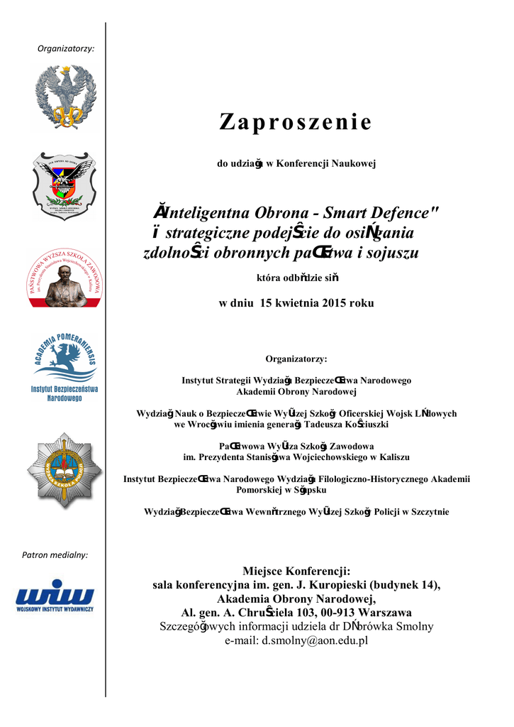 Organizatorzy: Za p r o s z e n i e do udziału w Konferencji Naukowej „Inteligentna Obrona - Smart Defence" – strategiczne podejście do osiągania zdolności obronnych państwa i sojuszu która odbędzie się w dniu 15 kwietnia 2015 roku Organizatorzy: Instytut Strategii Wydziału Bezpieczeństwa Narodowego Akademii Obrony Narodowej Wydział Nauk o Bezpieczeństwie Wyższej Szkoły Oficerskiej Wojsk Lądowych we Wrocławiu imienia generała Tadeusza Kościuszki Państwowa Wyższa Szkoła Zawodowa im. Prezydenta Stanisława Wojciechowskiego w Kaliszu Instytut Bezpieczeństwa Narodowego Wydziału Filologiczno-Historycznego Akademii Pomorskiej w Słupsku Wydział Bezpieczeństwa Wewnętrznego Wyższej Szkoły Policji w Szczytnie Patron medialny: Miejsce Konferencji: sala konferencyjna im. gen. J. Kuropieski (budynek 14), Akademia Obrony Narodowej, Al. gen. A. Chruściela 103, 00-913 Warszawa Szczegółowych informacji udziela dr Dąbrówka Smolny e-mail: [email protected] Według raportu Sztokholmskiego Międzynarodowego Instytutu Badań nad Pokojem (SIPRI) transfer technologii obronnych w latach 2009-2013 był o 14% wyższy niż w latach 2004-20081. Jednak większość państw europejskich od kilku lat redukuje wydatki wojskowe2, co jest podyktowane oszczędnościową polityką budżetową poszczególnych państw. Obniżenie wysokości wydatków dotyczy również państw, które dotychczas w znacznym stopniu finansowały działalność NATO. Plany cięć budżetowych obejmują m.in. Niemcy i Włochy (10%), Wielką Brytanię (7,5%), a także Francję3. Znaczne ograniczenia wydatków na obronę zostały również zaplanowane w budżecie amerykańskim. Podczas gdy europejscy członkowie NATO stale obniżają wartość zakupów uzbrojenia, globalne wydatki na obronę w latach 2001-2010 wzrosły o 50%. W tym okresie wzrost wydatków poniesionych przez państwa europejskie wyniósł zaledwie 4,1%, natomiast w przypadku Chin koszty te wzrosły o 189%, Rosji – 82%, Indii – 54%, a Arabii Saudyjskiej – 63%4. Duże wyzwanie w zakresie osiągania zdolności przez sojusznicze siły zbrojne stanowi również brak zharmonizowanych procedur pozyskiwania uzbrojenia i sprzętu wojskowego wśród członków NATO, czego rezultatem jest rozwijanie konkurencyjnych programów modernizacyjnych, a tym samym zwiększenie kosztów. Powyższe trendy podważają wiarygodność Sojuszu Północnoatlantyckiego jako gwaranta bezpieczeństwa międzynarodowego. Biorąc pod uwagę konieczność zapewnienia skutecznej obrony interesów narodowych i sojuszniczych przy równoczesnym spadku wydatków na obronę, podczas Szczytu NATO w Lizbonie w 2010 roku, została zainicjowana koncepcja tzw. „Inteligentnej Obrony” („Smart Defence”), mająca na celu zapobieżenie negatywnym skutkom zaistniałych trendów, a którą często określa się jako „program zapewniania większego bezpieczeństwa za mniejsze środki”5. Inicjatywę „Smart Defence” definiuje się jako „zespół przedsięwzięć, których celem jest rozwój i utrzymanie zdolności obronnych w ramach współpracy międzynarodowej, w warunkach ograniczonego budżetu”6. Polska angażuje się w realizację założeń „Inteligentnej Obrony”. W tym zakresie została zgłoszona gotowość do partycypacji w 12 programach obejmujących, m.in. wspólne wykorzystanie morskich samolotów patrolowych, wymianę informacji o sytuacji na morzu, logistykę międzynarodową, rozwój zdolności do obrony przed bronią masowego rażenia oraz wspólne szkolenie wojsk z wykorzystaniem zaawansowanych narzędzi informatycznych i symulatorów7. Koncepcja „Inteligentnej Obrony” ma jednak przeciwników. Główne zarzuty dotyczą przede wszystkim utraty suwerenności państw członkowskich i uzależnienia zdolności własnych sił zbrojnych od pozostałych członków sojuszu. W tym kontekście podnosi się również kwestię przyszłego funkcjonowania, struktury i możliwości przemysłowego potencjału obronnego, przede wszystkim w wymiarze narodowym. Pojawiają się także opinie, 1 Trends in international arms transfers, 2013, SIPRI Fact Sheet, March 2013, http://books.sipri.org/files/FS/ SIPRIFS1403.pdf [31.03.2014]. 2 Na Szczycie NATO w Walii we wrześniu 2015 roku kraje członkowskie zapowiedziały zwiększenie wydatków na cele obronne do poziomu 2 proc. PKB w ciągu dekady. 3 C.Grand, Smart Defense, Smart Defense and teh Future of NATO: Can the Alliance Meet the Challenge sof the Twenty-First Century, Conference Report and Expert Papers, The Chicago Council on Global Affairs, March 2830, 2012, s. 45. 4 Tamże, s. 46. 5 Rekomendacje Stowarzyszenia Euro-Atlantyckiego Polska a NATO, Polska a NATO, SEA, 27.04.2011. 6 Efektywna współpraca międzynarodowa, rozmowa z gen. M. Cieniuchem, szefem SG WP, Fakty, http://www.sgwp.wp.mil.pl/plik/file/publikacje/FMGosp_efektywna.pdf [07.04.2014]. 7 Efektywna współpraca… że nie można stworzyć większej obrony przy wykorzystaniu mniejszych środków. W tym kontekście powstaje pytanie czy koncepcja „Inteligentnej Obrony” nie stanie się w przyszłości jedynie „błyskotką konceptualną”8? Celem konferencji będzie wypracowanie wniosków przydatnych do rozwiązania problemu badawczego w postaci następującego pytania: Czy w kontekście ograniczonych możliwości budżetowych „Inteligentna Obrona” stanie się [może stać się] rozwiązaniem pozwalającym osiągnąć zdolności obronne zarówno w wymiarze narodowym, jak i sojuszniczym? W związku z powyższym, debata zostanie ukierunkowana na odnalezienie odpowiedzi na najważniejsze problemy badawcze w brzmieniu: 1. Jaki powinien być zakres suwerenności państwa w dziedzinie zapewnienia strategicznej odporności kraju na zagrożenia w kontekście spełnienia założeń „Inteligentnej Obrony”? 2. Jakie powinny być kierunki rozwoju zdolności obronnych państwa w kontekście nowoczesnej strategii państwa i sojuszu? 3. W jaki sposób można wy