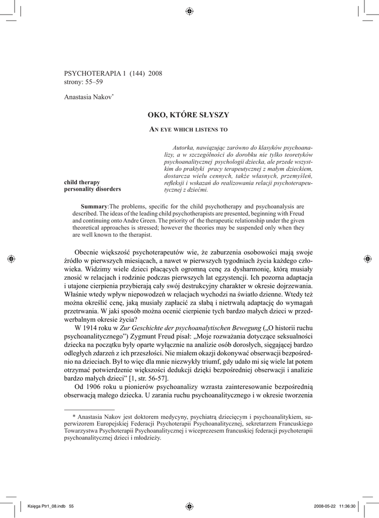 Psychoterapia 1 (144) 2008 strony: 55–59 Anastasia Nakov* Oko, które słyszy An eye which listens to child therapy personality disorders Autorka, nawiązując zarówno do klasyków psychoanalizy, a w szczególności do dorobku nie tylko teoretyków psychoanalitycznej psychologii dziecka, ale przede wszystkim do praktyki pracy terapeutycznej z małym dzieckiem, dostarcza wielu cennych, także własnych, przemyśleń, refleksji i wskazań do realizowania relacji psychoterapeutycznej z dziećmi. Summary:The problems, specific for the child psychotherapy and psychoanalysis are described. The ideas of the leading child psychotherapists are presented, beginning with Freud and continuing onto Andre Green. The priority of the therapeutic relationship under the given theoretical approaches is stressed; however the theories may be suspended only when they are well known to the therapist. Obecnie większość psychoterapeutów wie, że zaburzenia osobowości mają swoje źródło w pierwszych miesiącach, a nawet w pierwszych tygodniach życia każdego człowieka. Widzimy wiele dzieci płacących ogromną cenę za dysharmonię, którą musiały znosić w relacjach i rodzinie podczas pierwszych lat egzystencji. Ich pozorna adaptacja i utajone cierpienia przybierają cały swój destrukcyjny charakter w okresie dojrzewania. Właśnie wtedy wpływ niepowodzeń w relacjach wychodzi na światło dzienne. Wtedy też można określić cenę, jaką musiały zapłacić za słabą i nietrwałą adaptację do wymagań przetrwania. W jaki sposób można ocenić cierpienie tych bardzo małych dzieci w przedwerbalnym okresie życia? W 1914 roku w Zur Geschichte der psychoanalytischen Bewegung („O historii ruchu psychoanalitycznego”) Zygmunt Freud pisał: „Moje rozważania dotyczące seksualności dziecka na początku były oparte wyłącznie na analizie osób dorosłych, sięgającej bardzo odległych zdarzeń z ich przeszłości. Nie miałem okazji dokonywać obserwacji bezpośrednio na dzieciach. Był to więc dla mnie niezwykły triumf, gdy udało mi się wiele lat potem otrzymać potwierdzenie większości dedukcji dzięki bezpośredniej obserwacji i analizie bardzo małych dzieci” [1, str. 56-57]. Od 1906 roku u pionierów psychoanalizy wzrasta zainteresowanie bezpośrednią obserwacją małego dziecka. U zarania ruchu psychoanalitycznego i w okresie tworzenia * Anastasia Nakov jest doktorem medycyny, psychiatrą dziecięcym i psychoanalitykiem, superwizorem Europejskiej Federacji Psychoterapii Psychoanalitycznej, sekretarzem Francuskiego Towarzystwa Psychoterapii Psychoanalitycznej i wiceprezesem francuskiej federacji psychoterapii psychoanalitycznej dzieci i młodzieży. Księga Ptr1_08.indb 55 2008-05-22 11:36:30 56 Anastasia Nakov teorii były to głównie obserwacje dzieci samych psychoanalityków. Jak pokazano we fragmencie cytowanym powyżej, sam Zygmunt Freud wykorzystywał dane zebrane na podstawie obserwacji do rozbudowywania swoich teorii. To właśnie obserwacja wnuka Ernsta bawiącego się szpulką pozwoli mu na sformułowanie pierwszej wersji pojęcia: popęd śmierci. Nic więc dziwnego, że odnajdujemy tego samego Ernsta jako wybitnego obserwatora niemowląt w Hampstead Clinic — sławnym ośrodku Anny Freud. Od 1925 roku Anna Freud włącza do swojego projektu psychoanalitycznej psychologii dziecka bezpośrednią obserwację dzieci. Przez całe życie będzie tworzyć przedszkola dla dzieci zdrowych, pokrzywdzonych lub niepełnosprawnych. Podczas drugiej wojny światowej stworzy w Londynie słynne Hampstead Nurseries. W przeciwieństwie do szkoły Anny Freud, szkoła Melanie Klein będzie aż do 1945 roku mało zainteresowana światem zewnętrznym dziecka. Dopiero w 1948 roku, na prośbę Johna Bowlby’ego, Esther Bick rozwinie metodę obserwacji niemowląt w rodzinie. W artykule z 1964 roku, który ukazał się w „International Journal of Psychoanalysis” [2], umieszcza opis tego doświadczenia. Ponad czterdzieści lat temu metoda ta weszła do kanonu różnych angielskich szkół psychoanalizy. Jej wpływ znacznie przewyższył pierwotny cel dydaktyczny. Metoda Esther Bick stała się prawdziwym źródłem inspiracji w psychoanalitycznym leczeniu niemowląt. Od 1980 roku nasze możliwości terapeutyczne bardzo się rozwinęły. Wzbogaciły je prace — takich psychoanalityków, jak Stern, Emde, Cramer (i wielu innych) — na temat noworodków i ich wczesnych sposobów interakcji z obiektem matki. We Francji Serge Lebovici [3] wprowadził pojęcie interakcji fantazmatycznej (interaction phantasmatique), aby opisywać relacje inter- i intrasubiektywne na tle międzypokoleniowego przekazu konfliktów. Konfrontacja z bardzo małym dzieckiem i jego rodzącym się światem psychicznym rozbudza archaiczne odczucia, będące podstawą pierwotnego chaosu, z którego narodzi się i rozwinie myśl. Obserwator uczy się słuchać głębokich przeżyć przekazywanych mu przez niemowlę i jego matkę poprzez swoje emocje, fantazmy, a nawet ciało. W ten sposób terapeuta, tak samo jak obserwator, musi nabyć umiejętności widzenia w dwóch perspektywach — mieć „oko”, które patrzy na to, co dzieje się na zewnątrz niego, między niemowlęciem i matką, oraz „oko”, które spogląda na to, co dzieje się w nim samym — wykorzystując podstawowe „narzędzie”, jakim jest w terapii dzieci przeciwprzeniesienie (tak samo ważne w terapii pacjentów dorosłych, szczególnie pacjentów psychotycznych). Terapeuta musi także mieć umiejętność podwójnego odczytywania materiału obserwacji. Pierwszym jest „mikroskopowe” odczytanie zdarzeń emocjonalnych, zaczynając od najmniejszych sygnałów cielesnych wyrażanych przez niemowlę, do mających miejsce w ciele terapeuty. To pierwsze odczytanie musi się nakładać na odczytanie drugie: „makroskopowe”, które wyznacza główne linie rozwoju dziecka i które tworzy rodzaj historii i geografii jego wewnętrznej przestrze