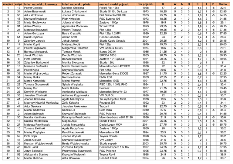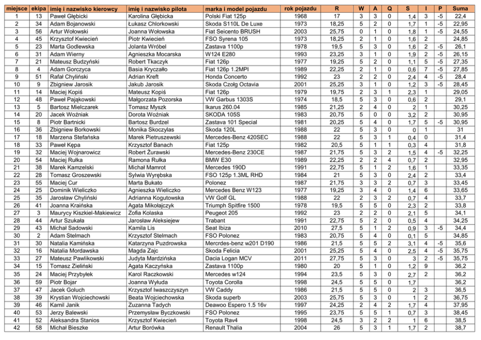miejsce ekipa imię i nazwisko kierowcy 1 13 Paweł Głębicki 2 34 Adam Bojanowski 3 56 Artur Wołowski 4 45 Krzysztof Kwiecień 5 23 Marta Godlewska 6 31 Adam Wierny 7 21 Mateusz Budzyński 8 4 Adam Gorczyca 9 51 Rafał Chyliński 10 9 Zbigniew Jarosik 11 14 Maciej Kopiś 12 48 Paweł Pająkowski 13 5 Bartosz Mielczarek 14 20 Jacek Woźniak 15 8 Piotr Bartnicki 16 36 Zbigniew Borkowski 17 18 Marzena Stefańska 18 33 Paweł Kępa 19 32 Maciej Wojnarowicz 20 54 Maciej Rułka 21 38 Marek Kamzelski 22 28 Tomasz Groszewski 23 55 Maciej Cur 24 25 Dominik Wieliczko 25 35 Jarosław Chyliński 26 41 Joanna Kraińska 27 3 Maurycy Kiszkiel-Makiewicz 28 44 Artur Szukała 29 43 Michał Sadowski 30 2 Adam Stelmach 31 30 Natalia Kamińska 32 16 Natalia Mordawska 33 27 Mateusz Pawlikowski 34 15 Tomasz Zieliński 35 24 Maciej Przybyłek 36 59 Piotr Bojar 37 47 Jacek Goluch 38 39 Krystian Wojciechowski 39 46 Kamil Janik 40 53 Jerzy Balewski 41 52 Aleksandra Stanios 42 58 Michał Bieszke imię i nazwisko pilota Karolina Głębicka Łukasz Chlorkowski Joanna Wołowska Piotr Kwiecień Jolanta Wróbel Agnieszka Mocarska Robert Tkaczyk Basia Kryczałło Adrian Kreft Jakub Jarosik Mateusz Kopiś Małgorzata Pozorska Tomasz Myszk Dorota Woźniak Bartosz Burdzel Monika Skoczylas Marek Pietruszewski Krzysztof Banach Robert Żurawski Ramona Rułka Michał Mamrot Sylwia Wyrębska Marta Bukato Agnieszka Wieliczko Adrianna Kogutowska Agata Mikołajczyk Zofia Kolaska Jarosław Aleksiejew Kamila Lis Krzysztof Stelmach Katarzyna Puzdrowska Magda Zajc Judyta Mardzińska Agata Kaczyńska Karol Raczkowski Joanna Wyłuda Krzysztof Iwaszczyszyn Beata Wojciechowska Zuzanna Tadych Przemysław Byczkowski Krzysztof Kwiecień Artur Borówka marka i model pojazdu Polski Fiat 125p Skoda S110L De Luxe Fiat Seicento BRUSH FSO Syrena 105 Zastava 1100p W124 E280 Fiat 126p Fiat 126p 1.2MPI Honda Concerto Skoda Czołg Octavia Fiat 126p VW Garbus 1303S Ikarus 260.04 SKODA 105S Zastava 101 Special Skoda 120L Mercedes-Benz 420SEC Fiat 125p Mercedes-Benz 230CE BMW E30 Mercedes 190D FSO 125p 1.3ML RHD Polonez Mercedes Benz W123 VW Golf GL Triumph Spitfire 1500 Peugeot 205 Trabant Seat Ibiza FSO Polonez Mercrdes-benz w201 D190 Skoda Felicia Dacia Logan MCV Zastava 1100p Mercedes w124 Toyota Corolla VW Caddy Skoda superb Deawoo Espero 1.5 16v FSO Polonez Toyota Rav4 Renault Thalia rok pojazdu 1968 1973 2003 1973 1978 1993 1977 1989 1992 2001 1979 1974 1985 1983 1981 1988 1988 1982 1987 1989 1991 1984 1987 1977 1988 1978 1992 1991 2010 1983 1986 2001 2011 1980 1994 1998 1986 2003 1997 1995 1998 2004 R 17 18,25 25,75 18,25 19,5 23,25 19,25 22,25 23 25,25 19,75 18,5 21,25 20,75 20,25 22 22 20,5 21,75 22,25 22,75 21 21,75 19,25 22 19,5 23 22,75 27,5 20,75 21,5 25,25 27,75 20 23,5 24,5 21,5 25,75 24,25 23,75 24,5 26 W 3 5 0 2 5 3 5 2 2 3 2 5 2 5 5 5 5 5 5 2 5 5 3 3 2 5 2 5 5 5 5 5 5 5 5 5 5 5 2 5 3 5 A 3 2 1 1 3 1 2 1 2 1 3 3 4 0 4 3 3 1 3 2 1 3 3 4 3 5 2 2 1 4 5 4 3 1 3 5 5 3 4 5 2 3 Q 0 0 0 0 0 0 0 0 0 0 1 0 0 0 0 0 1 1 2 4 2 0 2 0 2 0 0 0 2 0 2 0 0 0 0 0 0 0 2 1 2 1 S 1,4 1,7 1,8 1,6 1,6 1,9 1,1 0,6 2,4 1,2 2,3 0,6 2 3,2 1,7 0 0,4 0,3 1,5 0,7 1,6 2,4 0,7 1,4 0,7 2,3 2,1 0,5 0,9 0,1 3,1 2,5 3 1,2 2,7 1,7 2 1 1,7 0,7 1 1,7 I 3 1 1 2 2 2 5 7 4 3 1 2 1 2 5 1 0 4 4 2 1 2 3 6 4 2 5 4 3 5 4 4 2 9 2 3 2 4 3 6 2 P -5 -5 -5 -5 -5 -5 -5 -5 -5 -5 -5 -5 -5 -5 -5 Suma 22,4 22,95 24,55 24,85 26,1 26,15 27,35 27,85 28,4 28,45 29,05 29,1 30,25 30,95 30,95 31 31,4 31,8 32,25 32,95 33,35 33,4 33,45 33,65 33,7 33,8 34,1 34,25 34,4 34,85 35,6 35,75 35,75 36,2 36,2 36,2 36,5 36,75 37,95 38,45 38,5 38,7 43 42 Jakub Wyrębski Bogna Wyrębska 44 45 46 47 48 49 50 51 52 53 54 6 10 12 50 40 7 37 17 11 19 1 Paweł Żuber Paweł Ziemniewicz Mirosław Zdończyk Marcin Czajkowski Wojciech Nowak Bartosz Blaszke Artur Gorczyca Łukasz Piszczek Jarosław Sienkiewicz Krzysztof Buraczewski Maciej Szostek Marysia Arasim Bogusia Ziemniewicz Jakub Zdończyk Marek Czajkowski Marek Gorlewicz Marcin Ząbczyk Łukasz Frost Karolina Walicka Anna Fałtynowicz Anna Buraczewska Agnieszka Brzeska Mercedes W124 e-class 200D VW T3 Ford Transit Custom Toyota yaris Citroen AX Renault Kangoo Ford focus Kia Sephia II Mazda 6 VW PASSAT Opel Meriva Yugo Koral 1.3i LEGENDA R rocznik pojazdu rzut woreczkiem z grochem na W starcie A rzut alternatorem na mecie Q quiz komunikacja miejska S tor kapslowy I itinerer P przebranie 1995 23,75 3 5 2 1990 2013 2007 1993 2009 2003 2000 2007 1997 2003 1998 22,5 28,25 26,75 23,25 27,25 25,75 25 26,75 24,25 25,75 24,5 5 5 5 5 5 5 5 2 5 5 5 2 0 1 5 4 5 5 1 2 2 3 0 2 0 1 0 3 2 1 5 2 9 1,1 0,8 2,2 1,2 0,9 0,2 0,9 2,8 1,3 5 2,6 2,9 4 38,85 9 2 11 6 6 3 5 14 6 18 10 39,3 39,45 39,95 41,15 42,45 42,65 44,8 46,05 47,25 50,35 54,4 -5 -5