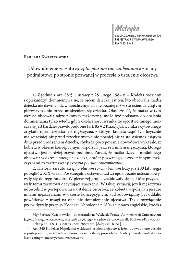 Barbara Kwiatkowska Udowodnienie zarzutu exceptio plurium concumbentium a zmiany podmiotowe po stronie pozwanej w procesie o ustalenie ojcostwa 1. Zgodnie z art. 85 § 1 ustawy z 25 lutego 1964 r. – Kodeks rodzinny i opiekuńczy1 domniemywa się, że ojcem dziecka jest ten, kto obcował z matką dziecka nie dawniej niż w trzechsetnym, a nie później niż w sto osiemdziesiątym pierwszym dniu przed urodzeniem się dziecka. Okoliczność, że matka w tym okresie obcowała także z innym mężczyzną, może być podstawą do obalenia domniemania tylko wtedy, gdy z okoliczności wynika, że ojcostwo innego mężczyzny jest bardziej prawdopodobne (art. 85 § 2 K.r.o.). Jak wynika z cytowanego artykułu ojcem dziecka jest mężczyzna, z którym kobieta współżyła fizycznie nie wcześniej niż przed trzechsetnym i nie później niż w sto osiemdziesiątym dniu przed urodzeniem dziecka, chyba że postępowanie dowodowe wykazało, iż kobieta w okresie koncepcyjnym współżyła jeszcze z innym mężczyzną, którego ojcostwo jest bardziej prawdopodobne. Zarzut, że matka dziecka nieślubnego obcowała w okresie poczęcia dziecka, oprócz pozwanego, jeszcze z innymi mężczyznami to zarzut zwany exceptio plurium concumbentium. 2. Historia zarzutu exceptio plurium concumbentium liczy już 200 lat i sięga początków XIX wieku. Poszczególne ustawodawstwa epoki różnie ustosunkowywały się do tego zarzutu. W pierwszej grupie znajdowały się te, które przyznawały temu zarzutowi decydujące znaczenie. W takiej sytuacji, jeżeli mężczyzna udowodnił w postępowaniu o ustalenie ojcostwa, że kobieta współżyła z jeszcze innymi mężczyznami w okresie koncepcyjnym, Sąd zobowiązany był oddalić powództwo z uwagi na obalenie domniemanie ojcostwa. Takie rozwiązanie przewidywały przepisy Kodeksu Napoleona z 1804 r.2, prawo angielskie, kodeks Mgr Barbara Kwiatkowska – doktorantka na Wydziale Prawa i Administracji Uniwersytetu Jagiellońskiego w Krakowie, asystentka sędziego w Sądzie Rejonowym dla Krakowa-Krowodrzy 1 Tekst jedn.: Dz. U. z 2012 r., poz. 788 ze zm. [dalej cyt.: K.r.o.]. 2 Art. 340 Kodeksu Napoleona wykluczał ustalenie ojcostwa, jeżeli udowodnione zostało w postępowaniu, że kobieta w okresie poczęcia źle się prowadziła lub utrzymywała kontakty cielesne z innymi mężczyznami niż pozwany. 72 Barbara Kwiatkowska cywilny niemiecki (BGB) z 1896 r.3, kodeks cywilny szwajcarski z 1907 r. i kodeks cywilny grecki z 1940 r. Rozwiązanie to stawiało w bardzo niekorzystnej sytuacji kobietę i jej dziecko, bowiem często dochodziło do nadużyć, ponieważ z reguły fałszywi świadkowie wskazani przez pozwanego zeznawali, że oni również utrzymywali kontakty seksualne z kobietą w okresie poczęcia, a pozwany dzięki temu łatwo uzyskiwał oddalenie powództwa4. Drugie rozwiązanie, zupełnie przeciwstawne, w ogóle nie dopuszczało możliwości podniesienia w procesie o ustalenie ojcostwa zarzutu plurium concumbentium. Do tej grupy należał kodeks cywilny austriacki (ABGB) z 1811 r. To z kolei czyniło pozycję matki dziecka zbyt silną i ułatwiało jej znacząco udowodnienie swojego roszczenia, a także np. szantażowanie kilku kandydatów na ojca dziecka czy też wybranie sobie najzamożniejszego z nich i pozwanie go5. Nic więc dziwnego, że powyższe rozwiązania zostały mocno skrytykowane przez przedstawicieli doktryny i literatury, skoro zbytnio ułatwiały pozycję procesową tylko jednej ze stron postępowania. Konieczne stało się opracowanie rozwiązania kompromisowego. Ciekawą koncepcję wprowadzała ustawa norweska z dnia 10 kwietnia 1915 r. i jej nowelizacja z 1949 r., zgodnie z którą, pozwany mógł podnieść zarzut plurium concumbentium, co uniemożliwiało ustalenie ojcostwa, ale wówczas wszyscy mężczyźni wskazani jako współżyjący z matką w okresie koncepcyjnym byli zobowiązani do łożenia na utrzymanie dziecka. Ustawodawstwa powojenne państw socjalistycznych, powołując się na zasadę rozwiązywania problemów w sposób humanitarny, również wypracowały kompromisowe rozwiązanie, zgodnie z którym mężczyzna pozwany w postępowaniu o ustalenie ojcostwa mógł podnieść zarzut plurium concumbentium, jednakże aby powództwo przeciwko niemu było oddalone musiał wykazać, że ojcostwo innego mężczyzny jest bardziej prawdopodobne6. W II Rzeczpospolitej sytuacja była szczególna. Obowiązywało w tym zakresie ustawodawstwo pozaborcze, w sumie pięć różnych kodeksów, które cechowały się względem siebie pewnymi odmiennościami. Na zachodzie kraju obowiązywał kodeks cywilny niemiecki (BGB) z 1896 r., na południu kodeks cywilny austriacki (ABGB) z 1811 r., a na wschodzie Zwód Praw t. X, cz. I z 1832 r. Natomiast na ziemiach centralnych w Królestwie Polskim, związanym unią personalną 3 § 1717 ust. 1 kodeksu cywilnego niemieckiego i art. 315 kodeksu cywilnego szwajcarskiego także mówiły, że wykazanie zarzutu exceptio plurium concumbentium czyni ustalenie ojcostwa niedopuszczalne. 4 J. Sikorski, Zarzut plurium concumbentium w prawie polskim, „Palestra” 1964, nr 9, s. 29. 5 S. Szer, Prawo rodzinne, Warszawa 1957, s. 183; F. Zoll, Prawo cywilne, t. IV, Poznań 1933, s. 131–132. 6 Sikorski, Zarzut, s. 30. Udowodnienie zarzutu exceptio plurium concumbentium a zmiany podmiotowe... 73 z Rosją, stosowano przepisy Kodeksu cywilnego Królestwa Polskiego z 1825 r. Wreszcie na Spiszu i Orawie stosowano pozostałości prawa węgierskiego7. Uregulowanie zarzutu plurium concumbentium w kodeksie cywilnym niemieckim z 1896 r. i kodeksie cywilnym austriackim z 1811 r. zostało omówione wyżej, wobec czego zostanie przedstawione tylko stanowisko Kodeksu cywilnego Królestwa Polskiego z 1825 r. i Zwodu Praw w tym przedmiocie. W myśl art. 305 Kodeksu cywilnego Królestwa Polskiego: „Poszukiwanie ojcostwa jest zabronione. W przypadkach porwania, gdy czas porwania zgadza się z czasem poczęcia pozywający może być n