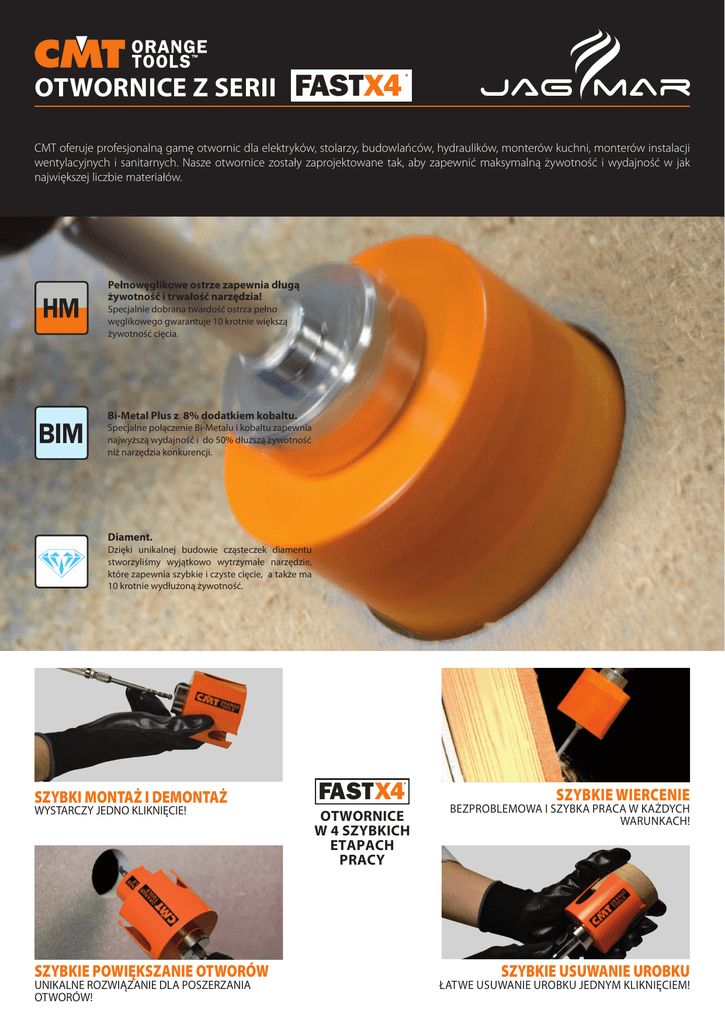 OTWORNICE Z SERII FASTX4 ® CMT oferuje profesjonalną gamę otwornic dla elektryków, stolarzy, budowlańców, hydraulików, monterów kuchni, monterów instalacji wentylacyjnych i sanitarnych. Nasze otwornice zostały zaprojektowane tak, aby zapewnić maksymalną żywotność i wydajność w jak największej liczbie materiałów. HM BIM Pełnowęglikowe ostrze zapewnia długą żywotność i trwałość narzędzia! Specjalnie dobrana twardość ostrza pełno węglikowego gwarantuje 10 krotnie większą żywotność cięcia. Bi-Metal Plus z 8% dodatkiem kobaltu. Specjalne połączenie Bi-Metalu i kobaltu zapewnia najwyższą wydajność i do 50% dłuższą żywotność niż narzędzia konkurencji. Diament. Dzięki unikalnej budowie cząsteczek diamentu stworzyliśmy wyjątkowo wytrzymałe narzędzie, które zapewnia szybkie i czyste cięcie, a także ma 10 krotnie wydłużoną żywotność. SZYBKI MONTAŻ I DEMONTAŻ WYSTARCZY JEDNO KLIKNIĘCIE! SZYBKIE POWIĘKSZANIE OTWORÓW UNIKALNE ROZWIĄZANIE DLA POSZERZANIA OTWORÓW! FASTX4 ® OTWORNICE W 4 SZYBKICH ETAPACH PRACY SZYBKIE WIERCENIE BEZPROBLEMOWA I SZYBKA PRACA W KAŻDYCH WARUNKACH! SZYBKIE USUWANIE UROBKU ŁATWE USUWANIE UROBKU JEDNYM KLIKNIĘCIEM! OTWORNICE UNIWESRALNE HM 10X 5X SERIA 550 DŁUŻSZA ŻYWOTNOŚĆ HM SZYBSZA PRACA Do materiałów: Zwiększona żywotność dzięki specjalnej budowie węglika. Ostrza tnące zostały wykonane z węglika o specjalnej budowie, która zapewnia wydłużoną żywotność narzędzia. Drewno Właściwe zabezpieczenie ostrzy. Dzięki zastosowaniu najnowszych technologii, udało się nam zabezpieczyć ostrza otwornic przed pękaniem, nawet przy pracy z bardzo twardymi materiałami. Cegła Tworzywa sztuczne Płytki ce- Okładzina Gazoberamiczne tynkowa ton I - Maksymalna głębokość pracy L - Wysokość całkowita otwornicy Corian® HPL I=52 L=63 D mm Drewno i MDF RPM* PCV i Włókno szklane RPM* Beton i Cegła RPM* Płytki RPM* Symbol 20 22 25 29 30 32 35 38 40 44 51 54 56 57 60 64 68 70 73 76 79 80 82 83 92 102 105 111 114 127 133 152 1.600 1.460 1.280 1.100 1.070 1.000 920 840 800 730 630 590 570 560 530 500 470 460 440 420 410 400 390 390 350 310 310 290 280 250 240 210 1.000 1.000 1.000 940 910 850 780 720 680 620 540 510 490 480 460 430 400 390 370 360 350 340 330 330 300 270 260 250 240 220 210 180 1.000 1.000 1.000 940 910 850 780 720 680 620 540 510 490 480 460 430 400 390 370 360 350 340 330 330 300 270 260 250 240 220 210 180 640 580 510 440 430 400 370 340 320 290 250 240 230 220 210 200 190 180 180 170 160 160 160 150 140 130 120 120 110 100 100 80 550-020 550-022 550-025 550-029 550-030 550-032 550-035 550-038 550-040 550-044 550-051 550-054 550-056 550-057 550-060 550-064 550-068 550-070 550-073 550-076 550-079 550-080 550-082 550-083 550-092 550-102 550-105 550-111 550-114 550-127 550-133 550-152 * optymalna ilość obrotów na minutę Opis Symbol Do otwornic uniwersalnych Ø20-30mm (25/32 “- 1-3/16”). Sześciokątny trzpień 8mm (5/16 ”) wiertło centrujące z HSS, całkowita długość 180mm (7-5/64 “). 550-HS1 Do otwornic uniwersalnych Ø32-152mm (1-1/4” - 6”). Sześciokątny trzpień 10mm (25/64 ”) wiertło centrujące z HSS, całkowita długość 180mm (7-5/64 “). 550-HS2 Do otwornic uniwersalnych Ø20-30mm (25/32 “- 1-3/16”). Sześciokątny trzpień 8mm (5/16 ”) wiertło centrujące z ostrzem z węglika spiekanego, całkowita długość 180mm (7-5/64 “). 550-HW1 Do otwornic uniwersalnych Ø32-152mm (1-1/4” - 6”). Sześciokątny trzpień 10mm (25/64 ”) wiertło centrujące z ostrzem z węglika spiekanego, całkowita długość 180mm (7-5/64 “). 550-HW2 Opis Do poszerzania otworu za pomocą dwóch różnych rozmiarów otwornic, w zakresie Ø20-30mm na trzpieniu 8mm jako otwornica prowadząca, oraz w zakresie Ø32152mm na trzpieniu10mm jako otwornica poszerzająca otwór. Sześciokątny trzpień 10mm (25/64”). Symbol 550-DB1 OTWORNICE BI-METAL PLUS 50% SERIA 551 DŁUŻSZA ŻYWOTNOŚĆ BIM Bi-Metal z 8% dodatkiem kobaltu. Specjalne połączenie Bi-Metalu i kobaltu zapewnia najwyższą wydajność i do 50% dłuższą żywotność niż narzędzia konkurencji. ZĘBY ROZWARTE NA BOKI Konstrukcja zęba. Idealnie opracowana geometria zębów zapewnia płynne cięcie, zapobiega zatykaniu otwornicy wiórami i zabezpiecza przed przegrzaniem narzędzia. Dzięki właściwemu ułożeniu zębów zminimalizowano tarcie dzięki czemu naszymi otwornicami pracuje się lżej, bez potrzeby dodatkowego nacisku na obrabiany materiał. Do materiałów: Stal nierdzewna Aluminium Cynk oraz miedź I - Maksymalna głębokość pracy L - Wysokość całkowita otwornicy I=38 L=45 D mm Metal RPM* Stal nierdzewna RPM* 16 19 20 22 25 27 29 30 32 35 38 40 43 44 48 51 54 57 60 64 68 70 73 76 79 83 86 89 92 102 108 127 133 140 168 550 470 440 400 350 330 310 300 280 250 230 220 210 200 180 170 160 160 150 140 130 130 120 120 110 105 105 100 95 85 80 70 65 65 55 270 230 220 200 170 160 150 140 140 120 110 110 100 100 90 85 80 75 70 70 65 60 60 55 55 50 50 50 45 45 40 35 35 30 25 PŁYN CHŁODZĄCY PŁYN CHŁODZĄCY Żeliwo RPM* Aluminium RPM* 370 310 290 270 230 220 200 190 180 170 150 150 140 130 120 110 110 100 95 90 80 80 80 75 70 70 65 65 60 55 55 45 800 670 640 580 510 470 440 430 400 370 340 320 300 290 270 250 240 220 210 205 185 185 180 170 165 155 150 145 140 130 120 90 45 40 35 90 85 75 „NA SUCHO” Symbol 551-016 551-019 551-020 551-022 551-025 551-027 551-029 551-030 551-032 551-035 551-038 551-040 551-043 551-044 551-048 551-051 551-054 551-057 551-060 551-064 551-068 551-070 551-073 551-076 551-079 551-083 551-086 551-089 551-092 551-102 551-108 551-127 551-133 551-140 551-168 TERPENTYNA * optymalna ilość obrotów na minutę Opis Symbol Do otwornic Bi-Metal Plus Ø16-30mm PLUS (5/8 “- 1-3/16”). Sześciokątny trzpień 8mm (5/16“) z wiertłem centrującym z HSS, całkowita długość 160mm (6-5/16”). 551-HS1 Do otwornic Bi-Metal Plus Ø32-168mm PLUS (1-1