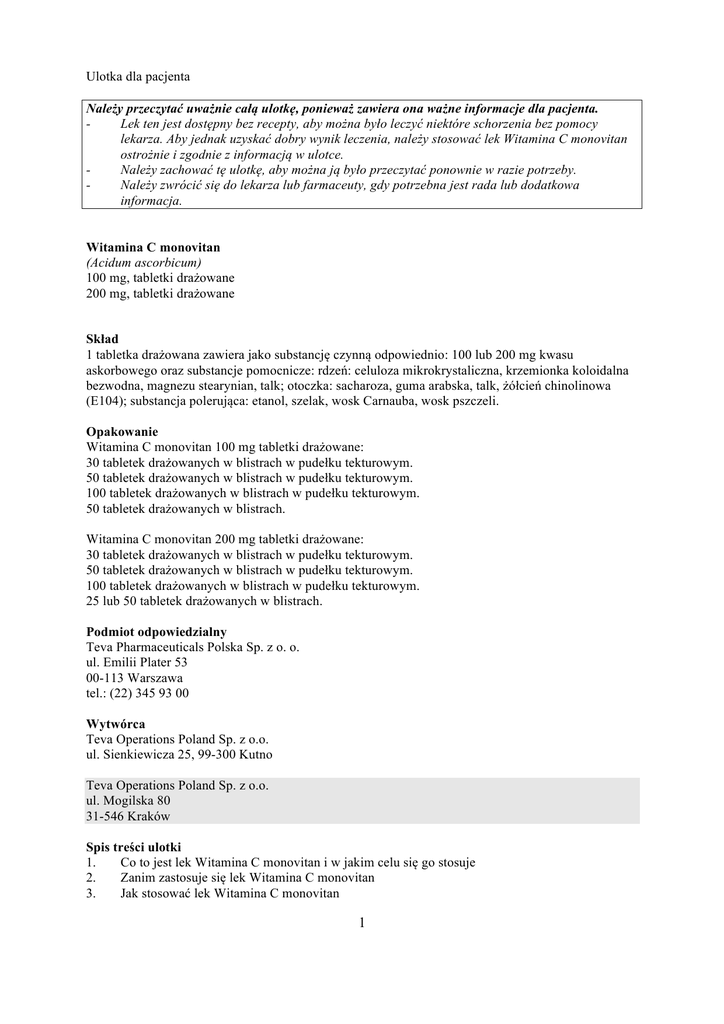 Ulotka dla pacjenta Należy przeczytać uważnie całą ulotkę, ponieważ zawiera ona ważne informacje dla pacjenta. Lek ten jest dostępny bez recepty, aby można było leczyć niektóre schorzenia bez pomocy lekarza. Aby jednak uzyskać dobry wynik leczenia, należy stosować lek Witamina C monovitan ostrożnie i zgodnie z informacją w ulotce. Należy zachować tę ulotkę, aby można ją było przeczytać ponownie w razie potrzeby. Należy zwrócić się do lekarza lub farmaceuty, gdy potrzebna jest rada lub dodatkowa informacja. Witamina C monovitan (Acidum ascorbicum) 100 mg, tabletki drażowane 200 mg, tabletki drażowane Skład 1 tabletka drażowana zawiera jako substancję czynną odpowiednio: 100 lub 200 mg kwasu askorbowego oraz substancje pomocnicze: rdzeń: celuloza mikrokrystaliczna, krzemionka koloidalna bezwodna, magnezu stearynian, talk; otoczka: sacharoza, guma arabska, talk, żółcień chinolinowa (E104); substancja polerująca: etanol, szelak, wosk Carnauba, wosk pszczeli. Opakowanie Witamina C monovitan 100 mg tabletki drażowane: 30 tabletek drażowanych w blistrach w pudełku tekturowym. 50 tabletek drażowanych w blistrach w pudełku tekturowym. 100 tabletek drażowanych w blistrach w pudełku tekturowym. 50 tabletek drażowanych w blistrach. Witamina C monovitan 200 mg tabletki drażowane: 30 tabletek drażowanych w blistrach w pudełku tekturowym. 50 tabletek drażowanych w blistrach w pudełku tekturowym. 100 tabletek drażowanych w blistrach w pudełku tekturowym. 25 lub 50 tabletek drażowanych w blistrach. Podmiot odpowiedzialny Teva Pharmaceuticals Polska Sp. z o. o. ul. Emilii Plater 53 00-113 Warszawa tel.: (22) 345 93 00 Wytwórca Teva Operations Poland Sp. z o.o. ul. Sienkiewicza 25, 99-300 Kutno Teva Operations Poland Sp. z o.o. ul. Mogilska 80 31-546 Kraków Spis treści ulotki 1. Co to jest lek Witamina C monovitan i w jakim celu się go stosuje 2. Zanim zastosuje się lek Witamina C monovitan 3. Jak stosować lek Witamina C monovitan 1 4. 5. 6. Możliwe działania niepożądane Przechowywanie leku Witamina C monovitan Inne informacje 1. Co to jest lek Witamina C monovitan i w jakim celu się go stosuje Lek Witamina C monovitan zawiera kwas askorbowy (witaminę C). Organizm ludzki nie wytwarza witaminy C, dlatego konieczne jest jej regularne dostarczanie w diecie. Witamina C jest niezbędna do prawidłowego funkcjonowania organizmu. Bierze udział w wielu procesach metabolicznych: między innymi uczestniczy w syntezie kolagenu, hormonów oraz wchłanianiu żelaza w przewodzie pokarmowym. Witamina C odgrywa ważną rolę jako przeciwutleniacz, zapobiega powstawaniu wolnych rodników i w rezultacie może zmniejszać ryzyko wystąpienia choroby nowotworowej, opóźniać rozwój miażdżycy oraz spowalniać procesy starzenia się organizmu. Lek Witaminę C monovitan stosuje się: w stanach niedoboru witaminy C (np. szkorbut); w stanach zwiększonego zapotrzebowania na witaminę C • przy zakażeniach wirusowych i bakteryjnych • w okresie rekonwalescencji • przy trudno gojących się ranach • przy intensywnym wysiłku fizycznym • przy długotrwałej gorączce • u osób palących • w stanach zaburzonej odporności organizmu w zapobieganiu niedoborom witaminy C (np. podczas stosowania diety eliminacyjnej). 2. Zanim zastosuje się lek Witamina C monovitan Nie należy stosować leku Witamina C monovitan, jeżeli występuje: nadwrażliwość na kwas askorbowy lub którykolwiek ze składników preparatu nie należy stosować dużych dawek witaminy C (powyżej 1 g na dobę) w kamicy nerkowej oraz w zaburzeniach metabolizmu żelaza. Zachować szczególną ostrożność stosując lek Witamina C monovitan: Kwas askorbowy należy stosować ostrożnie u pacjentów z hiperoksalurią (nadmierne wydalanie kwasu szczawiowego z moczem), niedoborem dehydrogenazy glukozo-6-fosforanowej, u osób ze skłonnością do tworzenia złogów mineralnych w układzie moczowym, u pacjentów z hemochromatozą, talasemią, anemią syderoblastyczną i cukrzycą. Witamina C stosowana w dawkach większych niż 400 mg na dobę może fałszować wyniki niektórych testów laboratoryjnych wykonywanych metodami oksydoredukcyjnymi (np. na obecność glukozy w moczu czy krwi utajonej w kale). Jeśli stwierdzono wcześniej u pacjenta nietolerancję niektórych cukrów, pacjent powinien skontaktować się z lekarzem przed przyjęciem leku. Lek może powodować reakcje alergiczne. Stosowanie leku Witamina C monovitan z jedzeniem i piciem: Lek Witamina C monovitan można zażywać niezależnie od posiłków. Ciąża: Przed zastosowaniem każdego leku należy poradzić się lekarza. Witamina C przenika przez barierę łożyska. W okresie ciąży witamina C nie powinna być stosowana w dawkach większych niż zalecane dzienne spożycie (80-100 mg na dobę). 2 Karmienie piersią: Przed zastosowaniem każdego leku należy poradzić się lekarza. Lek przenika do mleka matki. W okresie karmienia piersią witamina C nie powinna być stosowana w dawkach większych niż zalecane dzienne spożycie (80-100 mg na dobę). Prowadzenie pojazdów i obsługa maszyn: Witamina C monovitan nie wpływa na zdolność kierowania pojazdami mechanicznymi i obsługiwania urządzeń mechanicznych w ruchu. Stosowanie innych leków: Witamina C stosowana w dużych dawkach (powyżej 1000 mg) powoduje zakwaszenie moczu, w wyniku czego zmniejsza się wydalanie leków o charakterze kwasowym, a zwiększa wydalanie leków o charakterze zasadowym. Bardzo duże dawki witaminy C (od 10 g na dobę) mogą zmniejszać wchłanianie doustnych leków przeciwzakrzepowych z przewodu pokarmowego, może zmienić siłę i czas działania preparatów dikumarolu i warfaryny. Witamina C zwiększa wchłanianie żelaza z przewodu pokarmowego. Równoczesne podanie sulfonamidów i witaminy C może być przyczyną wytrącania się kryształów sulfonamidów w kwaśnym moczu. Nałogowe palenie tytoniu zmniejsza stężenie witaminy C we krwi.