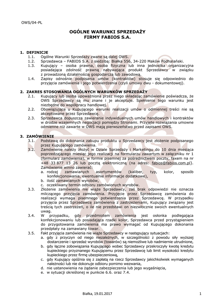OWS/04-PL OGÓLNE WARUNKI SPRZEDAŻY FIRMY FABIOS S.A. 1. DEFINICJE 1.1. Ogólne Warunki Sprzedaży zwane są dalej OWS. 1.2. Sprzedawca – FABIOS S.A. z siedzibą: Białka 556, 34-220 Maków Podhalański. 1.3. Kupujący – osoba prawna, osoba fizyczna lub inna jednostka organizacyjna posiadająca zdolność prawną nabywająca produkt Sprzedawcy w związku z prowadzoną działalnością gospodarczą lub zawodową. 1.4. Zapisy odnośnie podpisania umów (kontraktów) stosuje się odpowiednio do przyjęcia zamówienia i jego potwierdzenia (czyli umowy dwu - dokumentowej). 2. ZAKRES STOSOWANIA OGÓLNYCH WARUNKÓW SPRZEDAŻY 2.1. Kupujący lub osoba upoważniona przez niego składając zamówienie poświadcza, że OWS Sprzedawcy są mu znane i je akceptuje. Spełnienie tego warunku jest niezbędne do współpracy handlowej. 2.2. Obowiązujące u Kupującego warunki realizacji umów o odmiennej treści nie są akceptowane przez Sprzedawcę. 2.3. Sprzedawca dopuszcza zawieranie indywidualnych umów handlowych i kontraktów w drodze wzajemnych negocjacji pomiędzy Stronami. Przyjęte rozwiązania umowne odmienne niż zawarte w OWS mają pierwszeństwo przed zapisami OWS. 3. ZAMÓWIENIE 3.1. Podstawą do dokonania zakupu produktu u Sprzedawcy jest złożenie podpisanego przez Kupującego zamówienia. 3.2. Zamówienie należy złożyć w Dziale Sprzedaży i Marketingu do 10 dnia miesiąca poprzedzającego miesiąc jego realizacji na formularzu zawartym w załączniku nr 1 (formularz zamówienia), w formie pisemnej za pośrednictwem poczty, faxem na nr +48 33 877 13 26 lub pocztą elektroniczną (na adres: [email protected]). Zamówienie winno zawierać: a. rodzaj zamawianych asortymentów (kaliber, typ, kolor, sposób konfekcjonowania, ewentualnie informacje dodatkowe), b. ilość zamawianych wyrobów, c. oczekiwany termin odbioru zamówionych wyrobów. 3.3. Złożenie zamówienia nie wiąże Sprzedawcy, zaś brak odpowiedzi nie oznacza milczącego przyjęcia zamówienia. Przyjęcie przez Sprzedawcę zamówienia do realizacji wymaga pisemnego potwierdzenia przez Sprzedawcę. W przypadku przyjęcia przez Sprzedawcę zamówienia z zastrzeżeniami, Kupujący związany jest treścią tych zastrzeżeń, o ile nie przedstawi on niezwłocznie swoich ewentualnych uwag. 3.4. W przypadku, gdy przedmiotem zamówienia jest osłonka podlegająca konfekcjonowaniu lub posiadająca rzadki kolor, Sprzedawca przed przystąpieniem do przygotowania zamówienia ma prawo wymagać od Kupującego dokonania przedpłaty na zamawiany towar. 3.5. Fakt przyjęcia zamówienia nie wiąże Sprzedawcy w następujący sytuacjach: a. gdy z przyczyn od niego niezależnych, w szczególności z powodu siły wyższej dostarczenie i sprzedaż wyrobów (towarów) są niemożliwe lub nadmiernie utrudnione, b. gdy łączne zobowiązania Kupującego wobec Sprzedawcy przekroczyły kwotę kredytu kupieckiego przyznanego Kupującemu przez Sprzedawcę lub limit wysokości kredytu kupieckiego przez firmę ubezpieczeniową, c. gdy Kupujący opóźnia się z zapłatą na rzecz Sprzedawcy jakichkolwiek wymaganych należności lub nie dokonuje odbioru pomimo wezwania, d. nie ustanowienia na żądanie zabezpieczenia lub jego wygaśnięcia, e. w sytuacji określonej w punkcie 6.6. oraz 7.4. Białka, 19.01.2017 1 4. WARUNKI DOSTAWY: CZAS DOSTAWY, TRANSPORT, UBEZPIECZENIE, PRZEJŚCIE RYZYKA 4.1. Dostawa towaru odbywa się siłami Kupującego lub przy pomocy firm spedycyjnych na bazie FCA, miejsce wskazane, Polska (INCOTERMS 2000). 4.2. Czas dostawy wymieniony w potwierdzeniu zamówienia powinien być traktowany jako uzgodniony pomiędzy Stronami. Niedotrzymanie terminu dostawy przez Sprzedawcę uprawnia Kupującego do dochodzenia przysługujących mu praw jedynie wtedy, jeżeli Sprzedawca pomimo pisemnie uzgodnionych nowych terminów nadal nie realizuje dostawy. 4.3. Kupujący zobowiązany jest do odbioru wyrobu (towaru) lub jego przyjęcia, do 7 dni po powiadomieniu o jego dostępności w magazynach Sprzedawcy. W przypadku zaistnienia zwłoki w odbiorze Kupujący może zostać obciążony kosztami magazynowania. Sprzedawca zastrzega sobie również prawo odstąpienia od umowy w przypadku upływu ww. terminu. 4.4. Każda dostawa częściowa stanowi odrębną transakcję i może być oddzielnie fakturowana przez Sprzedawcę. 4.5. Wycofanie potwierdzonego zamówienia w całości lub części przez Kupującego może być tylko za zgodą Sprzedawcy. 5. CENA Cenę wyrobu (towaru) ustala się w oparciu o cenniki lub uzgodnienia obowiązujące w dniu potwierdzenia zamówienia. 6. PŁATNOŚĆ 6.1. Faktury Sprzedawcy są płatne w banku wymienionym na fakturze. Jeśli w umowie nie uzgodniono inaczej, to opłaty bankowe związane z płatnością pokrywa Kupujący. Zapłata powinna być dokonana na warunkach określonych w umowie. W przypadku zwłoki w zapłacie, niezależnie od przysługujących mu odsetek, Sprzedawca ma prawo wstrzymać i anulować pozostałe dostawy oraz obciążyć Kupującego udokumentowanymi kosztami. Sprzedawca zastrzega sobie prawo własności dostarczonych wyrobów (towarów) do momentu, kiedy uzyska za nie zapłatę w pełnej wysokości. 6.2. W przypadku, jeżeli w treści ustaleń Stron nie wskazano, czy dane ceny są cenami netto czy brutto, zawsze uważać się będzie, że są to ceny netto, do których doliczony zostanie podatek VAT w obowiązujących w danym czasie wysokości i stawce dla danego wyrobu (towaru). 6.3. Zapłata zostanie dokonana w terminie wskazanym w umowie lub fakturze lub fakturze pro-forma, zgodnie z ustaleniami Stron, w wypadku zaś braku takich ustaleń – w terminie nie dłuższym niż 14 dni od dnia wydania Kupującemu wyrobu (towaru). 6.4. Jeśli Kupujący nie wykona swoich zobowiązań w ciągu sześciu tygodni od ustalonego terminu, Sprzedawca ma prawo pisemnie odstąpić od umowy bez uprzedniego kierowania do Kupującego jakichkolwiek dodatkowych wezwań. 6.5. Za dzień dokonania zapłaty uważać si