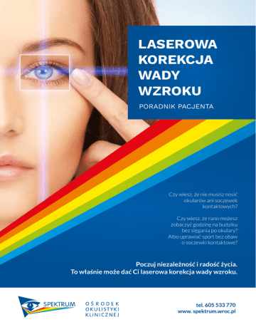 LASEROWA KOREKCJA WADY WZROKU PORADNIK PACJENTA Czy wiesz, że nie musisz nosić okularów ani soczewek kontaktowych? Czy wiesz, że rano możesz zobaczyć godzinę na budziku bez sięgania po okulary? Albo uprawiać sport bez obaw o soczewki kontaktowe? Poczuj niezależność i radość życia. To właśnie może dać Ci laserowa korekcja wady wzroku. tel. 605 533 770 www. spektrum.wroc.pl Czy laserowa korekcja wad wzroku może pomóc mi widzieć bez okularów i soczewek? Konsultacja okulistyczna u naszych specjalistów pozwoli znaleźć najlepsze rozwiązanie dla twoich oczu. Jednym z nich może być korekcja laserowa. Jesteś dobrym kandydatem przy spełnieniu większości kryteriów jeśli: - masz ponad 23 lata - w ciągu ostatniego roku ostrość widzenia nie zmieniła się - cieszysz się dobrym stanem zdrowia - nie lubisz nosić okularów ani soczewek kontaktowych - pragniesz niezależności - jesteś aktywny fizycznie i chcesz być niezależny od okularów - martwisz się, że możesz funkcjonować tylko z ich pomocą - uważasz, że bez okularów ładniej wyglądasz Umów się na wizytę konsultacyjną WWW. SPEKTRUM.WROC.PL | TEL. 605 533 770 Wyobraź sobie wolność. Budzisz się rano, otwierasz oczy i widzisz świat bez potrzeby sięgania po okulary. Praca możesz bardziej skupić się na pracy, nie przeszkadza ci suchość i zaczerwienienie oczu spowodowane noszeniem szkieł kontaktowych jesteś całkowicie niezależny od okularów czy szkieł kontaktowych Rodzina możesz wstać do dziecka w nocy i uspokoić je bez konieczności szukania okularów możesz sprawdzić godzinę na zegarku i postanowić o porannej kilkuminutowej drzemce bez konieczności szukania okularów Sport i wypoczynek koniec z zaparowanymi lub zniszczonymi okularami i zgubionymi soczewkami jedyne okulary, których używasz to okulary przeciwsłoneczne, gogle i do pływania Koszty oszczędzasz przy zakupie okularów, szkieł korekcyjnych i płynów pielęgnacyjnych Dlaczego źle widzę? Oczy pracują jak aparat fotograficzny, załamując promienie światła w taki sposób, aby skupić je na siatkówce i w ten sposób uzyskać czysty, wyraźny obraz. Za większą część mocy skupiającej światło odpowiedzialna jest rogówka będąca przeźroczystą, ochronną warstwą gałki ocznej. Wystarczy minimalne zaburzenie kształtu rogówki, a pojawią się kłopoty z nieostrym widzeniem. Rodzaje wad wzroku Krótkowzroczność Obraz obiektu położonego w dali jest nieostry. Powodem takiego widzenia jest skupianie promieni świetlnych przed siatkówką. Przyczyną jest zbyt długa gałka oczna lub zbyt wypukła rogówka. Nadwzroczność Obraz przedmiotu oglądanego z bliska jest nieostry. Powodem takiego widzenia jest to, że promienie świetlne skupiają się za siatkówką. Przyczyną jest zbyt krótka gałka oczna lub zbyt płaska rogówka. Astygmatyzm Widzenie przedmiotów jest zniekształcone i zamazane. Dotyczyć to może obrazów oglądanych zarówno z daleka jak i z bliska. Występuje wtedy, gdy rogówka ma kształt zbliżony bardziej do piłki do rugby, niż do kuli. Starczowzroczność Jest wynikiem fizjologicznego procesu twardnienia i spadku elastyczności soczewki. Większość ludzi po 45. roku życia zauważa konieczność odsuwania czytanego tekstu coraz bardziej od oczu. Tego typu zaburzenie nie kwalifikuje się do laserowej korekcji wzroku. Jakie są metody leczenia? Najlepszą metodę zaproponuje lekarz podczas badania kwalifikacyjnego. Różnią się one sposobem postępowania z rogówką. Chirurgia Refrakcyjna Rogówki Sposób wykonania LASIK femto LASIK LASEK EBK Czas gojenia po zabiegu Dolegliwości po zabiegu Do wytworzenia płatka użyte jest sterowane komputerowo mechaniczne ostrze. Następnie rogówka modelowana jest przez laser eximerowy a płatek przyłożony na swoje miejsce. Niewielki dyskomfrot w pierwszej po zabiegu. Do kilku miesięcy może utrzymać się suchość oka. Do wytworzenia płatka wykorzystuje się femtosekundowy laser sterowany komputerowo. Następnie rogówka modelowana jest przez laser eximerowy, a płatek przyłożony na swoje miejsce. Dyskomfort przez kilka godzin po zabiegu. Niewielkie dolegliwości związane z suchością oka. Nabłonek rogówki zmiękcza się chemicznie a następnie usuwa mechanicznie. Rogówka modelowana jest przez laser eximerowy. Przez 2-3 dni po zabiegu utrzymuje się wrażliwość na światło, uczucie ciała obcego i łzawienie oczu. Nabłonek rogówki usuwa się mechanicznie bez konieczności zmiękczania chemicznego. Rogówka modelowana jest przez laser eximerowy. Przez 2-3 dni dyskomfort i uczucie piasku pod powiekami. Powrót do pracy* 1 tydzień 1 tydzień 4 tygodnie 3-4 tygodnie *Podane okresy są orientacyjnym czasem niezdolności do pracy. Każdemu pacjentowi zalecamy jednak 1 miesiąc zwolnienia. Dodatkowe możliwości korekcji krótkowzroczności Chirurgia Refrakcyjna Soczewki DOSZCZEPIENIE SOCZEWKI FAKIJNEJ REFRAKCYJNA WYMIANA SOCZEWKI Niektórzy pacjenci nie mogą zostać zakwalifikowani do chirurgii refrekcyjnej wykonywanej na rogówce ze względu na jej anatomię np. zbyt cienką rogówkę lub bardzo wysoką wadę. W takich przypadkach można wykonać zabieg polegający na doszczepieniu przed własną soczewkę dodatkowej – sztucznej. Pacjenci z początkowymi zmianami zaćmowymi w obrębie soczewki, mogą w czasie jednego zabiegu usunąć problem zaćmy i wady wzroku! Uwaga! Pacjent zachowuje możliwość własnej akomodacji (patrzenia zarówno na bliskie jak i dalekie przedmioty bez konieczności zakładania okularów), która z wiekiem będzie się zmieniać. W każdym przypadku jest możliwość usunięcia soczewki i powrót do stanu przed operacją. Co istotne, podczas zabiegu nie są dokonywane żadne nieodwracalne zmiany w strukturze oka. Obecnie dostępne soczewki wieloogniskowe pozwolą na dobre widzenie zarówno przedmiotów dalekich i bliskich. Soczewki wewnątrzgałkowe z filtrem żółtym pozwalają na ochron
