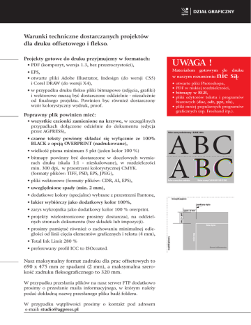 DZIAŁ GRAFICZNY Warunki techniczne dostarczanych projektów dla druku offsetowego i flekso. Projekty gotowe do druku przyjmujemy w formatach: UWAGA ! •PDF (kompozyt, wersja 1.3, bez przezroczystości), Materiałem •EPS, •otwarte pliki Adobe Illustrator, Indesign (do wersji CS5) i Corel DRAW (do wersji X4), w naszym rozumieniu Poprawny plik powinien mieć: •czarne teksty powinny składać się wyłącznie ze 100% BLACK z opcją OVERPRINT (nadrukowane), •wielkość pisma minimum 5 pkt (jeden kolor 100 %) •bitmapy powinny być dostarczone w docelowych wymiarach druku (skala 1:1 - nieskalowane), w rozdzielczości min. 300 dpi, w przestrzeni kolorystycznej CMYK. (formaty plików: TIFF, PSD, EPS, JPEG), •pliki wektorowe (formaty plików: CDR, AI, EPS), •uwzględnione spady (min. 2 mm), ABC BC A B C ABC Kolor czarny bez nadruku punktury cięcia •zarys wykrojnika jako dodatkowy kolor 100 % overprint. spad = 2 mm spad = 2 mm •projekty wielostronicowe prosimy dostarczać, na oddzielnych stronach dokumentu (bez składek lub impozycji). linia cięcia W przypadku wątpliwości prosimy o kontakt pod adresem e-mail: [email protected] krawędź papieru W przypadku przesłania plików na nasz serwer FTP dodatkowo prosimy o przesłanie maila informacyjnego, w którym należy podać dokładną nazwę przesłanego pliku badź folderu. linia cięcia •prosimy pamiętać również o zachowaniu minimalnej odległości od linii cięcia elementów graficznych i tekstu (4 mm), Nasz maksymalny format zadruku dla prac offsetowych to 690 x 475 mm ze spadami (2 mm), a maksymalna szerokość zadruku fleksograficznego to 320 mm. Kolor czarny C:80 M:80 Y:80 K:100 krawędź papieru •lakier wybiórczy jako dodatkowy kolor 100%, •preferowany profil ICC to ISOcoated. druku nie są: Kolor czarny nadrukowany - BLACK 100% •dodatkowe kolory (specjalne) wybrane z przestrzeni Pantone, •Total Ink Limit 280 % do •otwarte pliki Photoshopa, •PDF w niskiej rozdzielczości, •bitmapy w RGB, •pliki edytorów tekstu i programów biurowych (doc, odt, ppt, xls), •pliki mniej popularnych programów graficznych (np. Freehand itp.). •w przypadku druku flekso pliki bitmapowe (zdjęcia, grafiki) i wektorowe muszą być dostarczone oddzielnie - niezależnie od finalnego projektu. Powinien byc również dostarczony wzór kolorystyczny wydruk, proof. •wszystkie czcionki zamienione na krzywe, w szczególnych przypadkach dołączone odzielnie do dokumentu (edycja przez AGPRESS), gotowym format dokumentu
