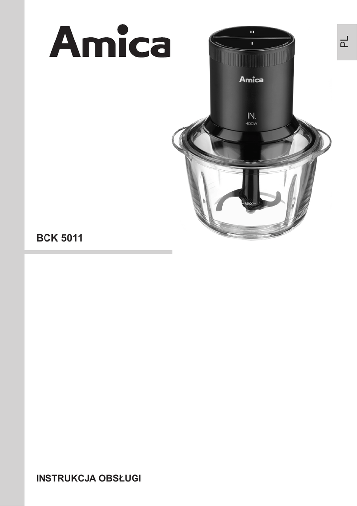 PL BCK 5011 INSTRUKCJA OBSŁUGI PL 8 7 1 2 3 4 5 6 1 2 SZANOWNI PAŃSTWO! Urządzenie marki Amica to połączenie wyjątkowej łatwości obsługi i doskonałej efektywności. Każde urządzenie przed opuszczeniem fabryki zostało dokładnie sprawdzone pod względem bezpieczeństwa i funkcjonalności. Prosimy Państwa o uważną lekturę instrukcji obsługi przed uruchomieniem urządzenia. Poniżej znajdują się objaśnienia dotyczące symboli występujących w niniejszej instrukcji: Ważne informacje dotyczące bezpieczeństwa użytkownika urządzenia oraz prawidłowej jego eksploatacji. i Zagrożenia wynikające z niewłaściwego postępowania z urządzeniem oraz czynnościach, które może wykonać jedynie wykwalifikowana osoba, na przykład z serwisu producenta. Wskazówki związane z użytkowaniem sprzętu. Informacje dotyczące ochrony środowiska naturalnego. Zakaz wykonywania pewnych czynności przez użytkownika. SPIS TREŚCI DANE TECHNICZNE WSKAZÓWKI DOTYCZĄCE BEZPIECZEŃSTWA UŻYTKOWANIA USUWANIE / ZŁOMOWANIE ZUŻYTEGO SPRZĘTU OBSŁUGA CZYSZCZENIE GWARANCJA, OBSŁUGA POSPRZEDAŻNA DANE TECHNICZNE Typ BCK 5011 Napięcie znamionowe 220-240V ~50 Hz Moc znamionowa 400W Ostrze rozdrabniające + osłona Tak / 2 szt Ostrze do kruszenia lodu Tak / 1 szt Pokrywa misy Tak Misa szklana Tak / 1l Mieszadło do ubijania Tak / 1 szt Zabezpieczenie przed uruchomieniem bez pokrywy Tak Przewód zasilający 1m Urządzenie przeznaczone jest wyłącznie do użytku domowego. Producent zastrzega sobie możliwość dokonywania zmian niewpływających na działanie urządzenia. 3 3 4 6 7 8 9 PL GRATULUJEMY WYBORU SPRZĘTU MARKI AMICA WSKAZÓWKI DOTYCZĄCE BEZPIECZEŃSTWA UŻYTKOWANIA PL i Uwaga! Aby zminimalizować ryzyko powstania pożaru, porażenia prądem lub uszkodzenia ciała: Uważnie przeczytaj tą instrukcję przed użytkowaniem urządzenia. Dzieci nie zdają sobie sprawy z niebezpieczeństw, które mogą powstać podczas używania urządzeń elektrycznych; dlatego trzymaj urządzenie poza zasięgiem dzieci. Nie zanurzaj korpusu urządzenia w wodzie lub innych cieczach. Zanurzenie w wodzie może spowodować porażenie prądem elektrycznym. W przypadku zalania wodą zewnętrznych elementów urządzenia, przed ponownym włączeniem urządzenia do sieci dokładnie je wysusz. Nie dotykaj mokrych powierzchni mających kontakt z podłączonym do zasilania urządzeniem, należy natychmiast odłączyć je od zasilania. Nie używaj urządzenia, jeżeli wykazuje ono jakiekolwiek oznaki uszkodzenia przewodu przyłączeniowego lub jeżeli urządzenie zostało upuszczone na podłogę. Po użyciu zawsze wyciągaj wtyczkę z gniazdka a także w przypadku jakiegokolwiek niewłaściwego działania, przed czyszczeniem lub przed wymianą akcesoriów. Przy wyciąganiu wtyczki z gniazdka ściennego nigdy nie ciągnij za przewód tylko za wtyczkę jednocześnie trzymając drugą ręką gniazdko sieciowe. Urządzenie jest wykonane w II klasie ochrony przeciwporażeniowej. Nie próbuj usuwać żadnych części obudowy. Aby uniknąć uszkodzenia przewodu zasilającego nie umieszczaj go ponad ostrymi krawędziami, ani w pobliżu gorących powierzchni. Nie wystawiaj urządzenia na deszcz lub wilgoć i nie używaj urządzenia na zewnątrz. Nie obsługuj urządzenia mokrymi rękoma. Jeżeli przewód sieciowy lub wtyczka ulegną uszkodzeniu, to powinny one być wymienione przez specjalistyczny zakład naprawczy w celu uniknięcia zagrożenia. 4 Używanie akcesoriów, które nie zostały dostarczone wraz z produktem może doprowadzić do uszkodzenia urządzenia. Nigdy nie stawiaj urządzenia na gorących powierzchniach. Należy zachować ostrożność przy myciu akcesoriów. Nigdy nie zostawiaj urządzenia podłączonego do sieci bez nadzoru. Niniejszy sprzęt nie jest przeznaczony do użytkowania przez osoby (w tym dzieci) o ograniczonej zdolności fizycznej, czuciowej lub psychicznej, lub osoby o braku doświadczenia lub znajomości sprzętu, chyba że odbywa się to pod nadzorem lub zgodnie z instrukcją użytkowania sprzętu, przekazaną przez osoby odpowiadające za ich bezpieczeństwo. Należy zwracać uwagę na dzieci, by nie bawiły się urządzeniem. Wyciągaj wtyczkę z gniazda sieciowe przed zmianą akcesoriów. To urządzenie może być używane przez dzieci w wieku 8 lat i starsze, przez osoby o ograniczonej zdolności fizycznej, czuciowej lub psychicznej oraz osoby o braku doświadczenia lub znajomości sprzętu, gdy są one nadzorowane lub zostały poinstruowane na temat korzystania z urządzenia w sposób bezpieczny i znają zagrożenia związane z użytkowaniem urządzenia. Dzieci nie powinny bawić się urządzeniem. Czyszczenie i konserwacja urządzenia nie powinna być wykonywania przez dzieci chyba że ukończyły 8 lat i są nadzorowane przez odpowiednią osobę. Powierzchnia na której jest użytkowane urządzenie powinna być wypoziomowana czysta i sucha. i Aby włączyć urządzenie naciśnij i przytrzymaj włącznik (Rys. 1 poz. 7 / 1 poz. 8). Aby wyłączyć silnik urządzenia zwolnij przeprzycisk (Rys. 1 poz. 7 / 1 poz. 8). Całkowite wyłączenie urządzenia jest możliwe poprzez odłączenie urządzenia od zasilania. Nie używaj urządzenia w połączeniu z gotującą się żywnością. 5 PL WSKAZÓWKI DOTYCZĄCE BEZPIECZEŃSTWA UŻYTKOWANIA WSKAZÓWKI DOTYCZĄCE BEZPIECZEŃSTWA UŻYTKOWANIA PL W przypadku zablokowania elementów rozdrabniających / miksujących, przed usunięciem blokujących składników, wyciągnij wtyczkę z gniazdka. Zachowaj szczególną ostrożność. Elementy rozdrabniające są bardzo ostre. Podczas pracy urządzenia nie dotykaj elementów mieszających lub rozdrabniających, zwróć szczególną uwagę na długie włosy i części garderoby. Niektóre elementy zestawu są wyposażone w ostre noże, używając ich zachowaj szczególną ostrożność. Nie przekraczaj czasu pracy oraz ilości produktów podanych w tabeli przy przygotowywaniu. Nie miksuj bez przerwy 